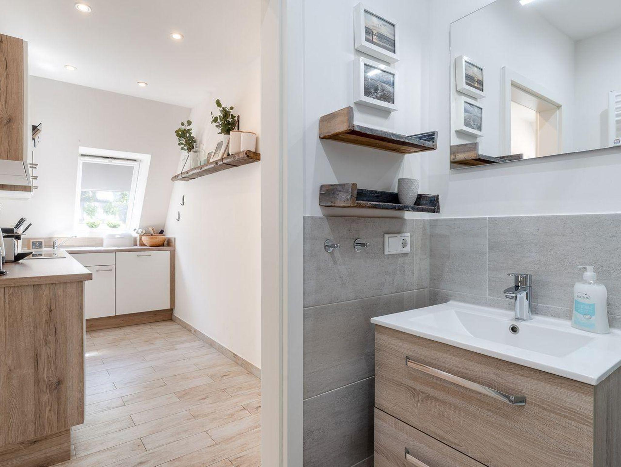 Das Badezimmer der Feinen Butze bietet eine Dusche, ein Waschbecken sowie ein WC. Selbstverständlich sind auch ein Haartrockner und ein Spiegel vorhanden, sodass Sie sich nach einem entspannenden Bad frisch machen können. Zudem ist die Unterkunft ein Nichtraucherobjekt und bietet eine angenehme Atmosphäre ohne störende Gerüche.