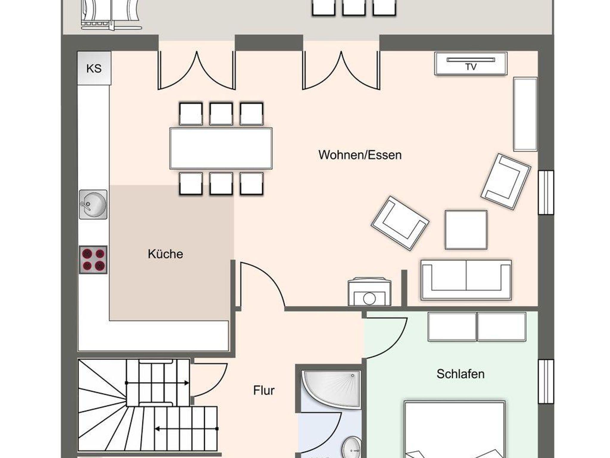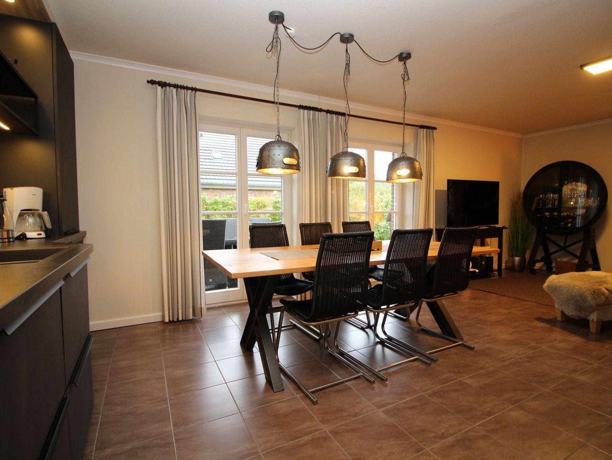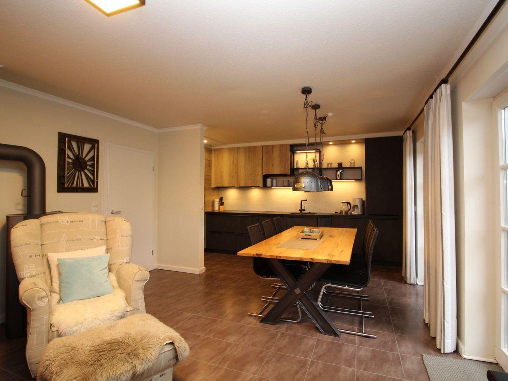Im Erdgeschoss befindet sich der Wohnraum mit einer offenen Küche und einem gemütlichen Essbereich. Die Küche ist mit hochwertigen Geräten voll ausgestattet.