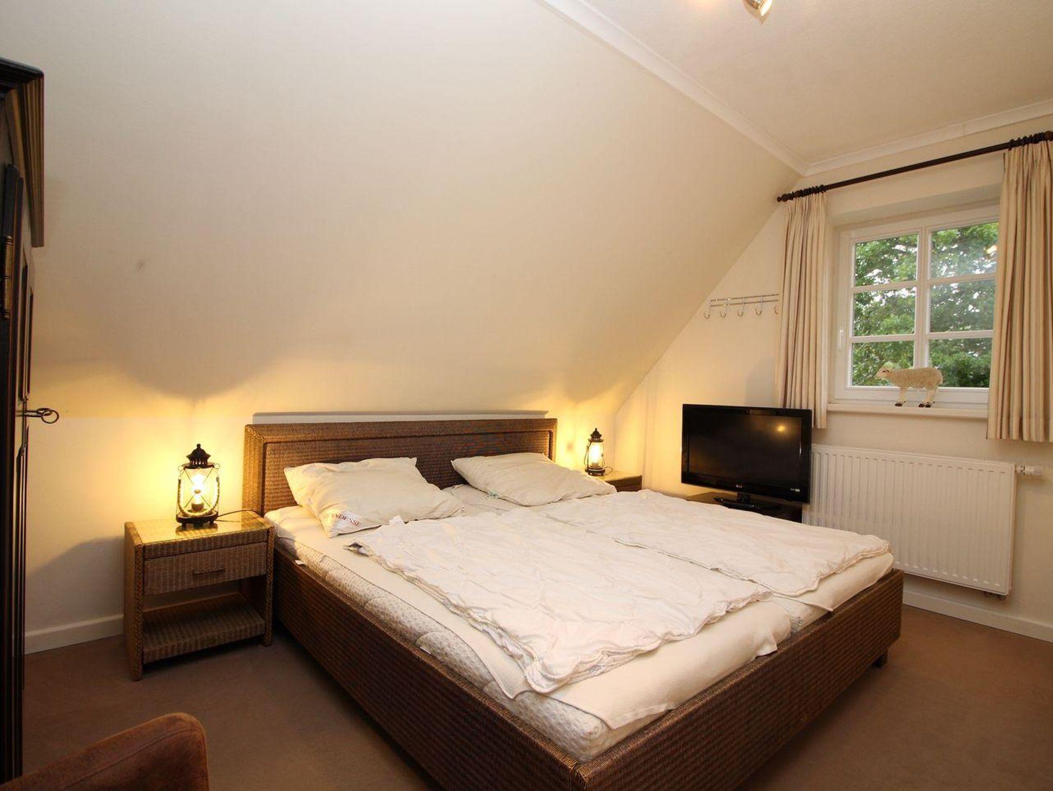 Über eine Holztreppe im Flur gelangt man in das Obergeschoss mit zwei Schlafzimmern. Eines verfügt über ein 180er Bett mit TV und das andere über 2 x 90er Einzelbetten. Außerdem ist im Obergeschoss ein Duschbad.