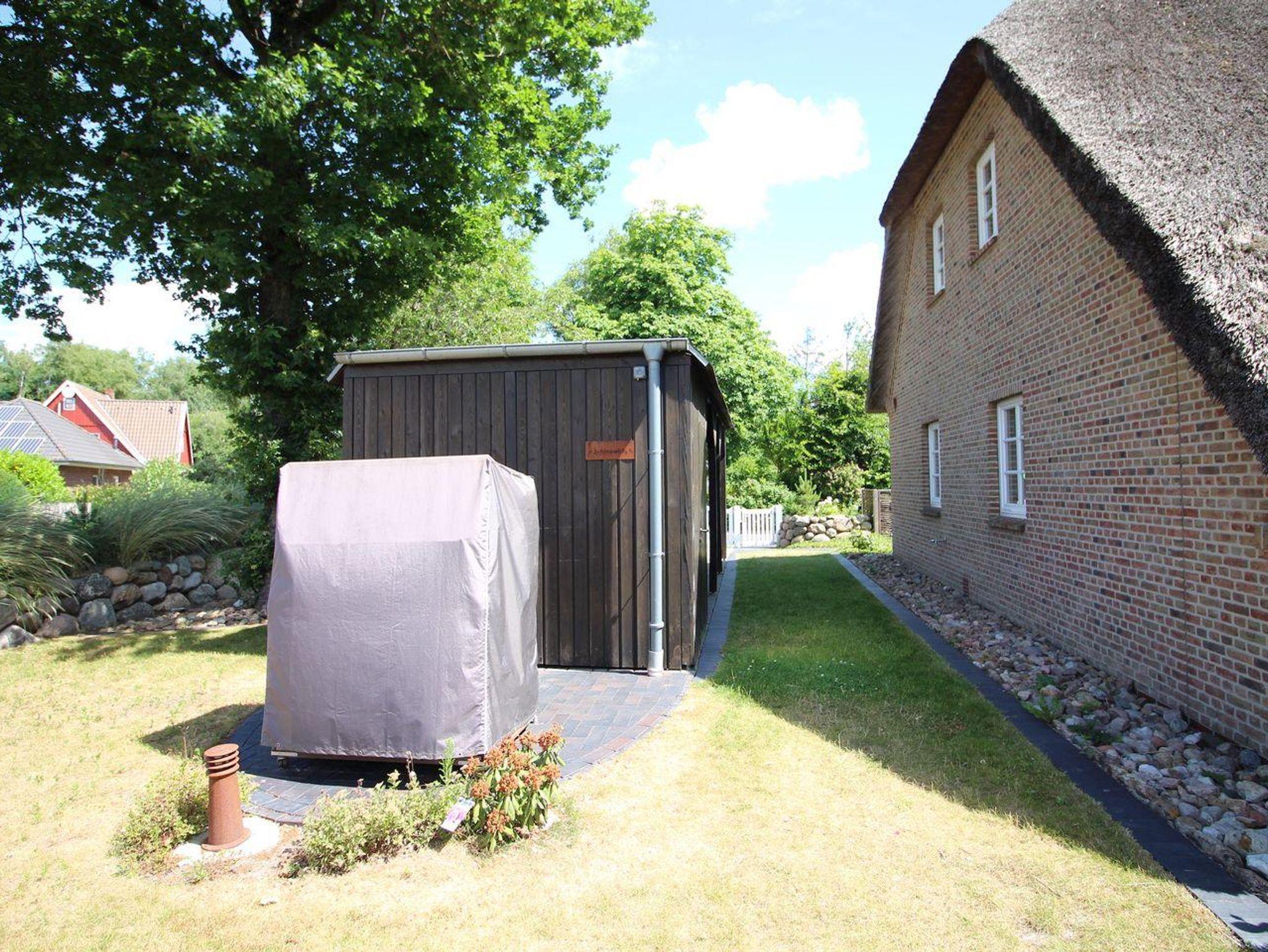 Gemütliche Reetdachhaushälfte in St. Peter-Ording mit Garten, Terrasse und Strandkorb für erholsamen Urlaub.