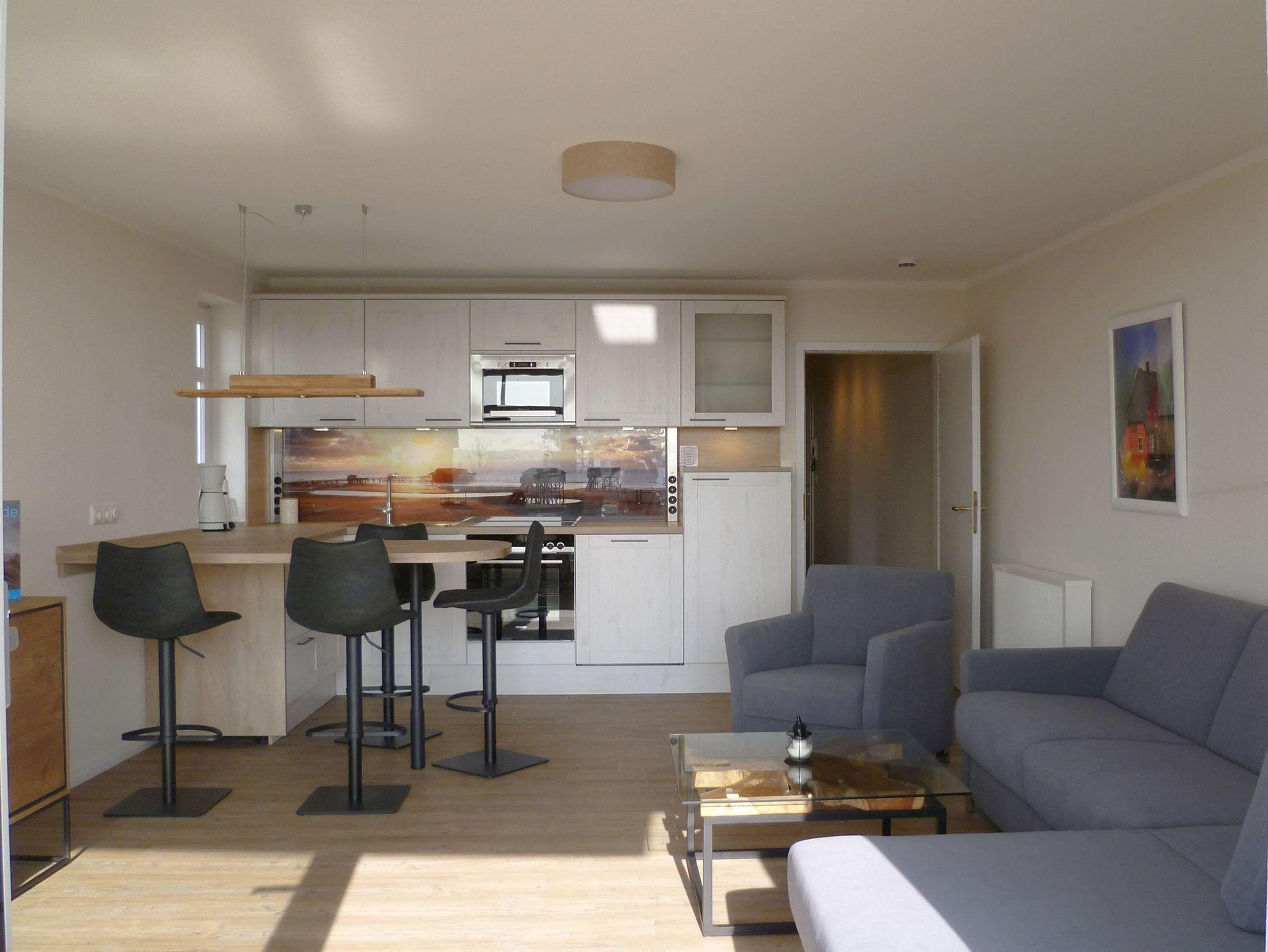 Modernes, luxuriöses Appartement mit Meerblick und Strandkorb in St. Peter-Ording für erholsamen Familienurlaub.