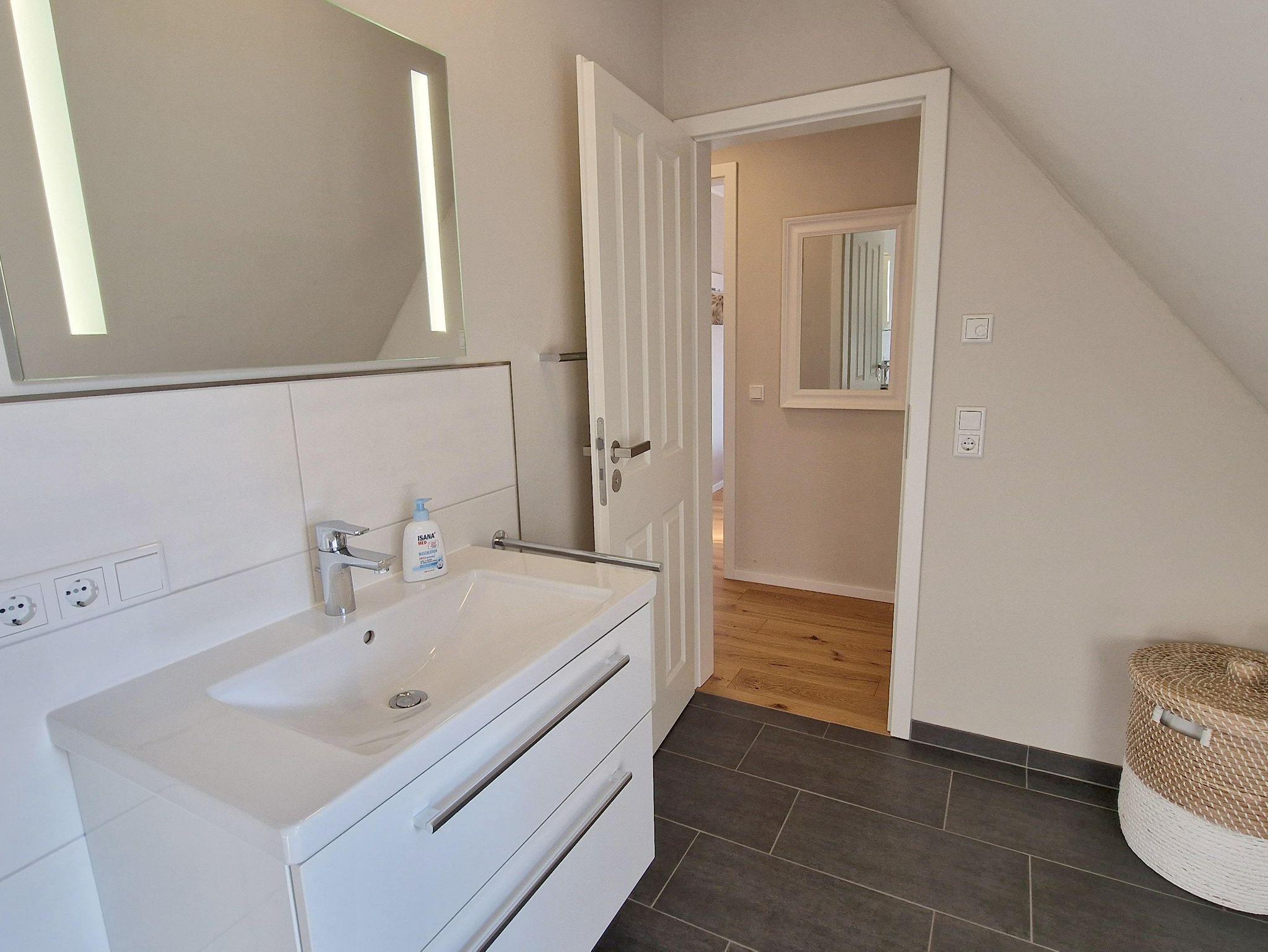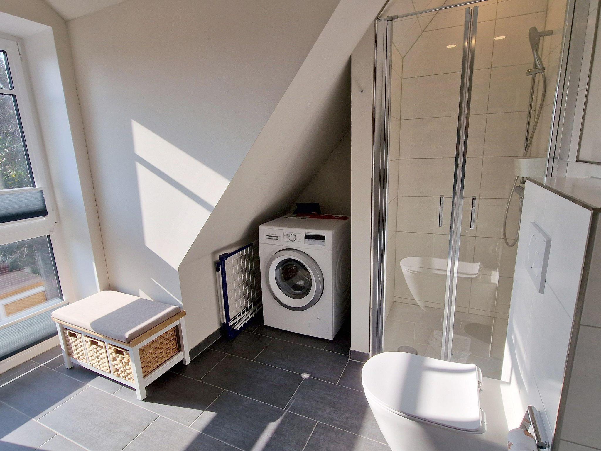 Bad: begehbare Dusche, WC, Wachbecken, Spiegel, Ablage, Waschmaschine,Wäscheständer.