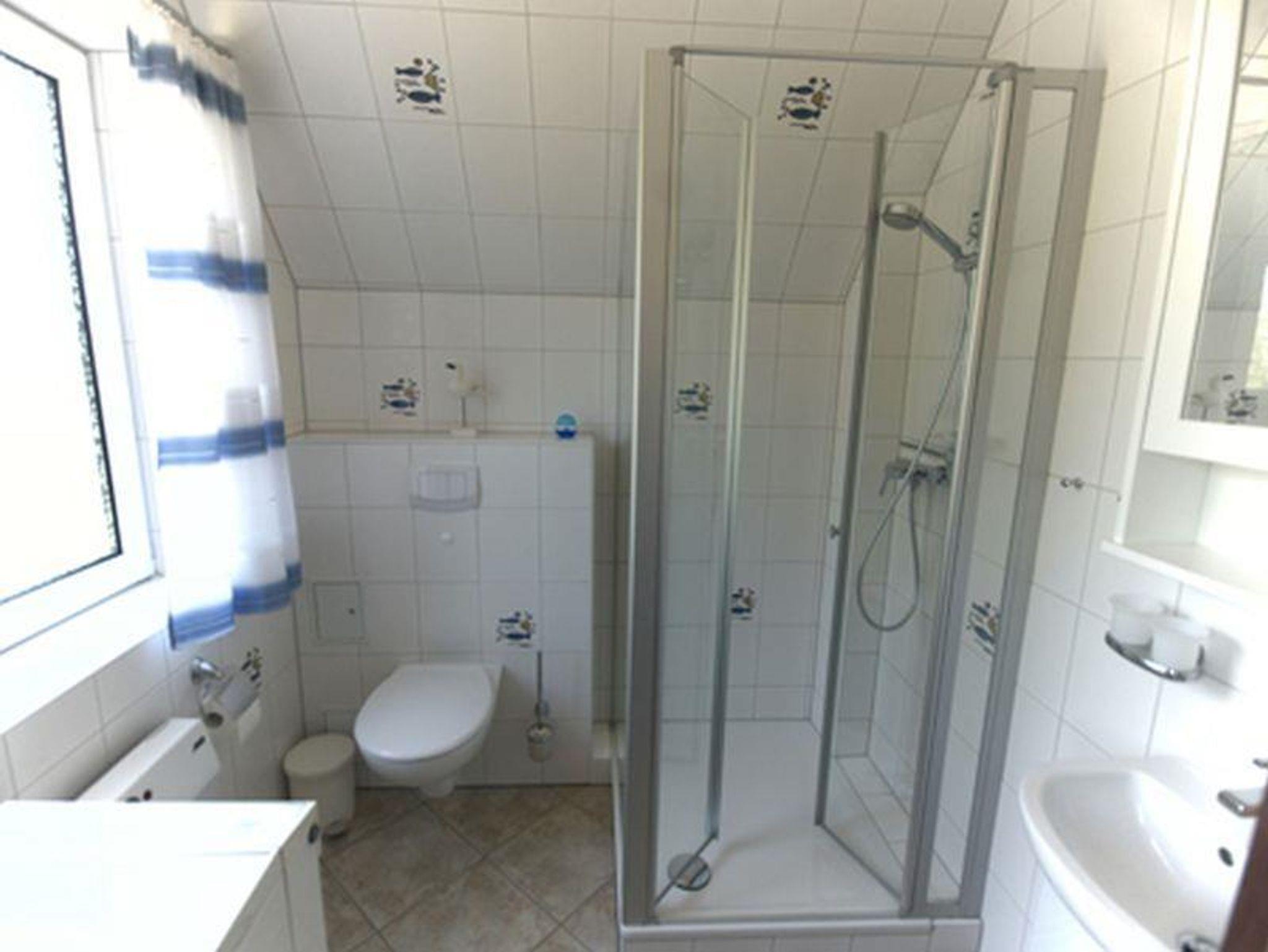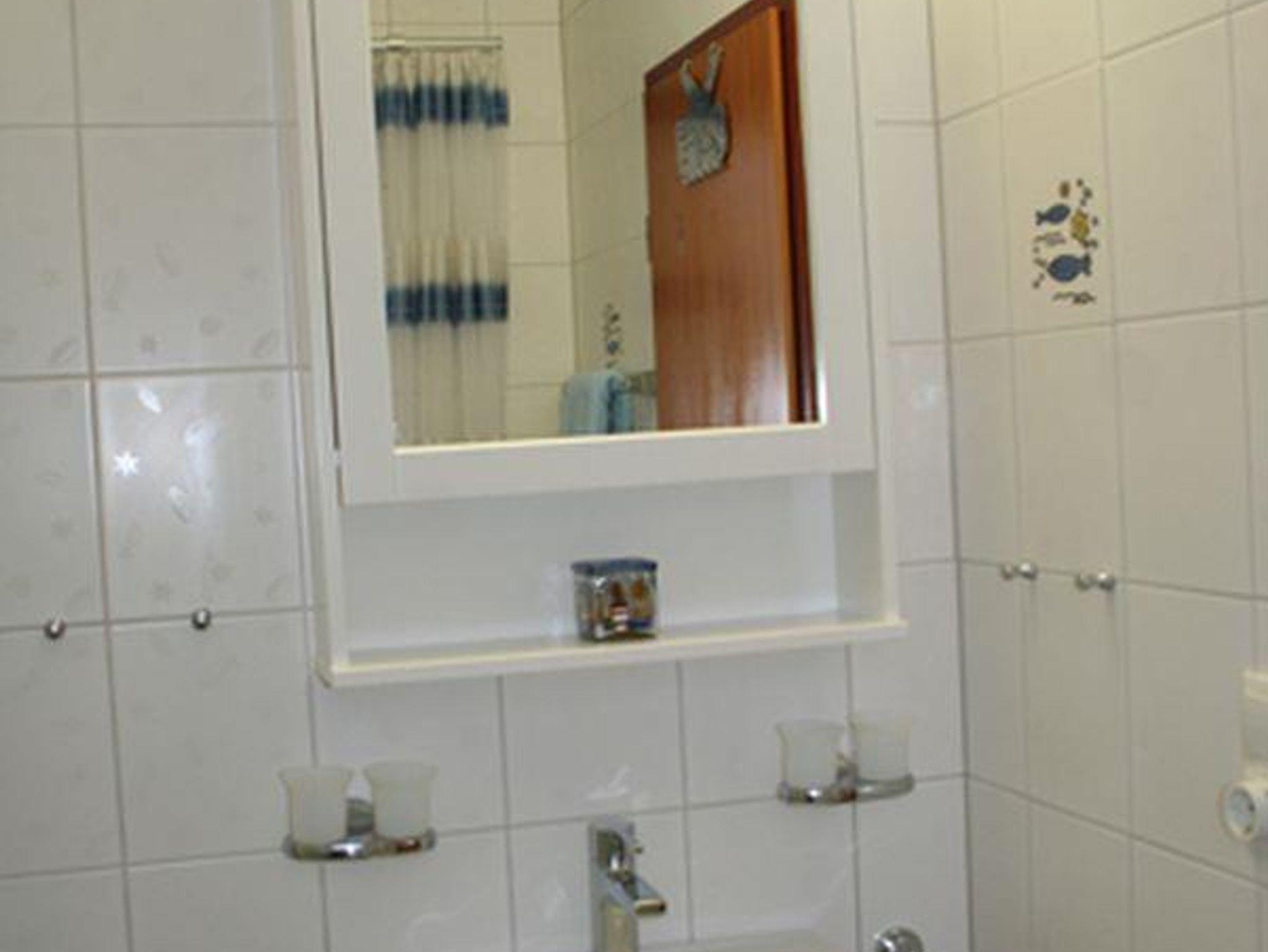 Bad: Duschkabine, Waschbecken, WC, Spiegelschrank, Waschmaschine,