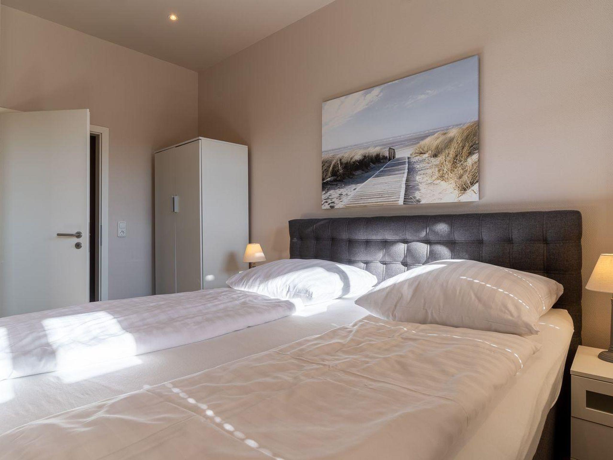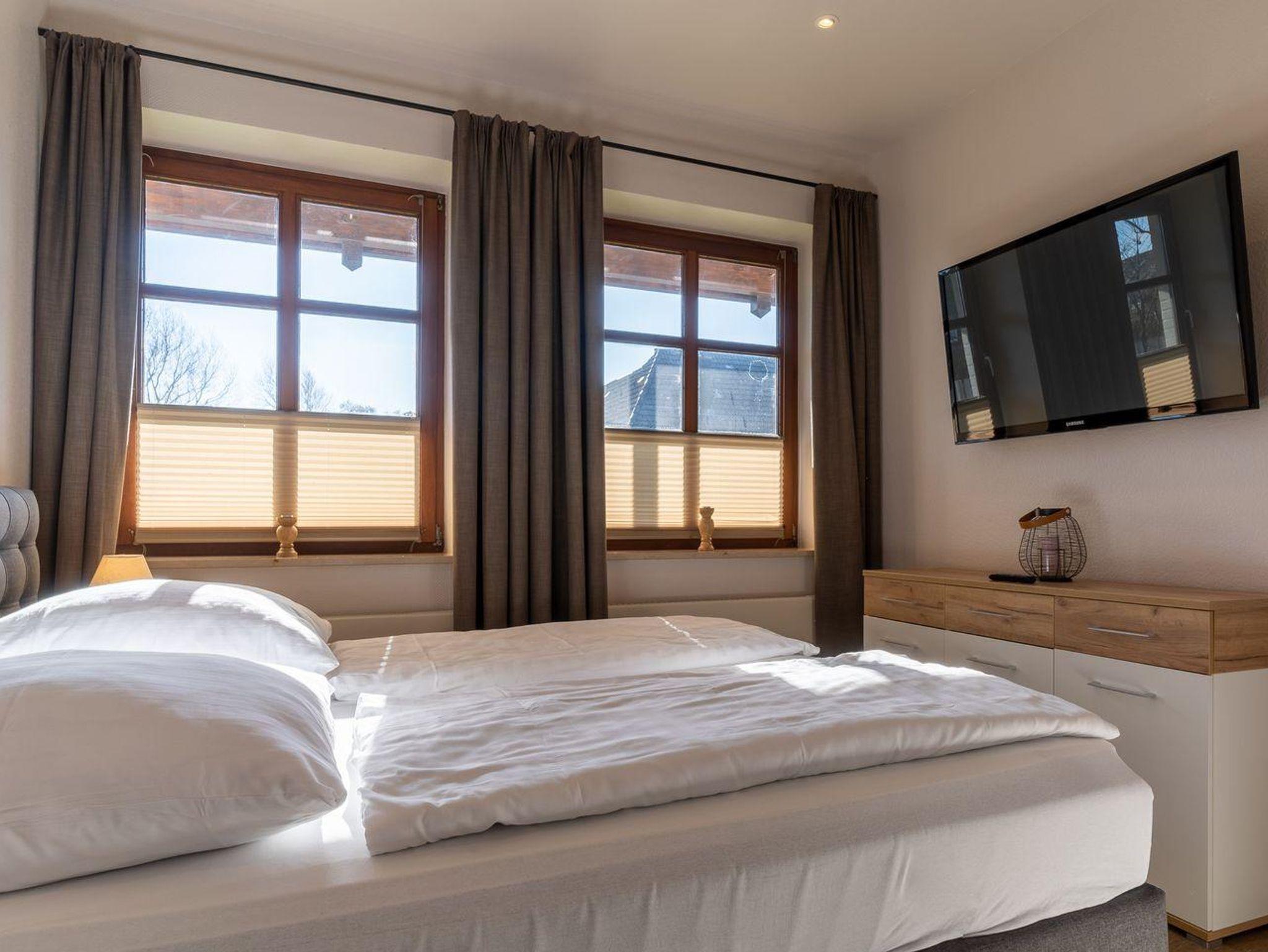 Die drei Schlafzimmer sind jeweils mit einem Boxspringbett und eines mit TV ausgestattet. Die Kleiderschränke gewähren Ihnen hinreichend Ablageflächen.