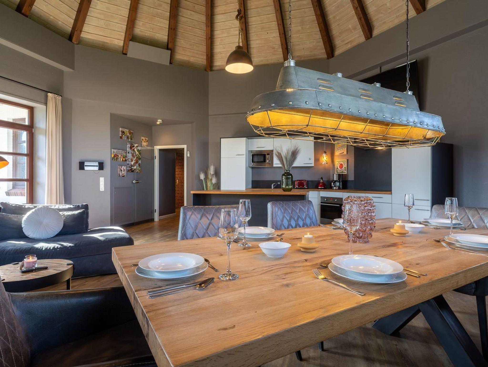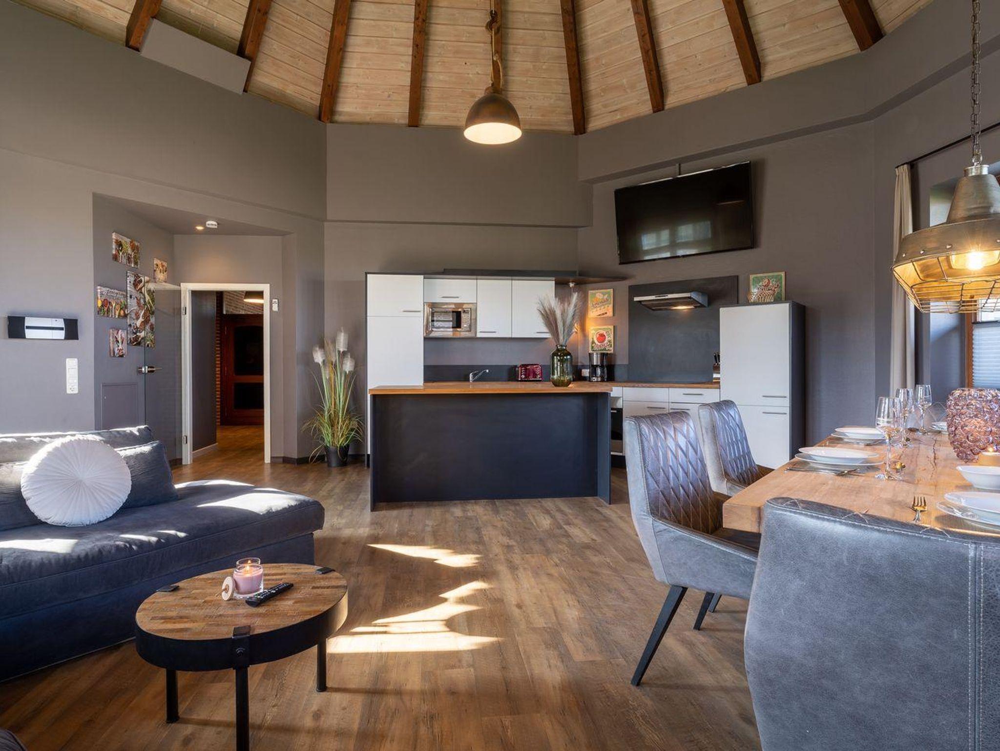 Der lichtdurchflutete und sehr großzügige Wohnraum mit TV und einem stilvollen Essbereich, sowie einer modernen Wohnküche befindet sich im Turmzimmer. Die hohe offene Kegeldecke ist einzigartig. An den Wohnbereich schließen sich ein Flur mit Garderobe und zwei Duschbäder.