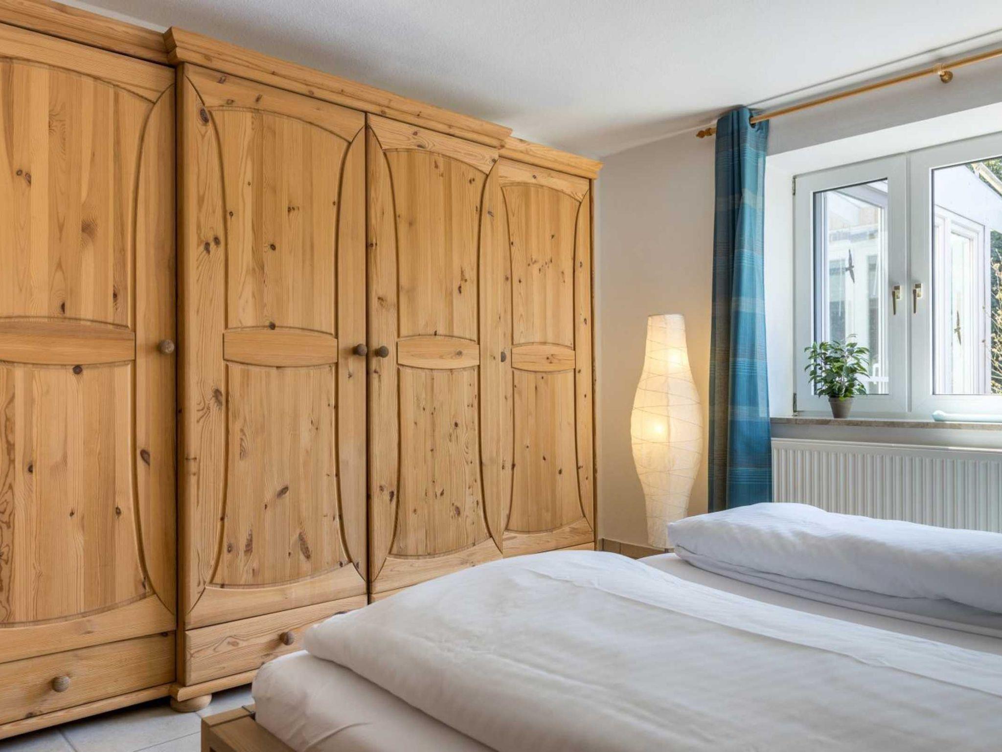 Schlafzimmer mit Doppelbett (2x 90x200cm), TV (Sat), großem Kleiderschrank, Kommode, 2 Stühlen und Blick in den Garten nach Süden.