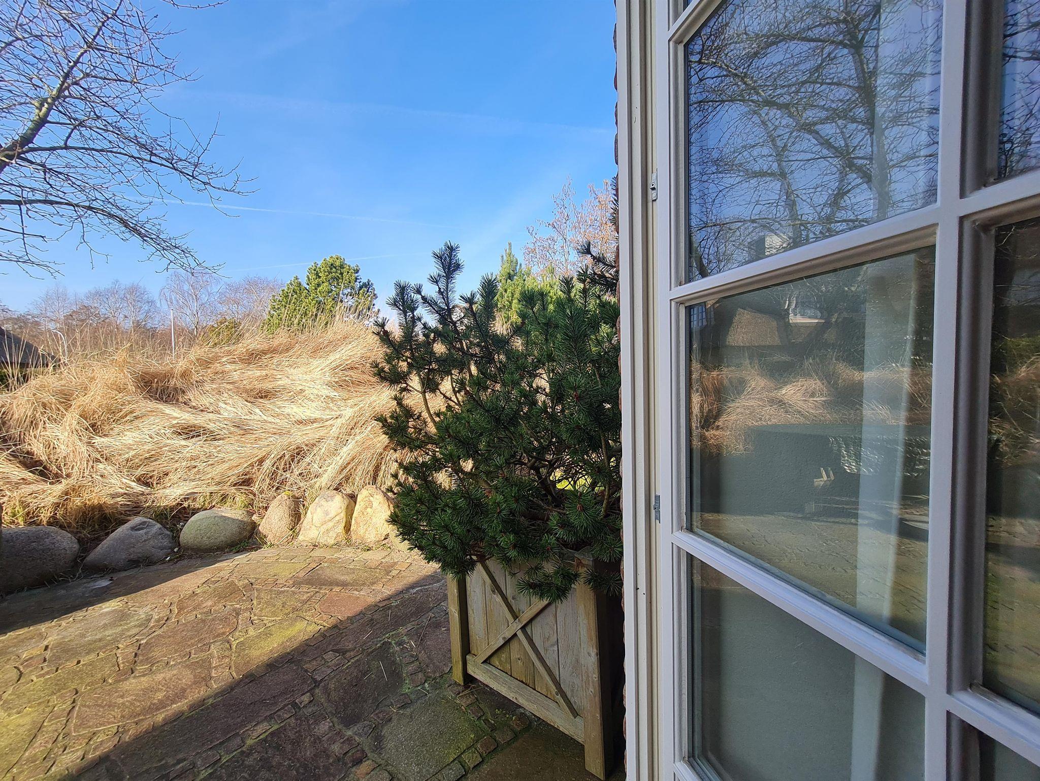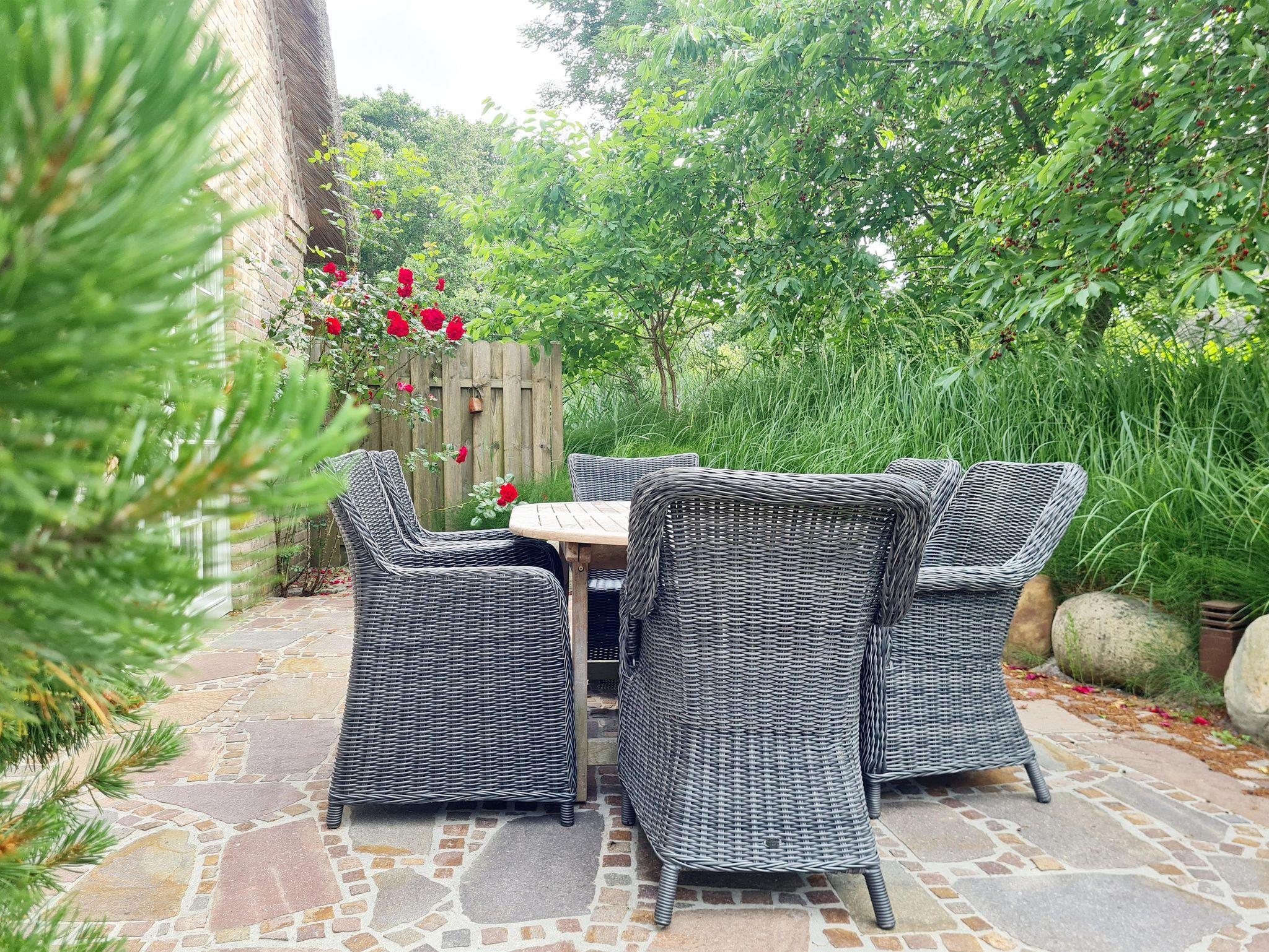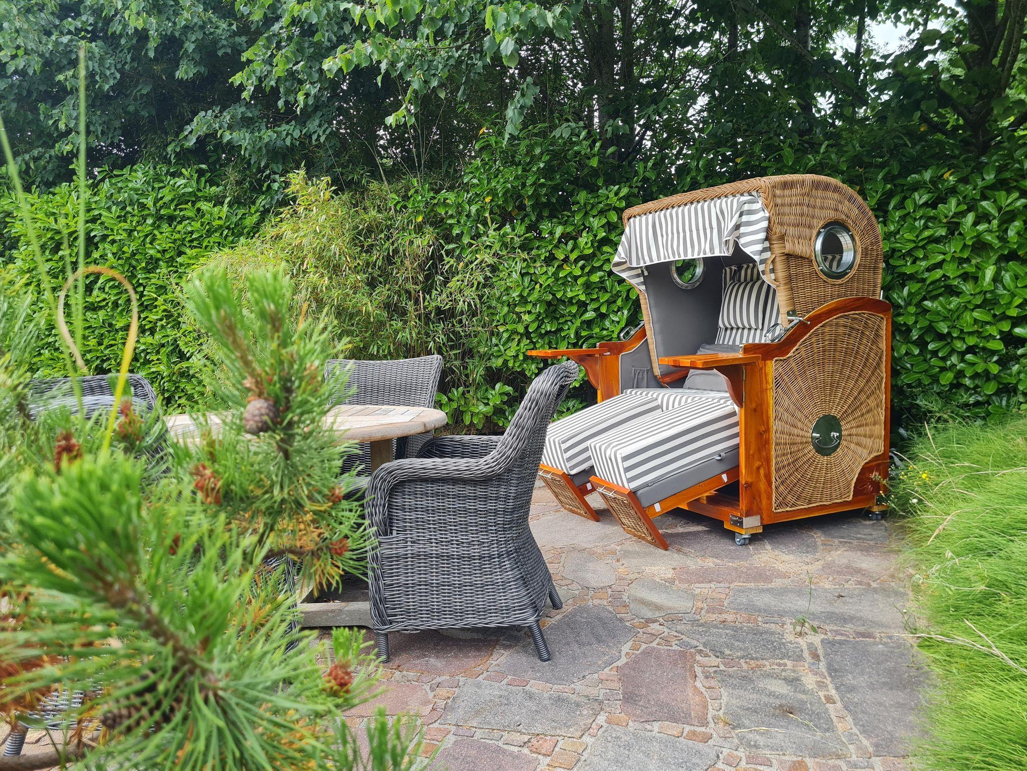 Schöne Sonnenabende können Sie auf der Westterrasse mit Dünenbepflanzung verbringen. Eine zusätzliche Sitzgruppe im Garten finden Sie in der lauschigen Kiefernecke.