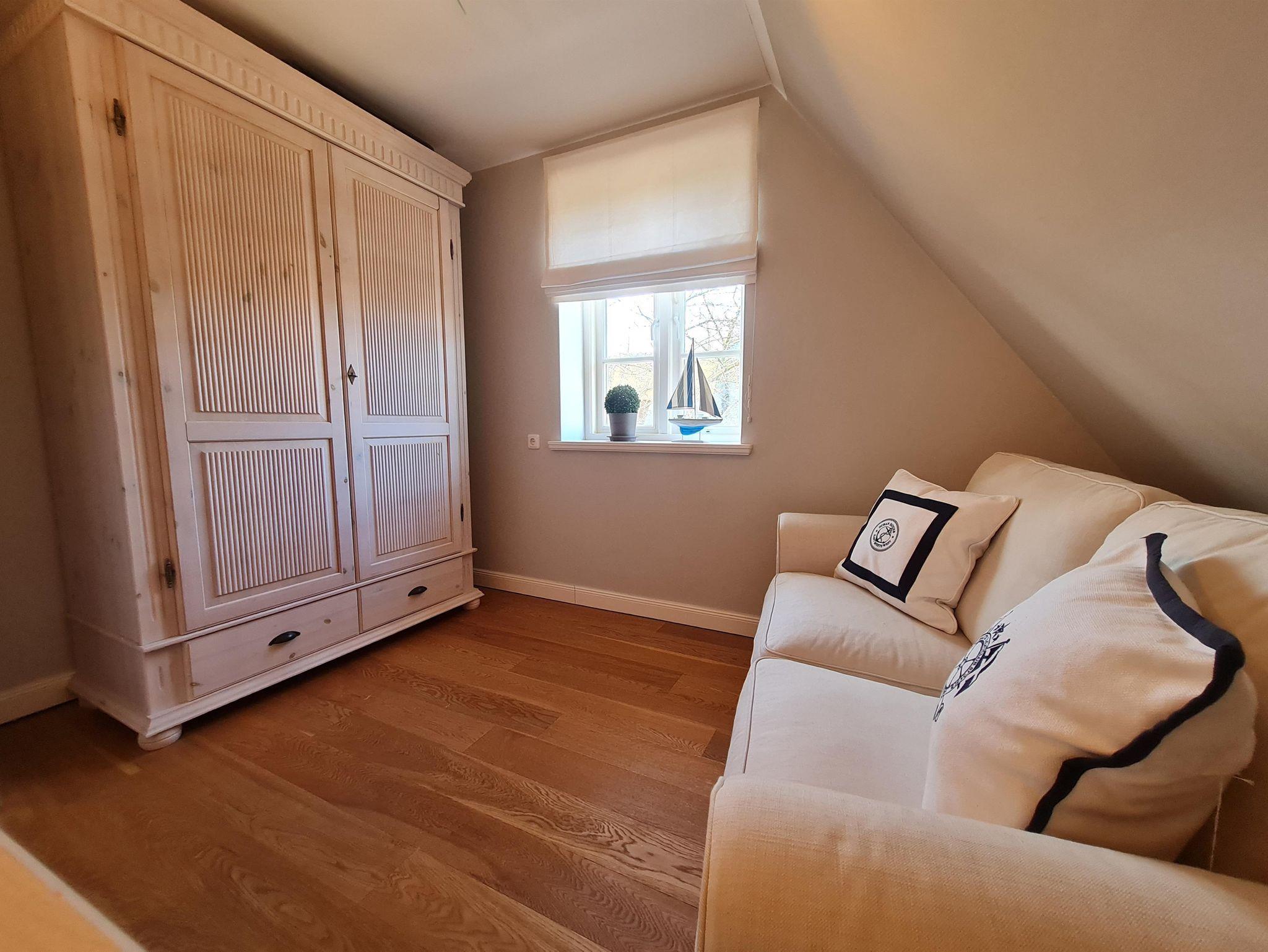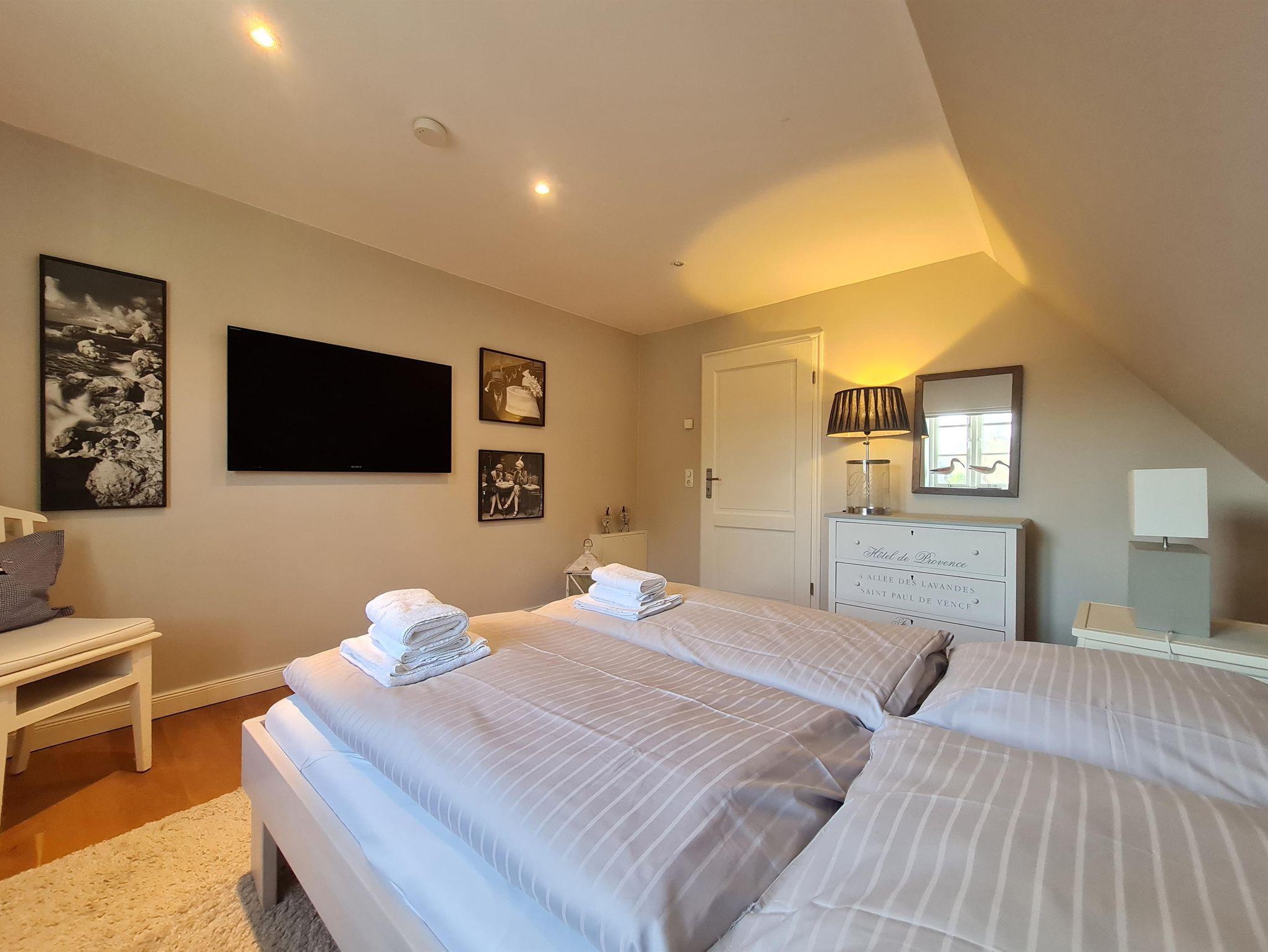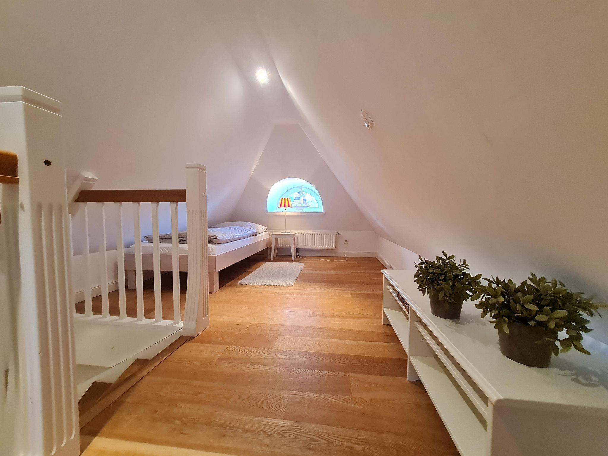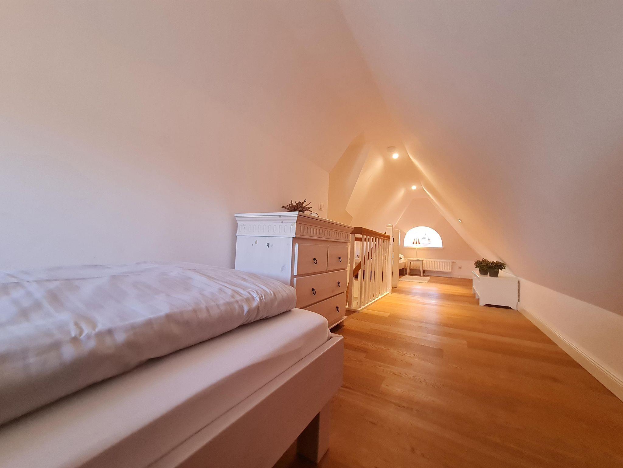 Im Dachgeschoss befindet sich ein weiterer Schlafraum mit zwei Einzelbetten, ideal für Kinder oder mitreisende Freunde.