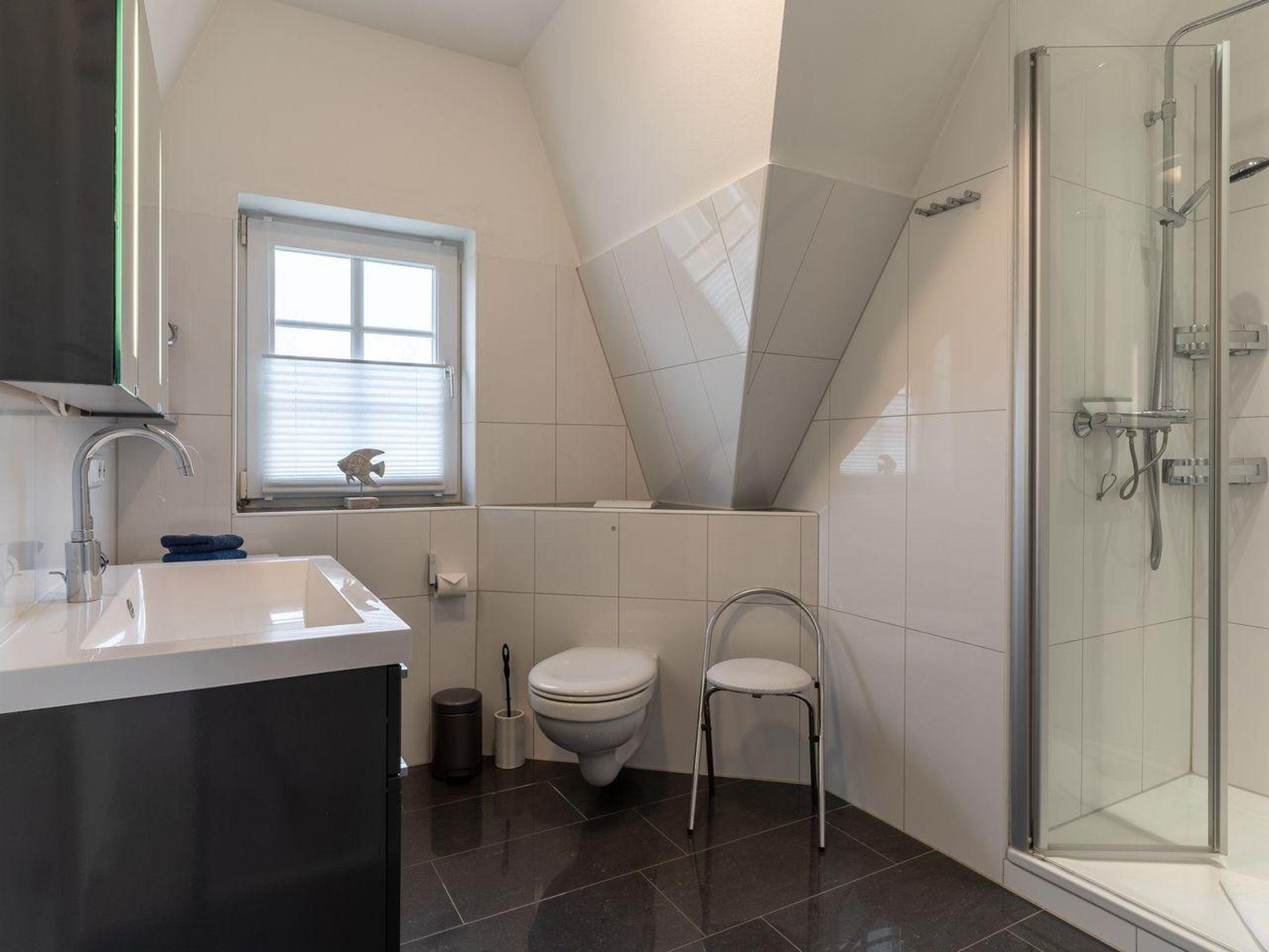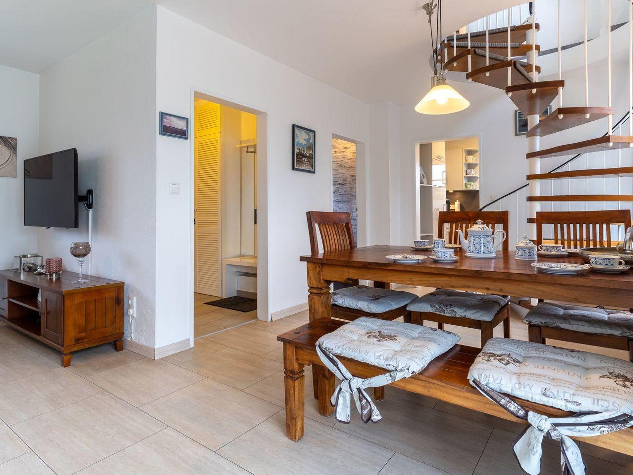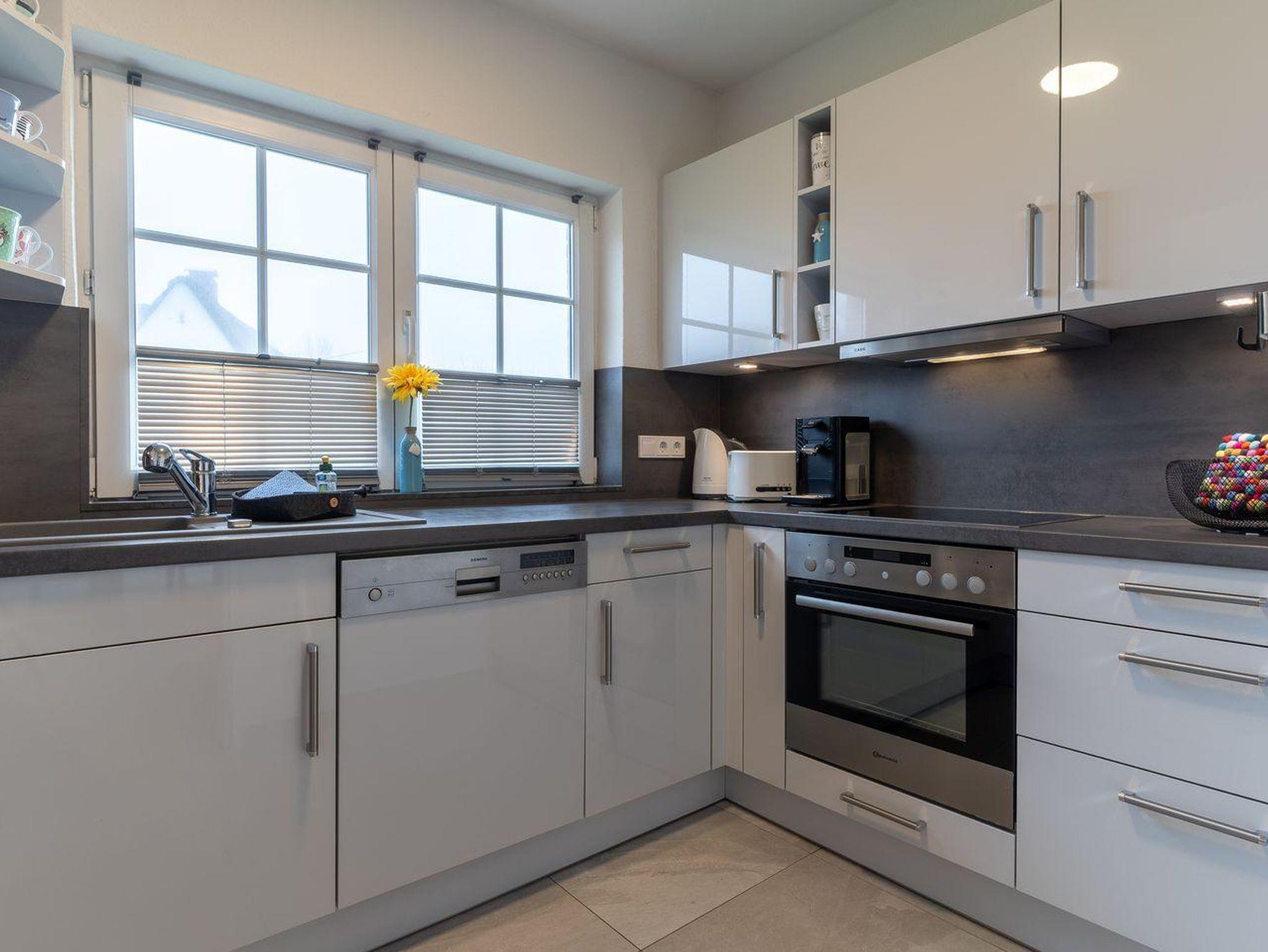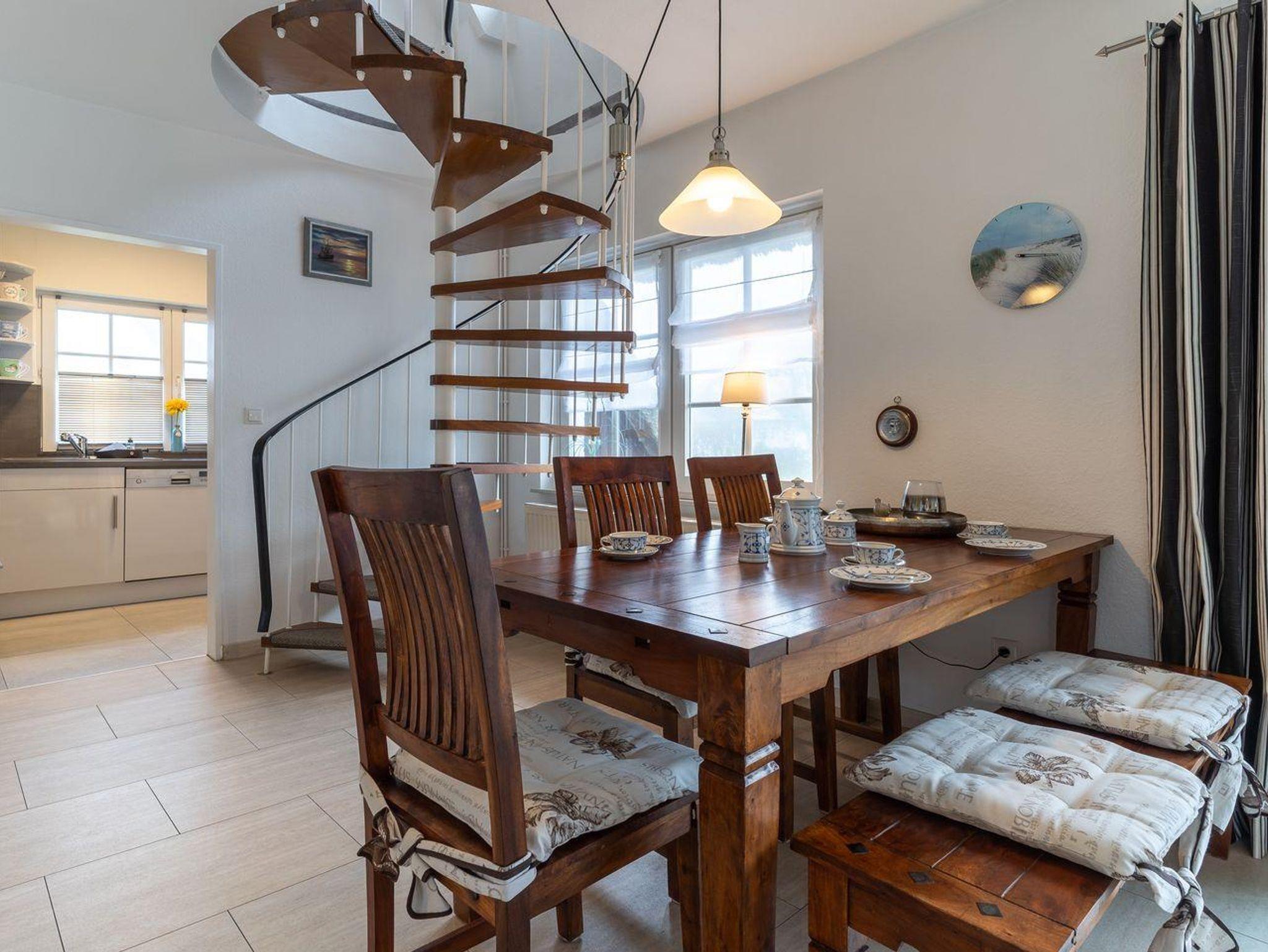 Im Erdgeschoss befindet sich der Wohnraum mit einer großzügigen Sitzecke und einem Essbereich. Vom Essbereich geht es direkt in die Küche, die voll ausgestattet ist. Im Erdgeschoss ist ebenso ein Flur mit eingebauter Garderobe, ein Hauswirtschaftsraum mit Gäste WC.