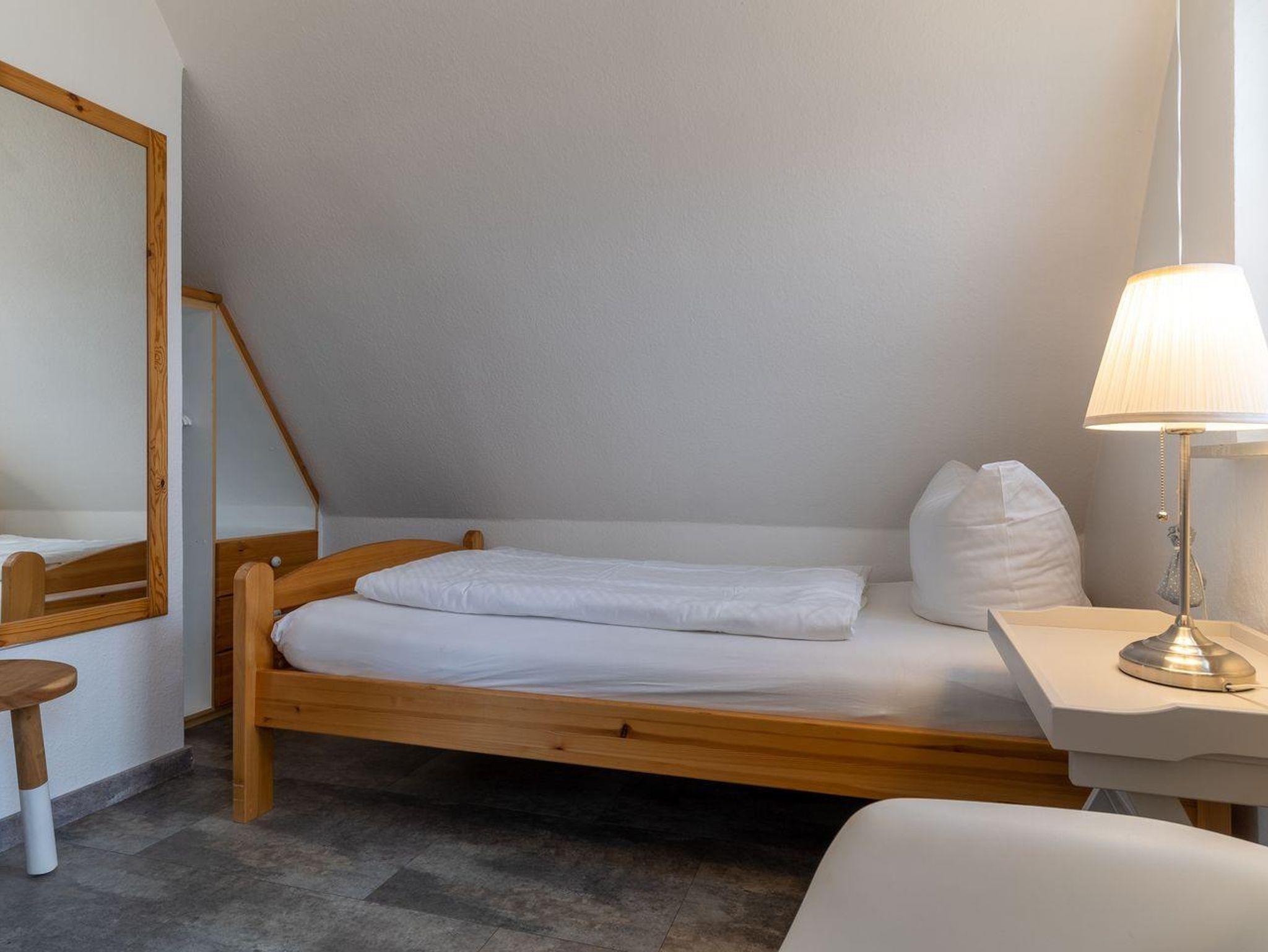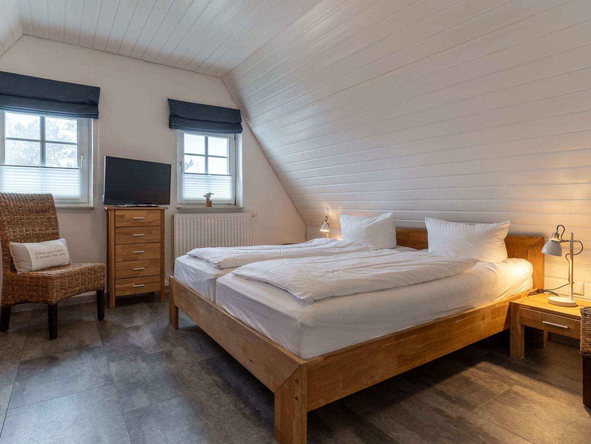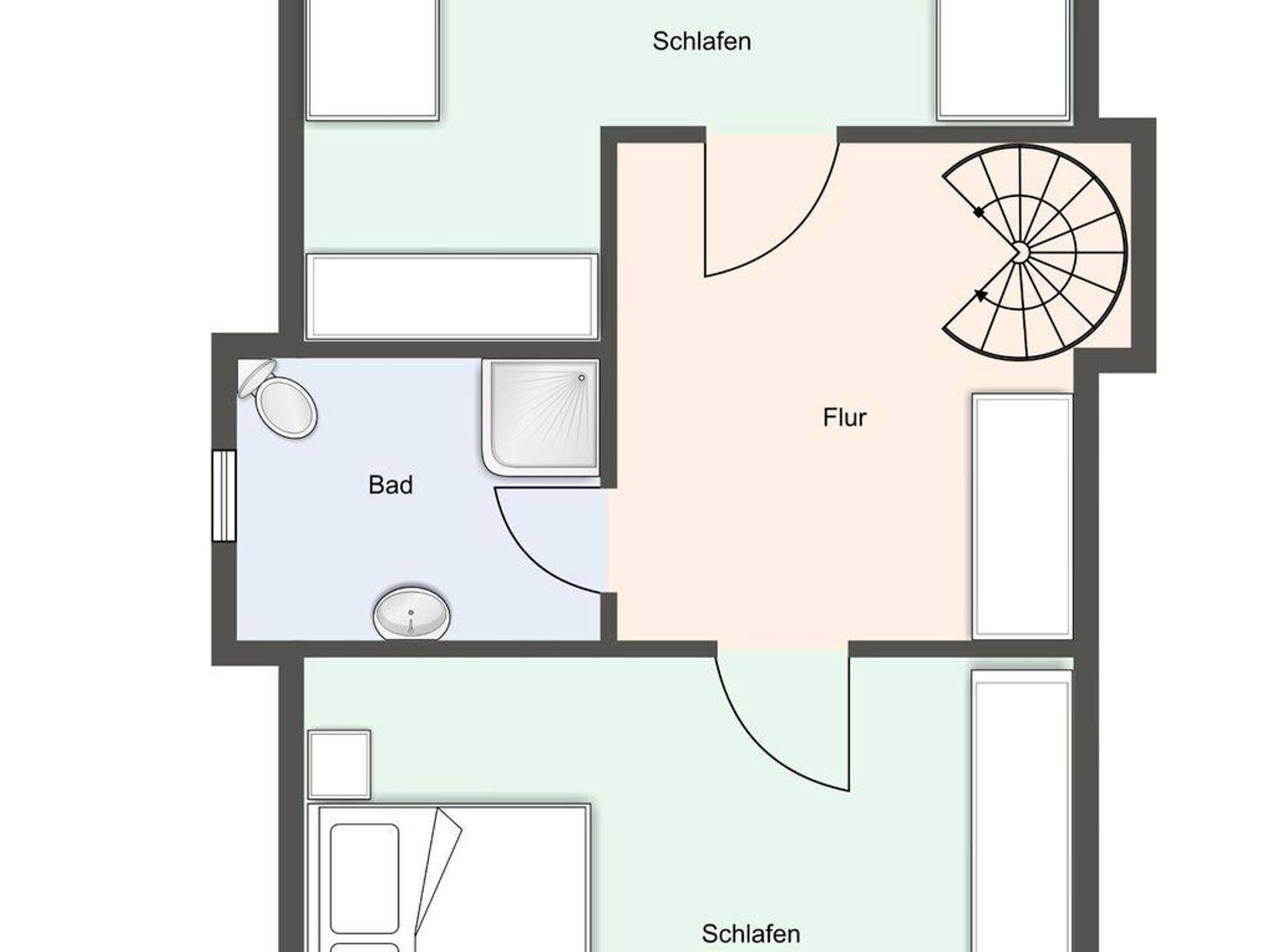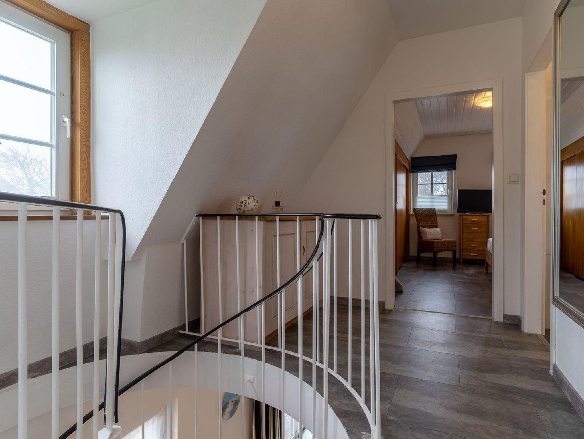 Über eine Rundtreppe gelangt man in das Obergeschoss mit zwei großzügigen Schlafzimmern und einem Duschbad.