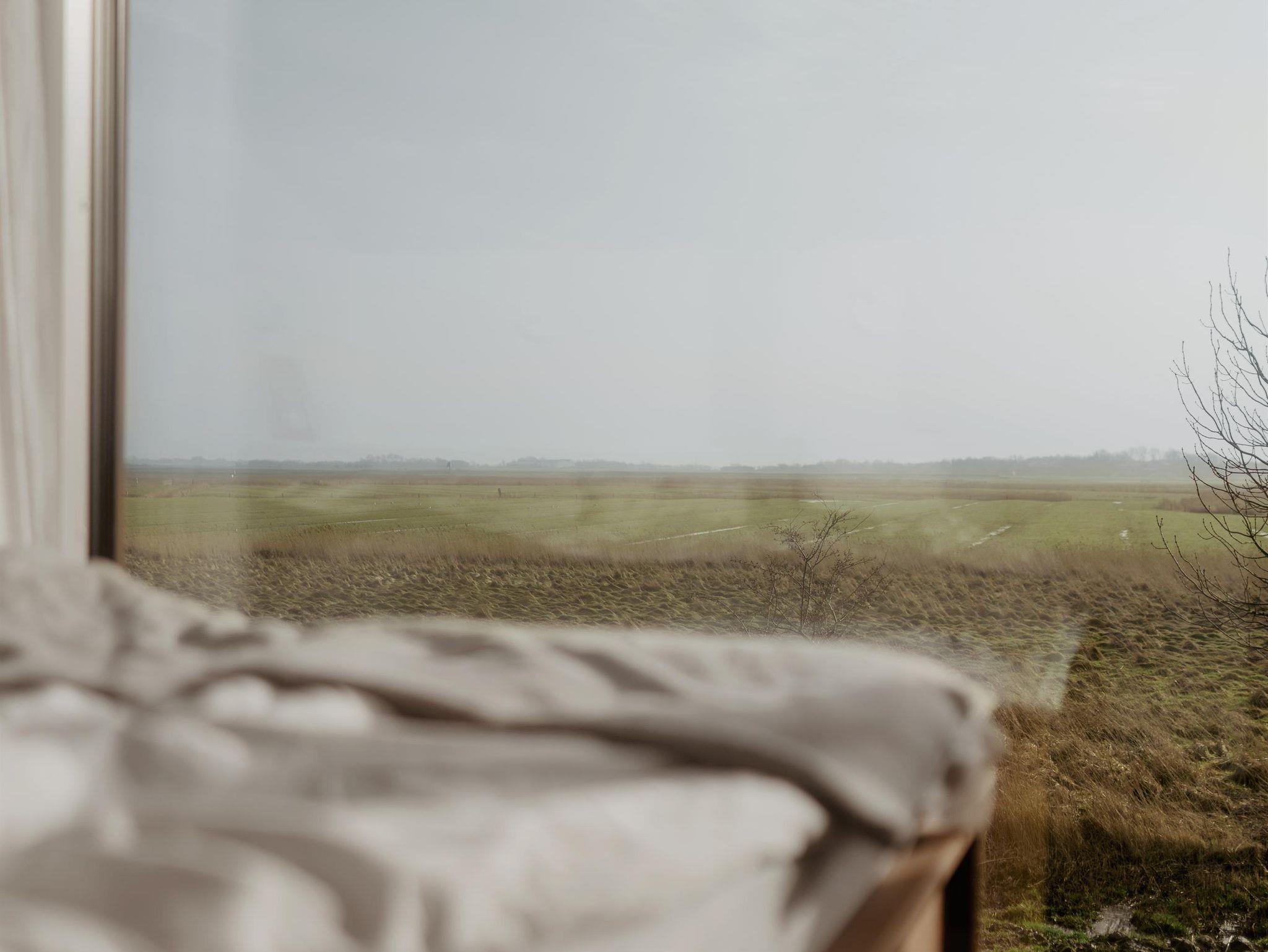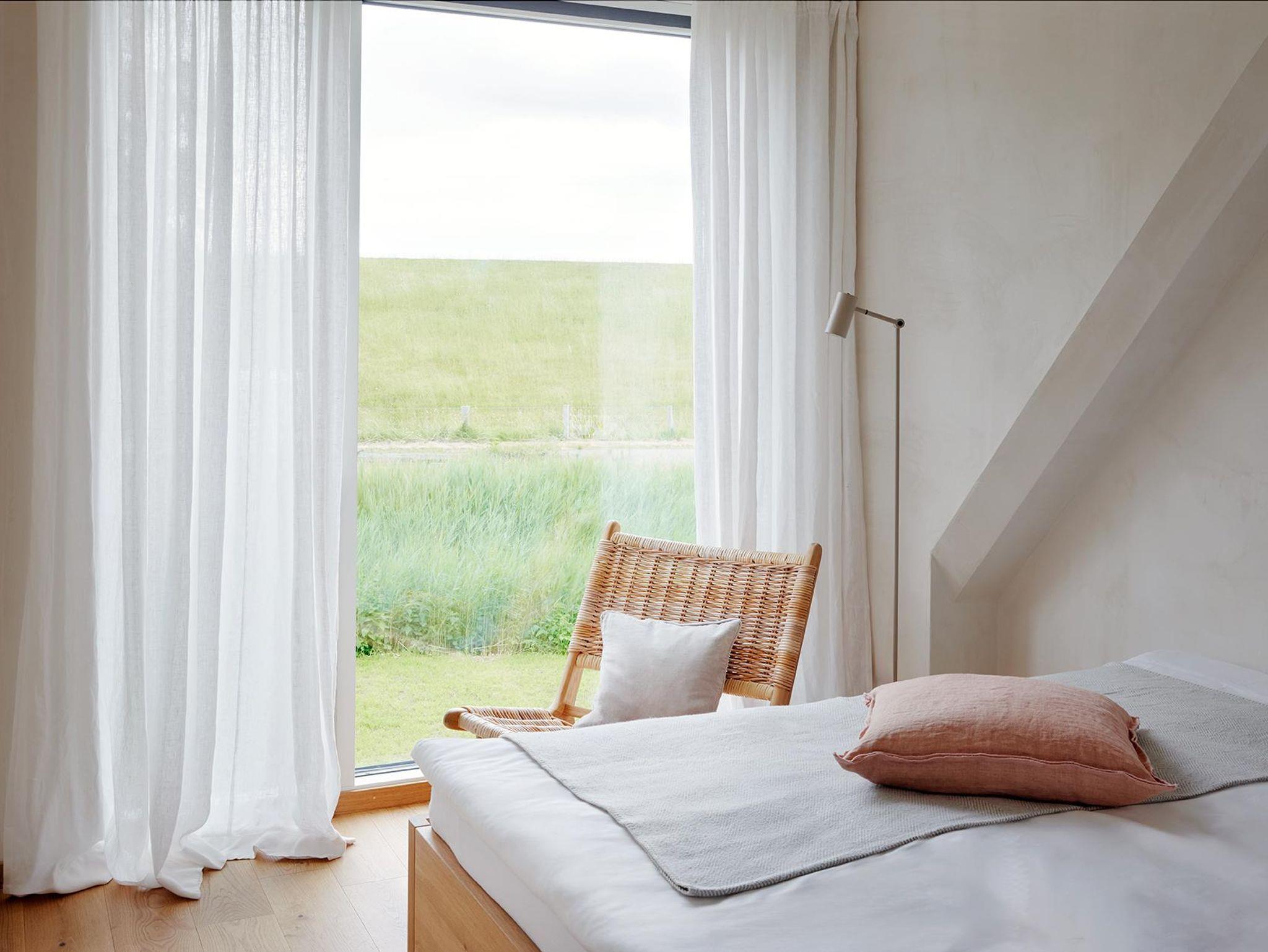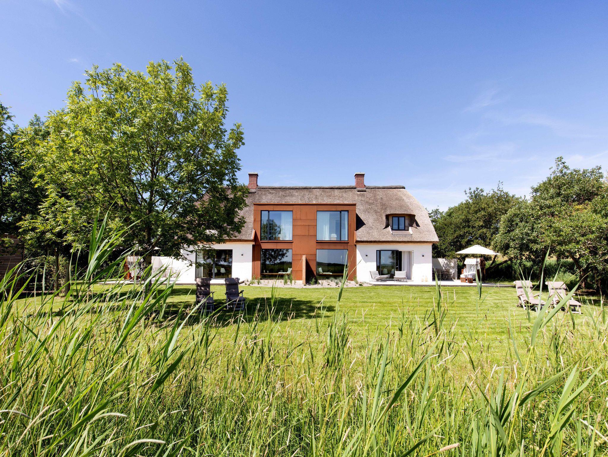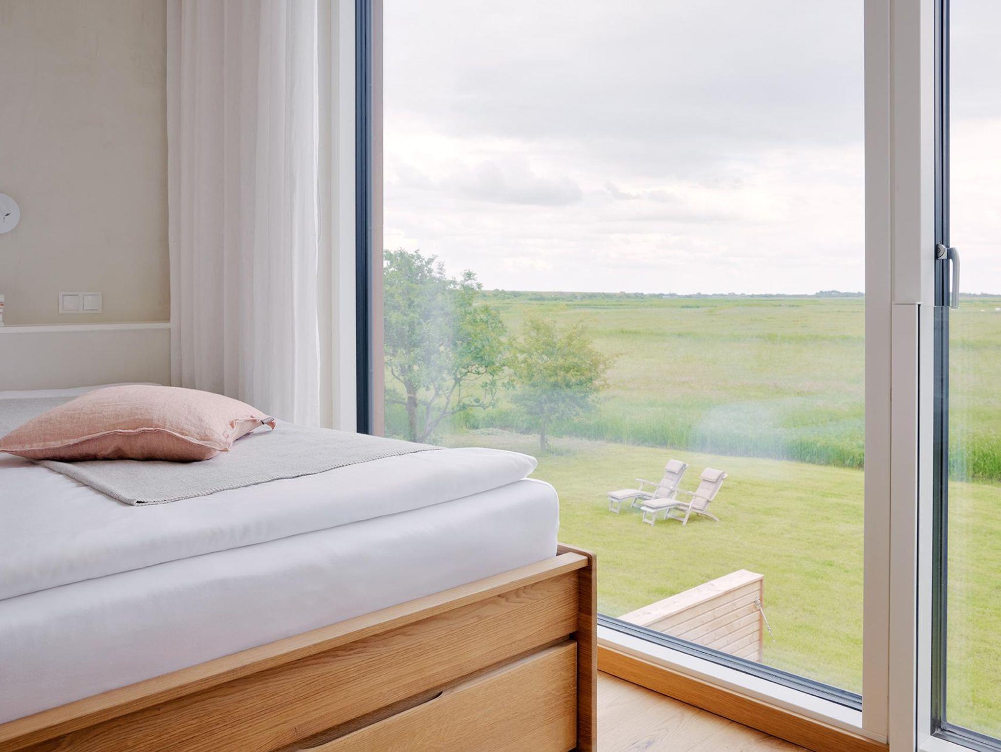 Der großzügige Wohnraum öffnet sich nach Süden und Westen mit bodentiefen Fenster- und Türelementen zu einer weiträumigen Holzterrasse und schafft so einen fließenden Übergang zwischen Innen und Außen, zur Weite der Wiesenlandschaft Eiderstedts. Das norderdiekhuus mit der großen, sehr gut ausgestattete Küche, mit dem breiten Sofa am Fenster mit Weitblick sowie den drei sehr gemütlichen Schlafzimmer im Obergeschoss, eins davon mit Bad en suite, bietet Platz für bis zu sechs Gäste. Die Ferienwohnung ist komplett mit Fussbodenheizung ausgestattet.