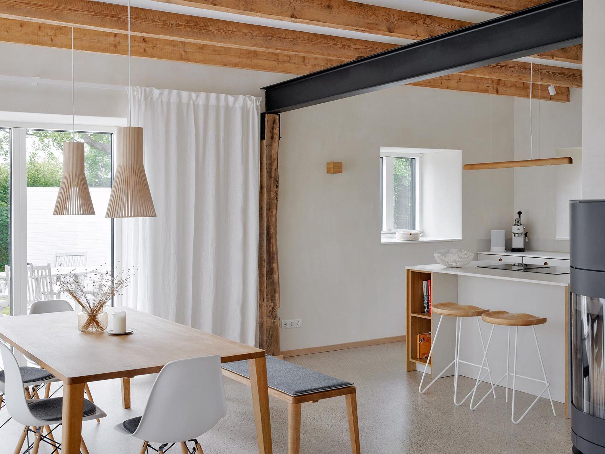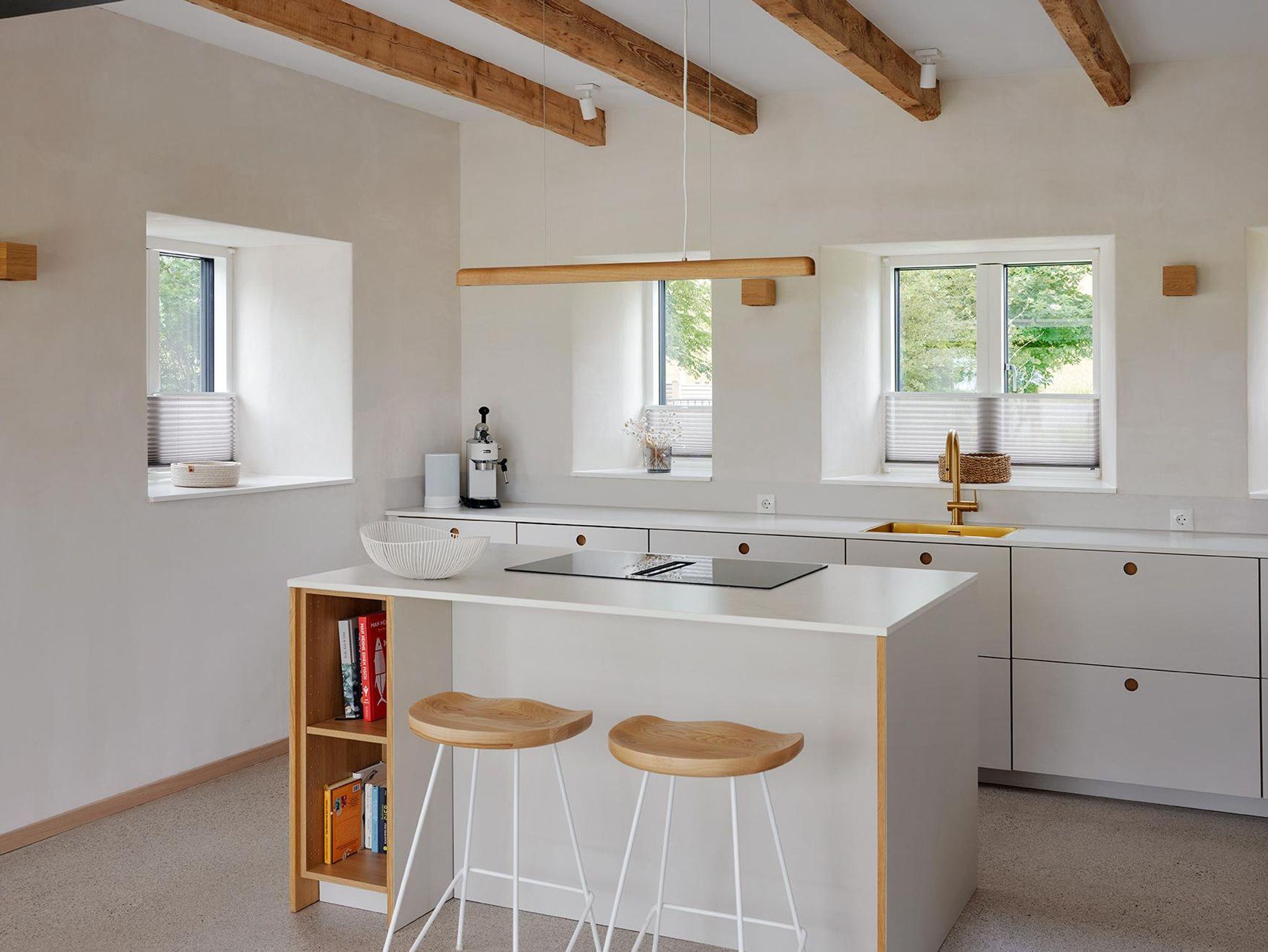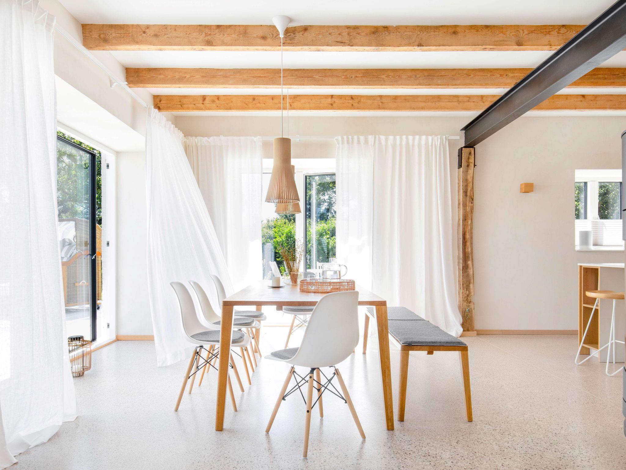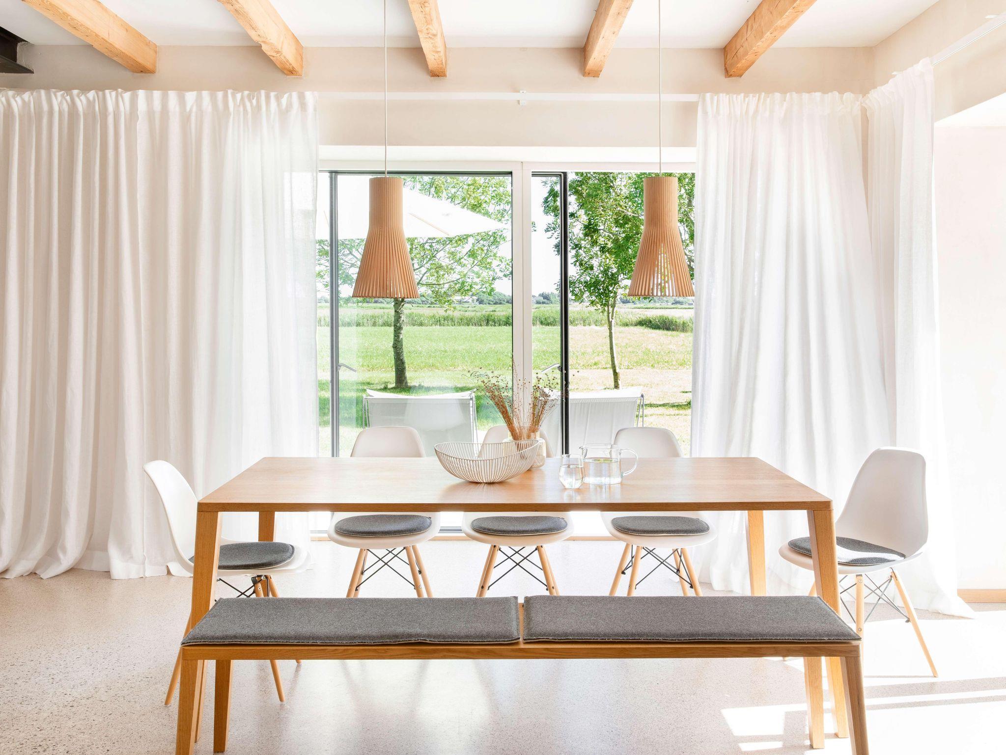 Der großzügige Wohnraum öffnet sich nach Süden und Westen mit bodentiefen Fenster- und Türelementen zu einer weiträumigen Holzterrasse und schafft so einen fließenden Übergang zwischen Innen und Außen, zur Weite der Wiesenlandschaft Eiderstedts. Das norderdiekhuus mit der großen, sehr gut ausgestattete Küche, mit dem breiten Sofa am Fenster mit Weitblick sowie den drei sehr gemütlichen Schlafzimmer im Obergeschoss, eins davon mit Bad en suite, bietet Platz für bis zu sechs Gäste. Die Ferienwohnung ist komplett mit Fussbodenheizung ausgestattet.