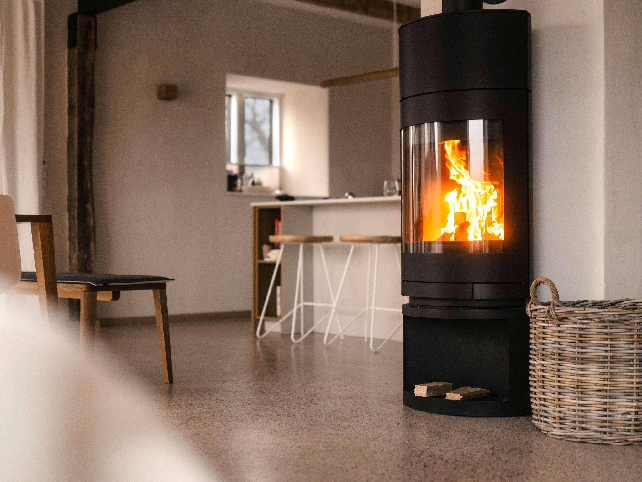 Wohnbereich mit Kamin, großer Couch und Esstisch mit sechs Stühlen. Vollständig ausgestattete Küche mit (u.a. Induktionsherd, Backofen und Kühlschrank).