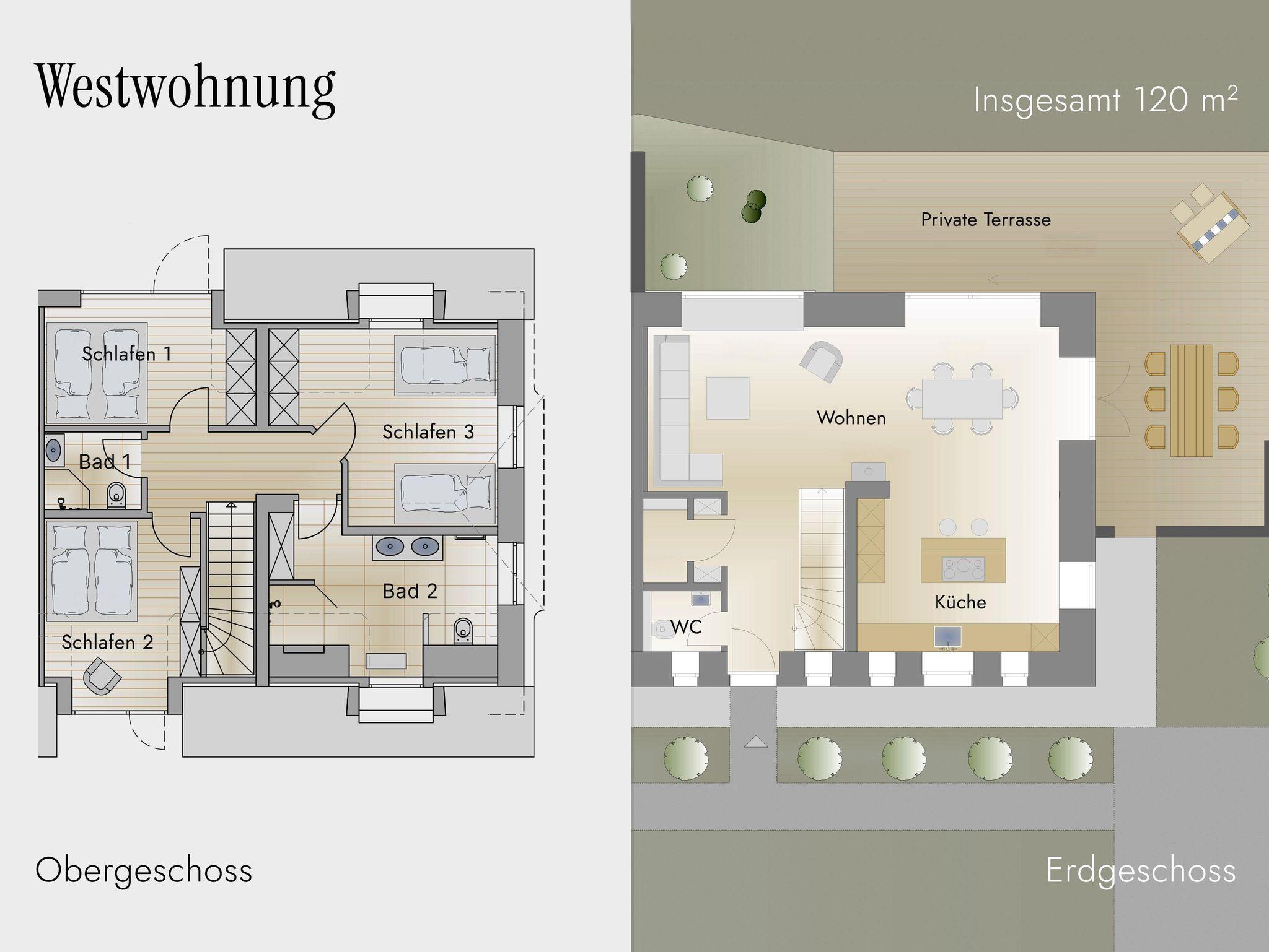 Ein zweites separates Duschbad mit WC im Obergeschoß und zusätzlich ein Gäste-WC im Erdgeschoß.