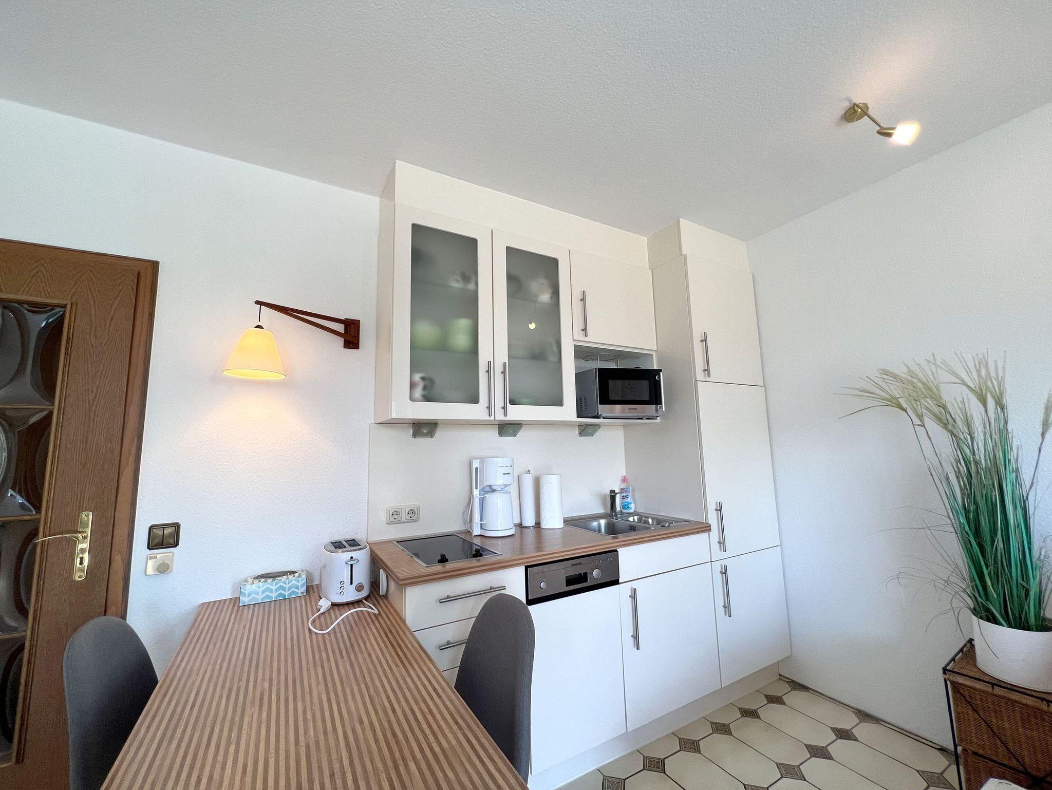 Mit Weitblick! Die geschmackvolle, gemütliche 2-Zimmer-Ferienwohnung Atlantis Nr. 08 in St. Peter-Bad liegt im 2. Obergeschoss und besitzt eine gut ausgestattete, Küchenzeile mit Cerankochfeld. Schlaf finden Sie mit bis zu 2 Personen in einem kleinen Doppelbett im Schlafzimmer, oder auf der gemütlichen Schlafcouch im Wohnbereich. Der Balkon in Süd- Westlage bietet durch die Bäume einen kleinen Meeresblick. Ein Pkw-Stellplatz auf dem Grundstück, Nr. 8