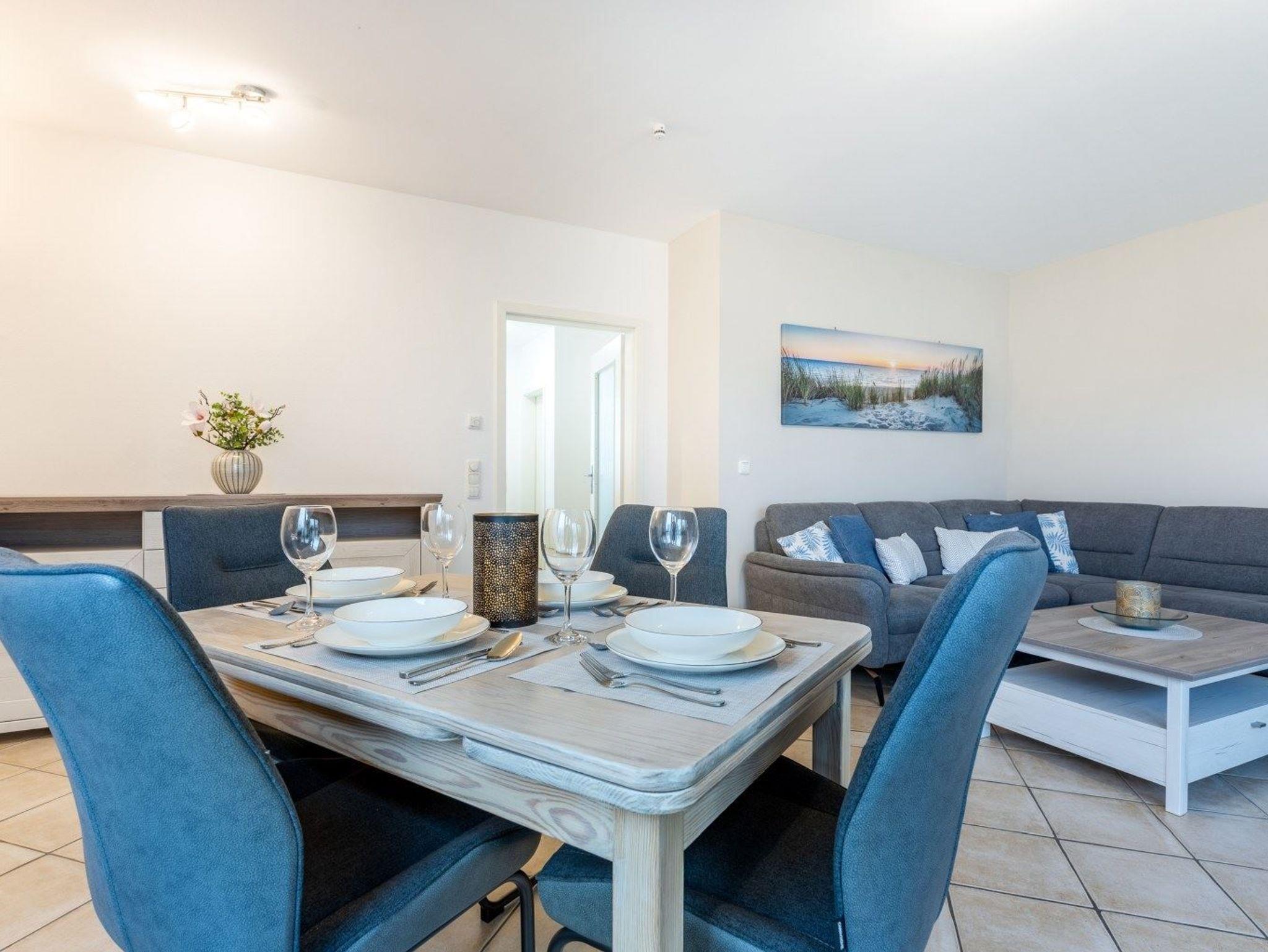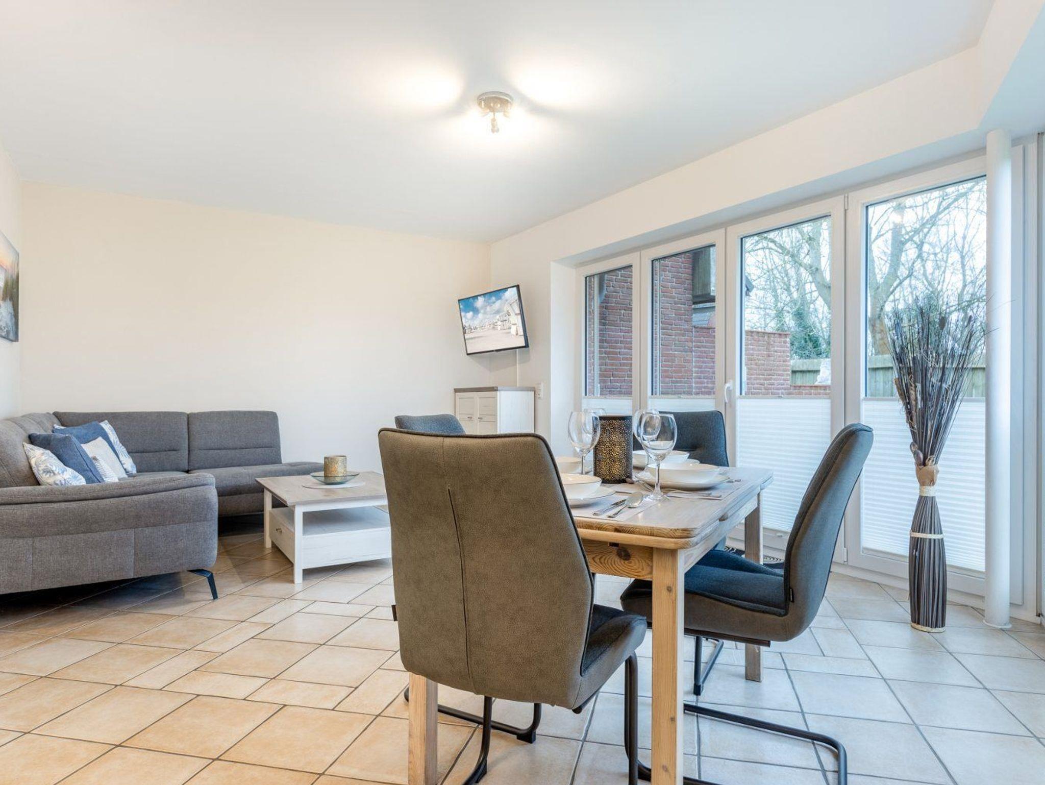 Wohnzimmer mit Ecksofa, SMART-TV (Sat), Esstisch mit vier Stühlen und direktem Zugang zur möblierten Gartenterrasse nach Süden.