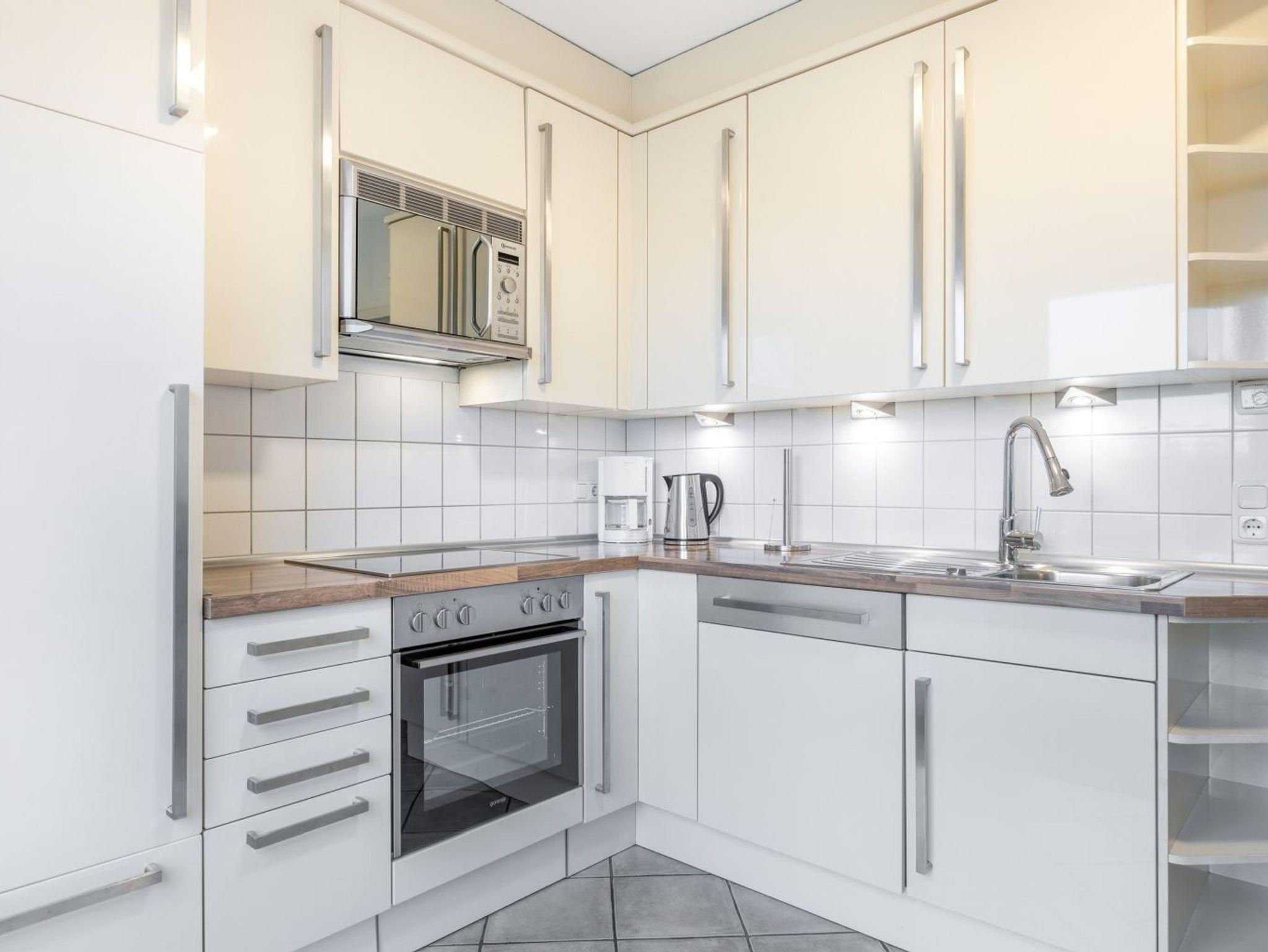 Separate Küche mit Backofen, Mikrowelle, Geschirrspüler, Kühlschrank (ohne Gefrierfach) und Hochtisch mit 4 Barstühlen. Direkter Zugang zur möblierten Gartenterrasse nach Westen.