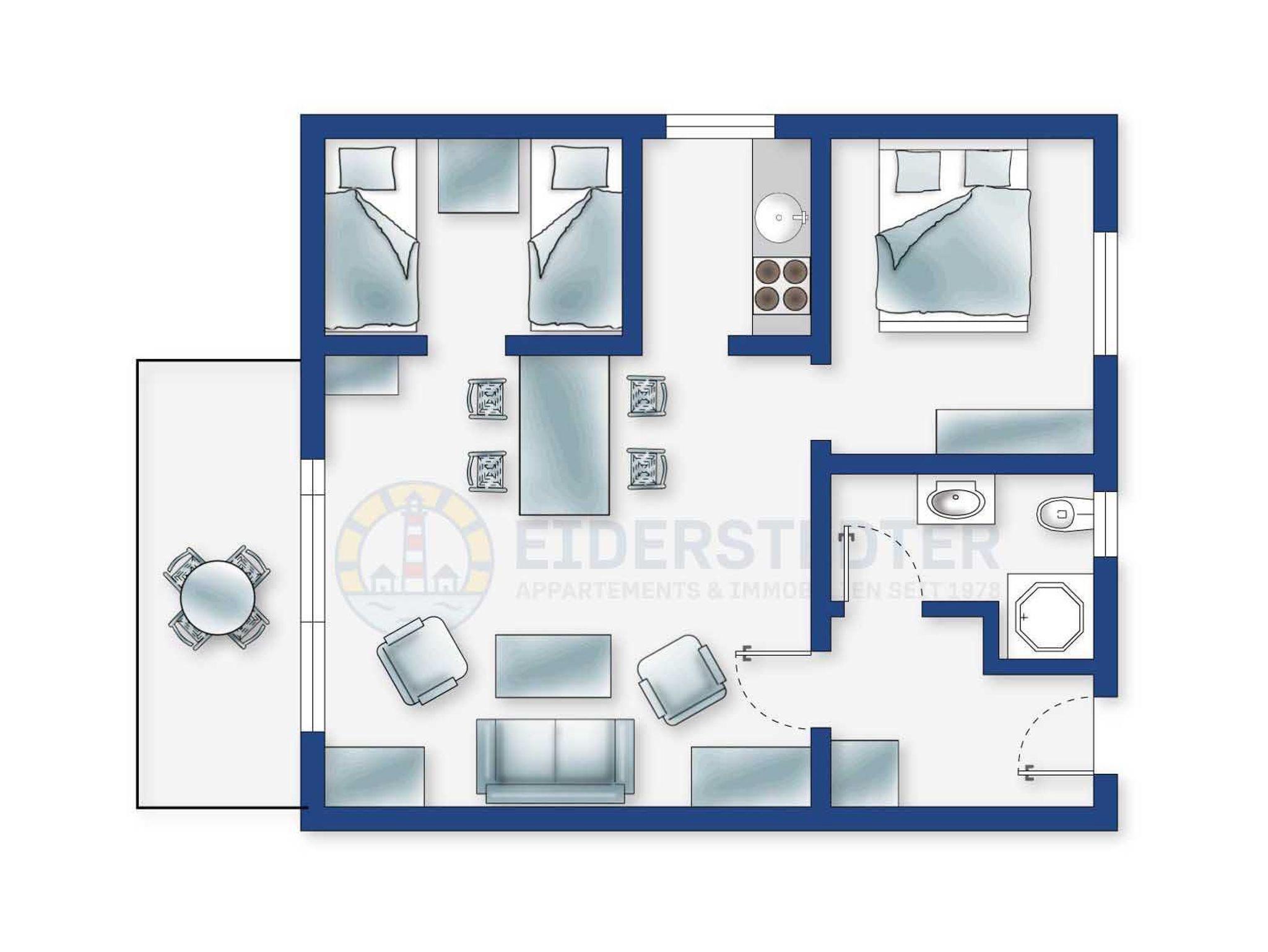 Gemütliche 2 1/2-Zimmer-Ferienwohnung Seestern im Haus Colonia mit ca. 48 m² auf 1 Ebene (EG bzw. Hochparterre) für bis zu 4 Personen (Wohlfühlbelegung: max. 3 Erwachsene). Zentrumsnahe Lage im Ortsteil Bad in St. Peter-Ording. Direkt am Kurwald, mit Bushaltestelle in der Nähe (kostenloses City Shuttle mit Gästekarte).