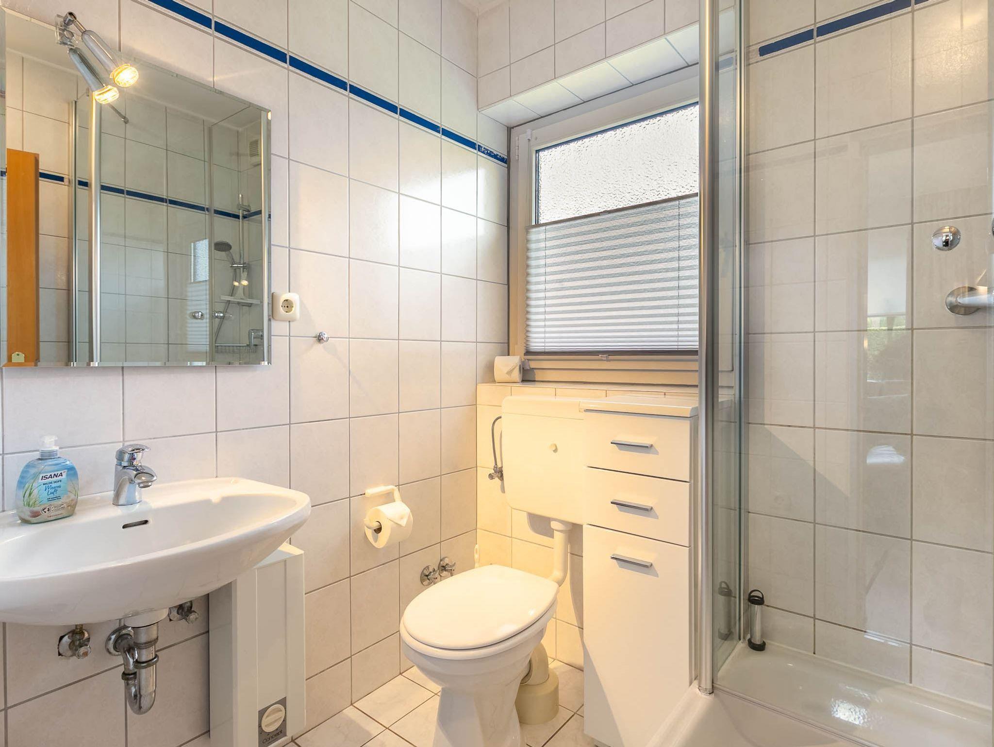 Badezimmer (Duschbad) mit Dusche, WC, Handtuchwärmer, Tageslicht und Föhn.