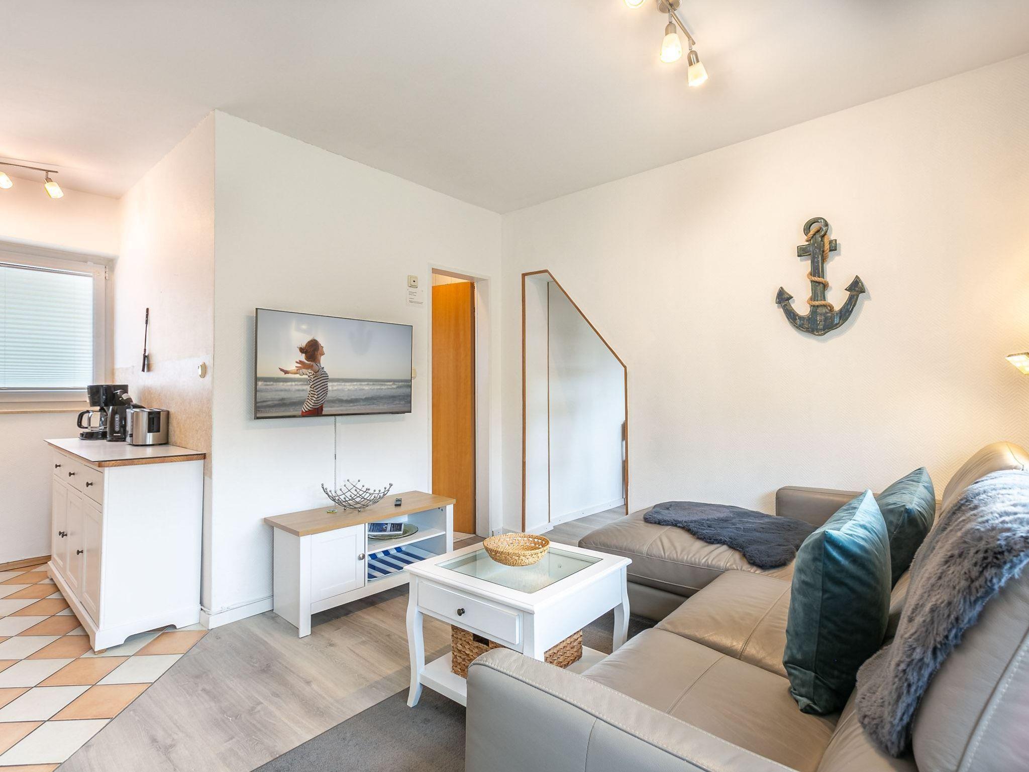 Gemütlich eingerichtetes Wohnzimmer mit elektrisch verstellbarem Lederecksofa, SMART-TV (Sat) und Stereo-Kompaktanlage. Direkter Zugang zur möblierten und windgeschützten Gartenterrasse nach Westen mit Strandkorb. Offene Küche mit Backofen, Geschirrspüler und Kühlschrank (ohne Gefrierfach). Im Eingangsbereich des Domizils befindet sich das separate Esszimmer, von dem aus eine Treppe zum 2. Schlafzimmer führt.