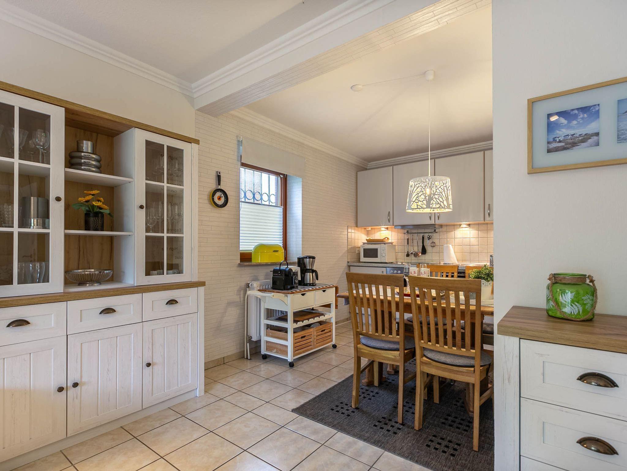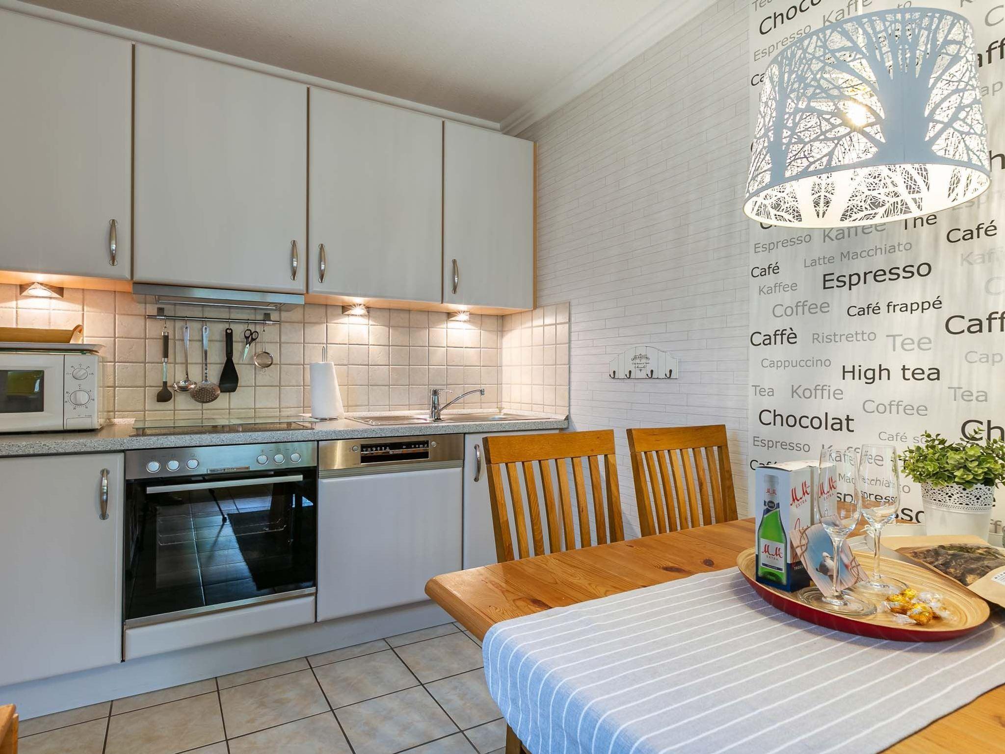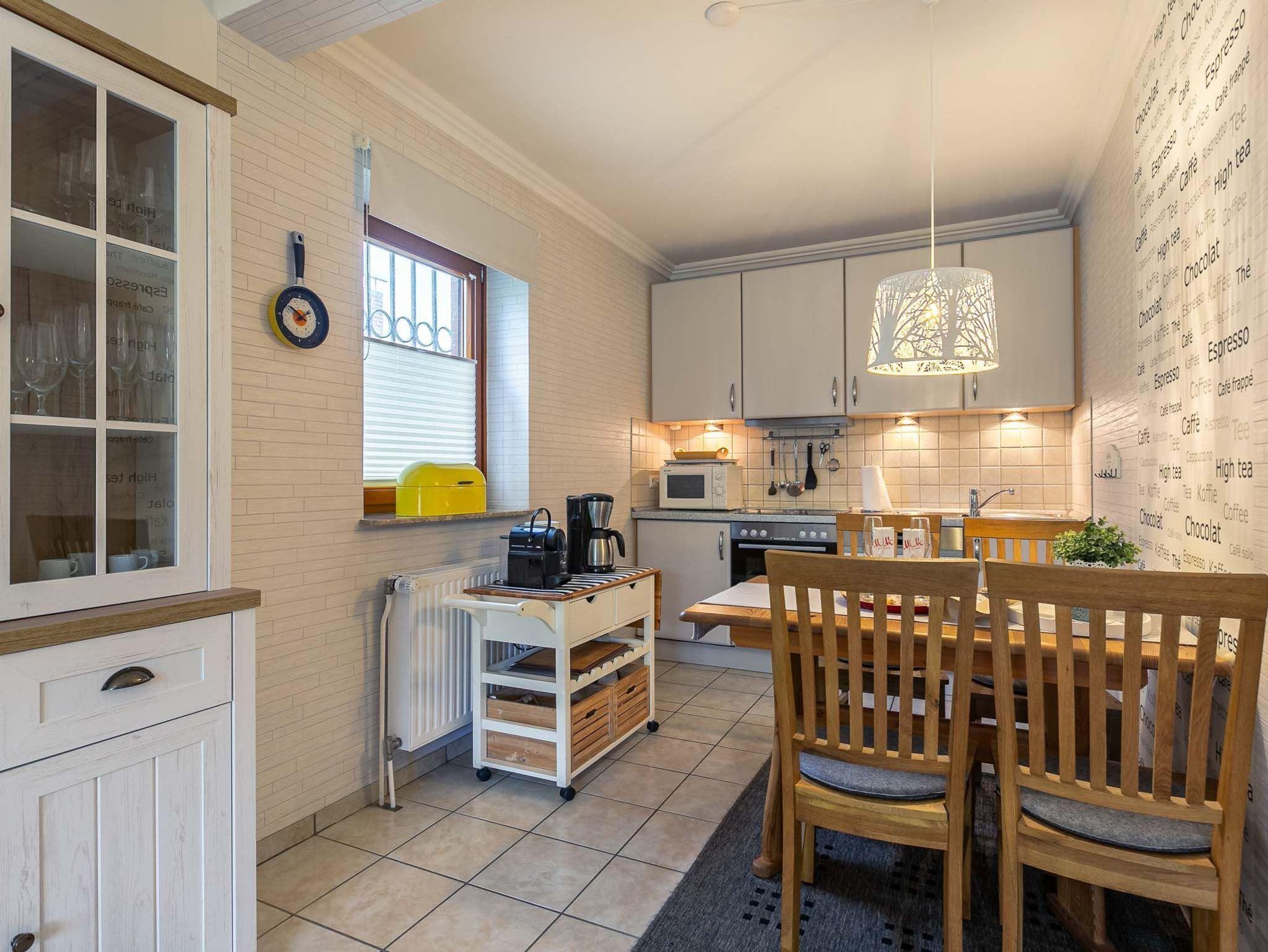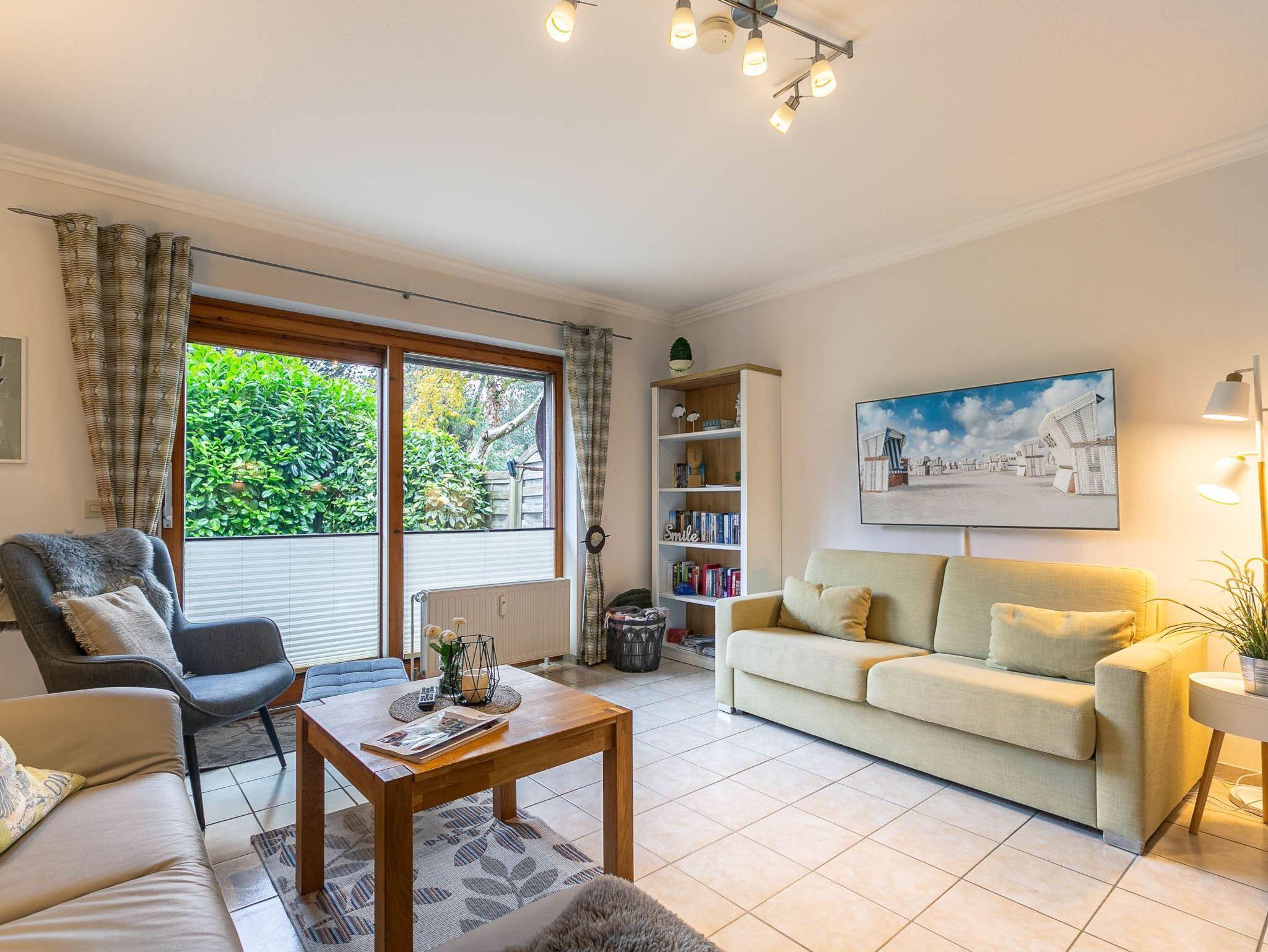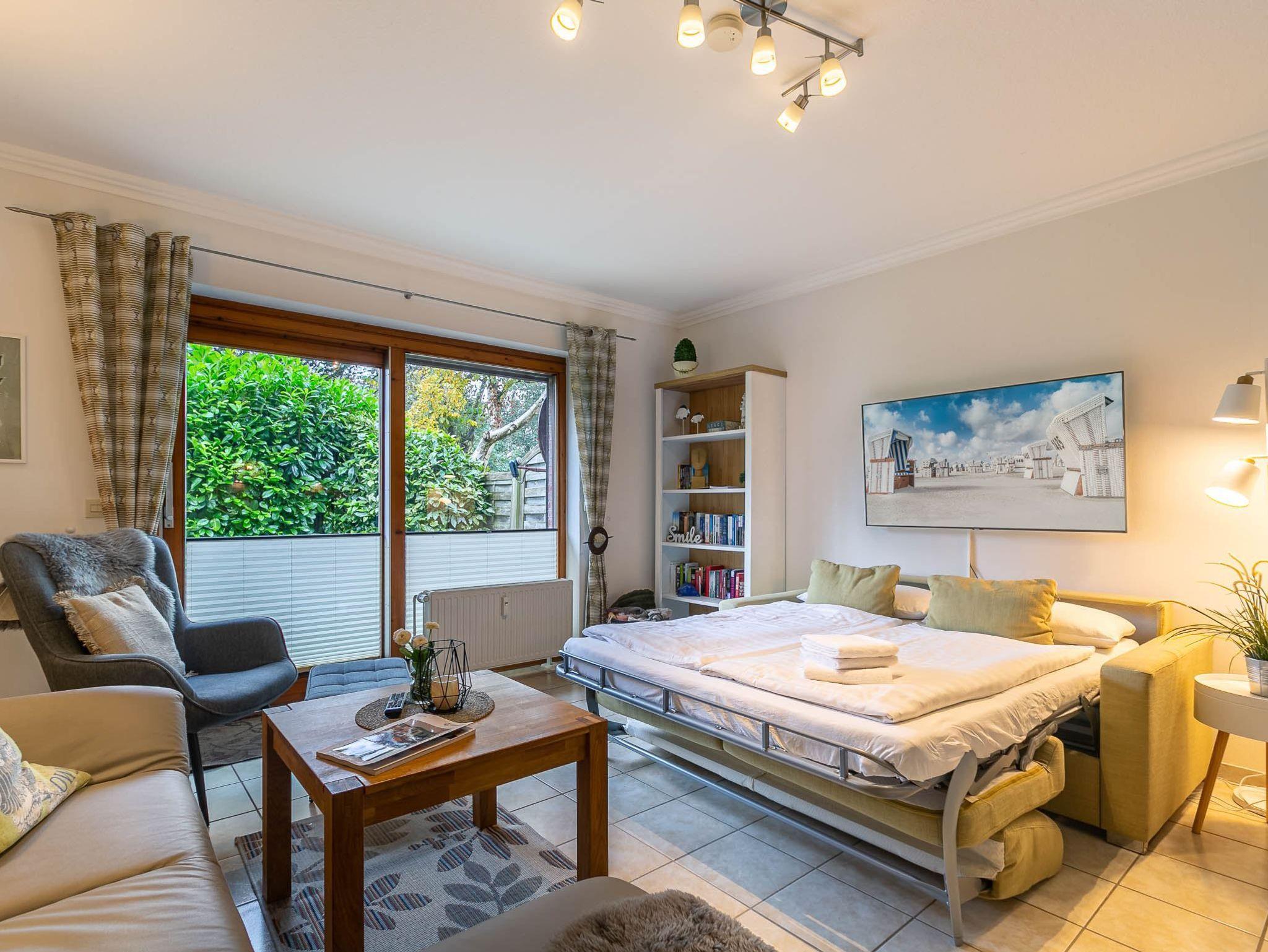 Großes Wohnzimmer mit ausziehbarem Schlafsofa (150x190cm), 2 Ledersofas (2er), 1 Sessel und großem TV (Kabel). Direkter Zugang zur windgeschützten Terrasse mit Strandkorb und dem gemeinschaftlichen Garten. Moderne offene Küche mit Backofen, Mikrowelle, Geschirrspüler, Kühlschrank mit Gefrierfach, Nespresso Kapsel-Kaffeemaschine und Esstisch mit 4 Stühlen.