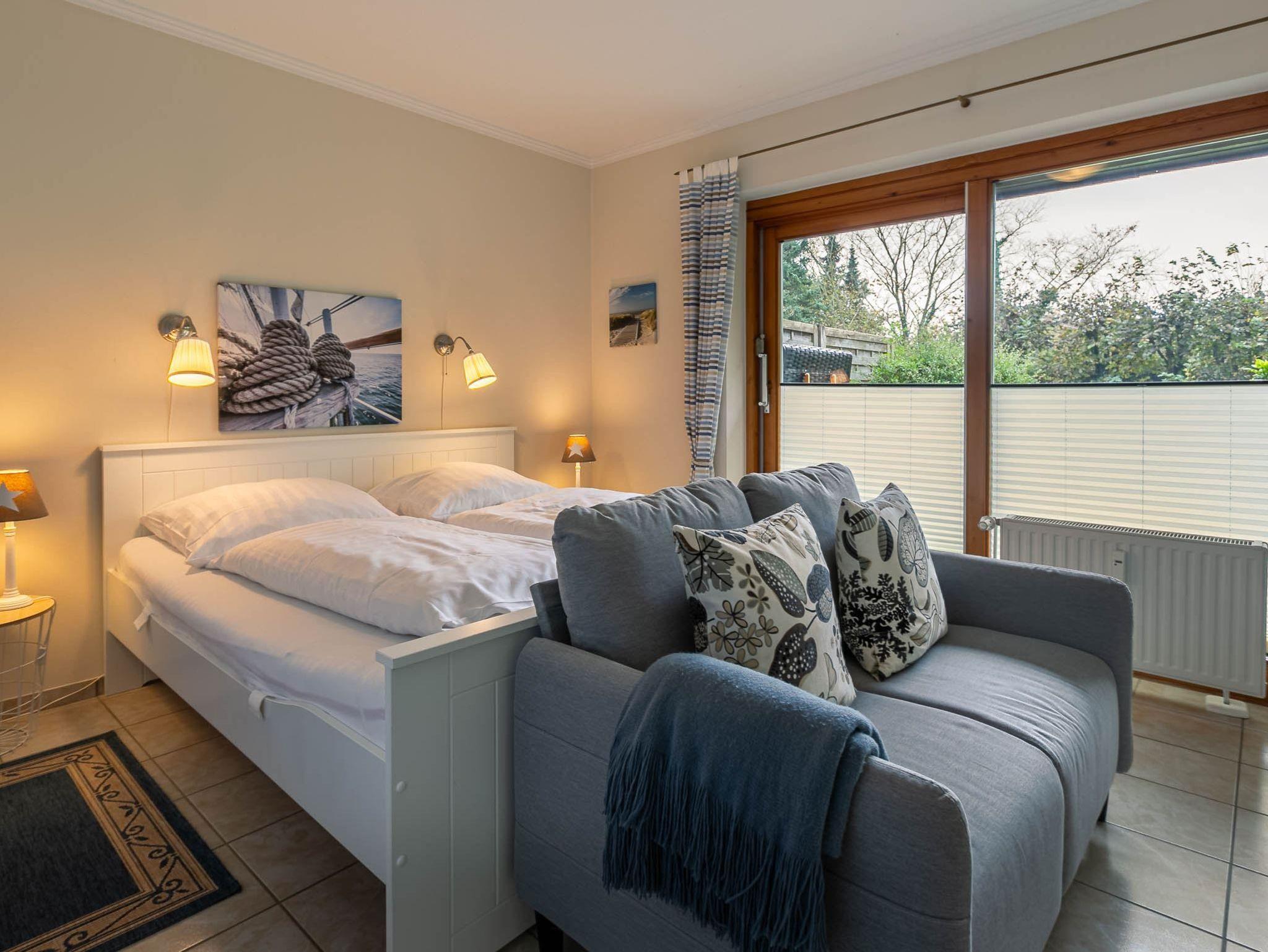Maritim-romantisches Schlafzimmer mit Doppelbett (2x 90x200cm), Sofa (2er), Kleiderschank und TV. Ebenfalls direkter Zugang zur Gartenterrasse.