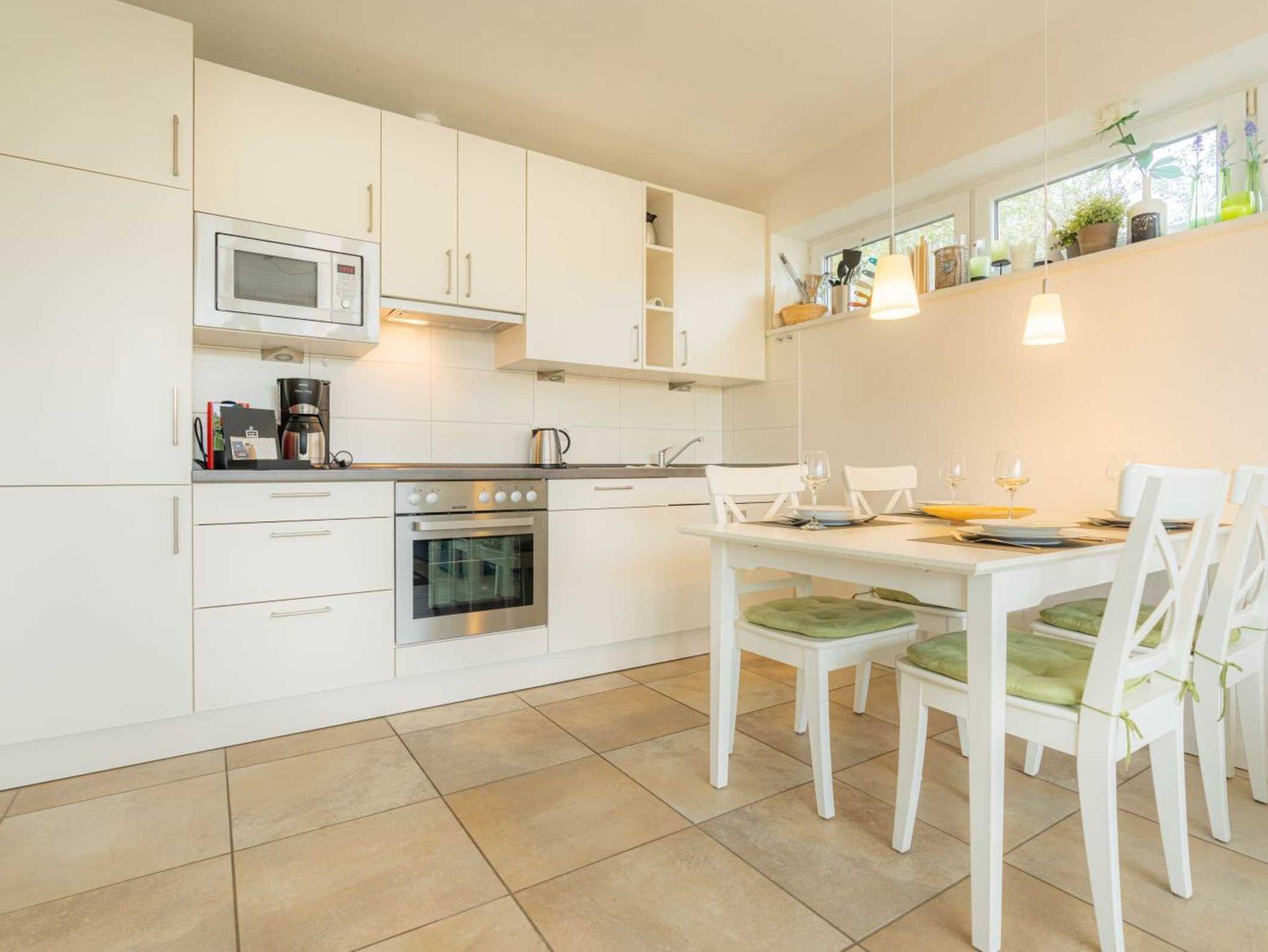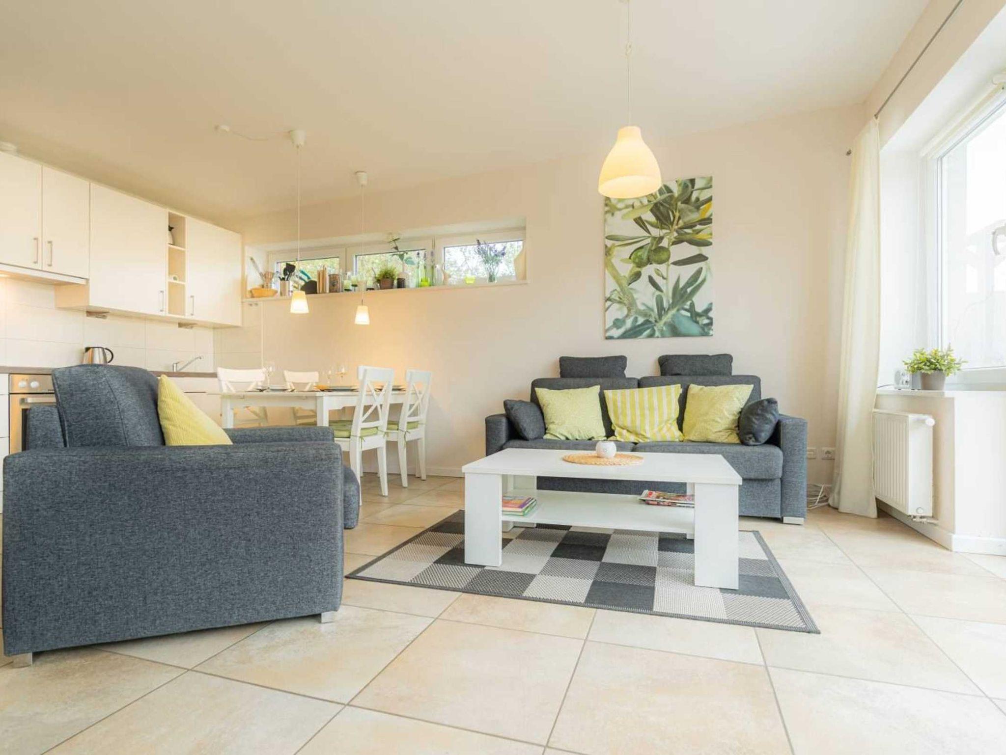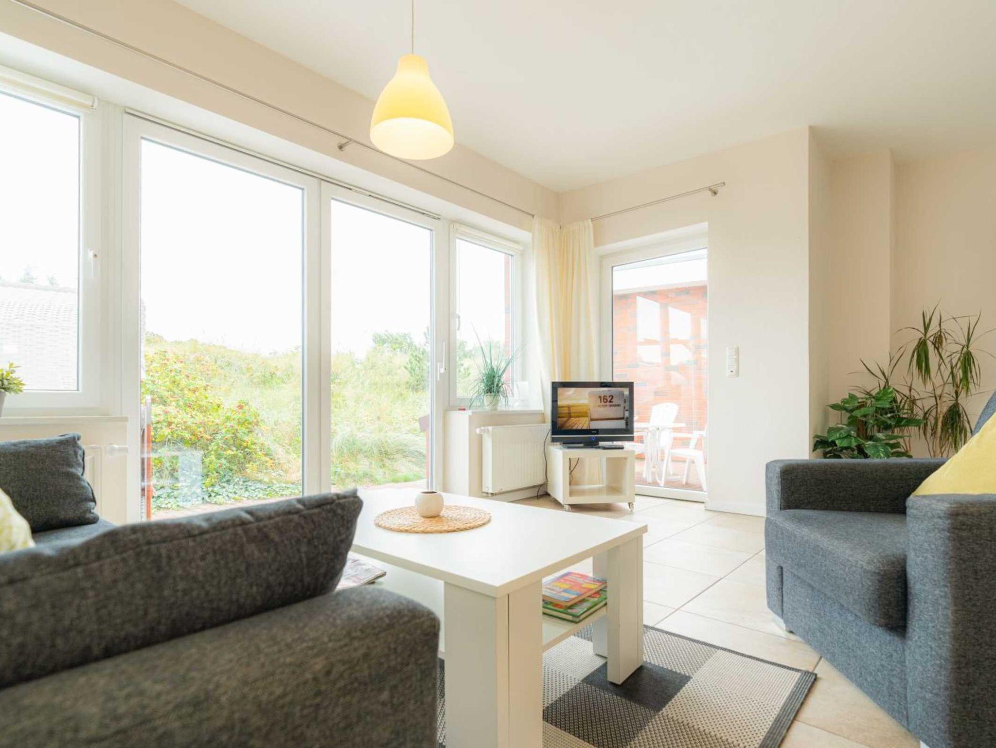 Wohnzimmer mit hochwertigem Schlafsofa (150x200cm, mit Matratzen), einem Sessel, TV (Sat), Stereo-Kompaktanlage und Esstisch für 4 Personen. Direkter Zugang zur möblierten Dünen-Terrasse nach Westen mit Strandkorb. Offene Küche mit Backofen, Mikrowelle, Geschirrspüler und Kühl-Gefrier-Kombination.