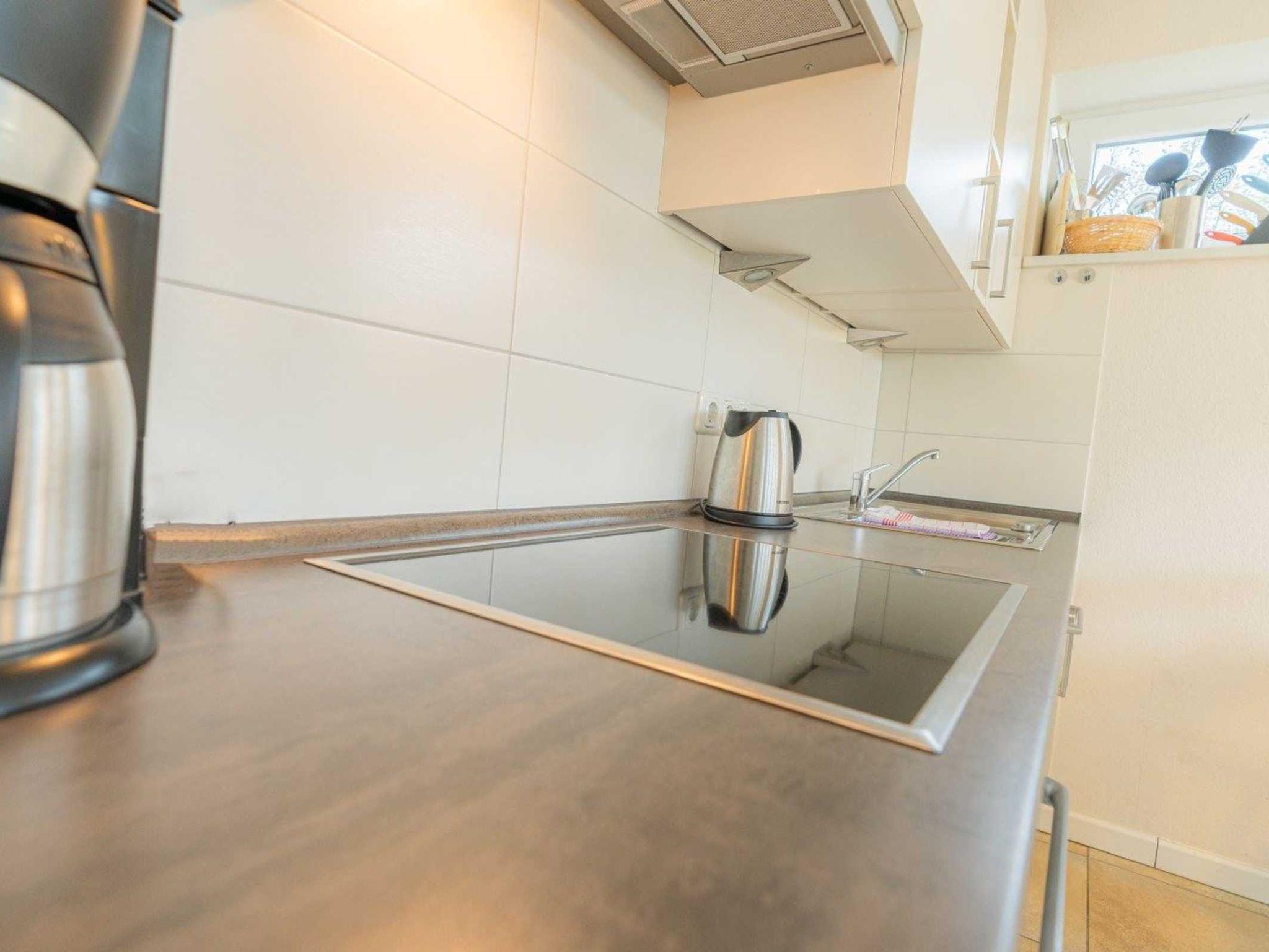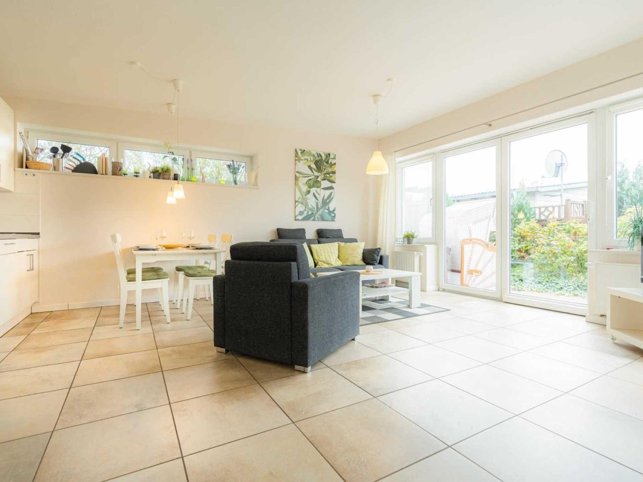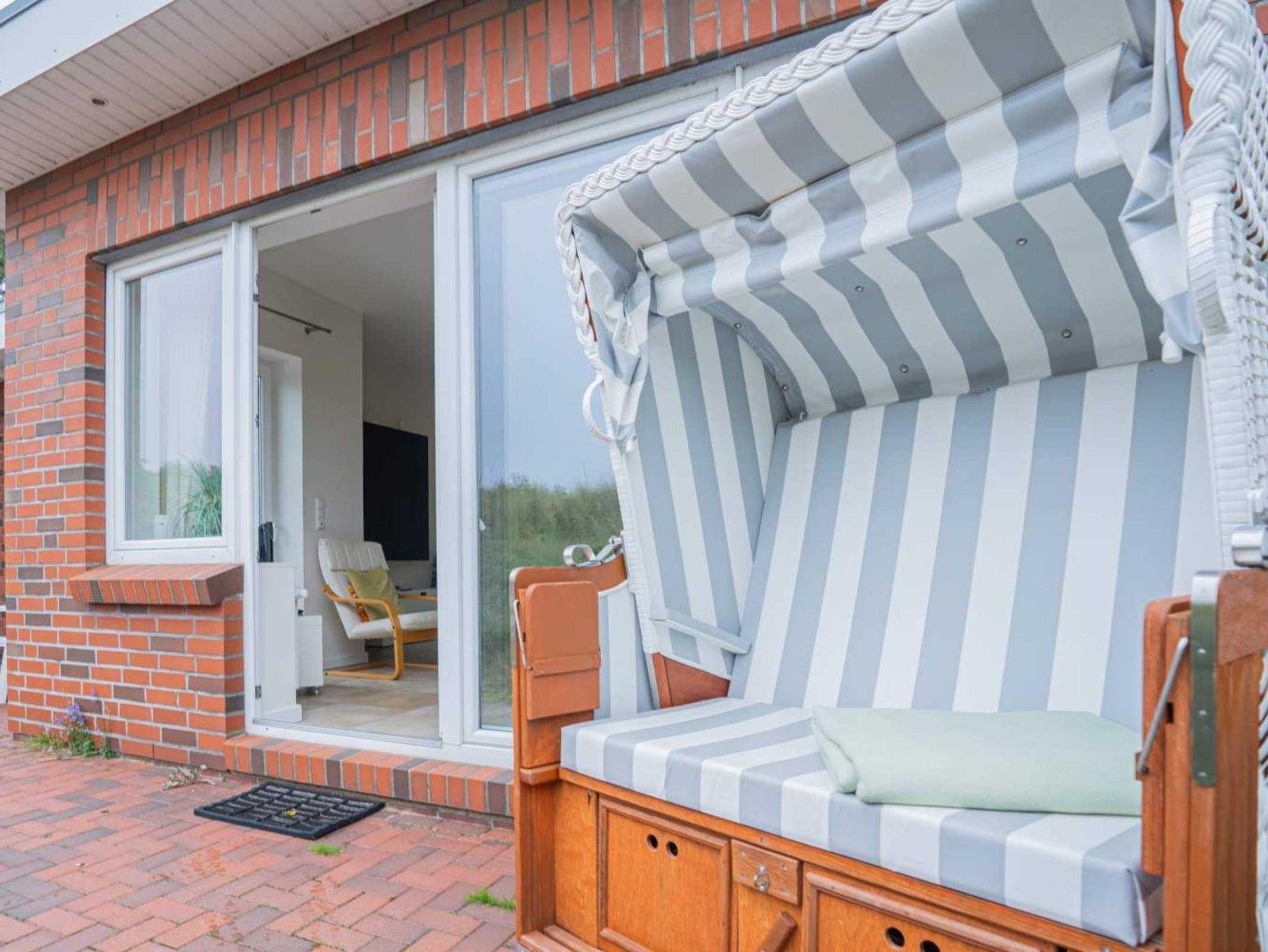 Wohnzimmer mit hochwertigem Schlafsofa (150x200cm, mit Matratzen), einem Sessel, TV (Sat), Stereo-Kompaktanlage und Esstisch für 4 Personen. Direkter Zugang zur möblierten Dünen-Terrasse nach Westen mit Strandkorb. Offene Küche mit Backofen, Mikrowelle, Geschirrspüler und Kühl-Gefrier-Kombination.