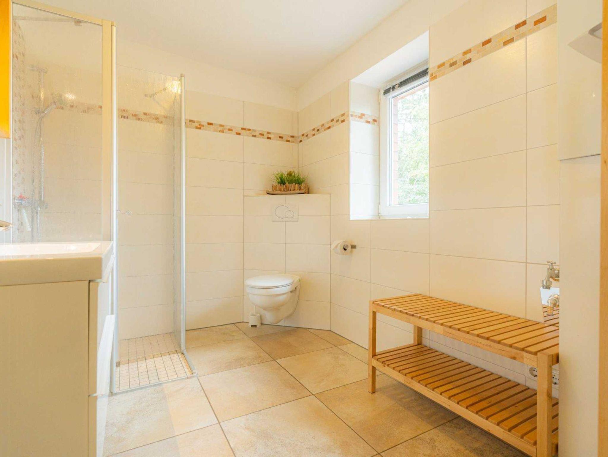 Badezimmer (Duschbad) mit bodengleicher Dusche, WC, Handtuchwärmer, Föhn, Fußbodenheizung und Tageslicht.