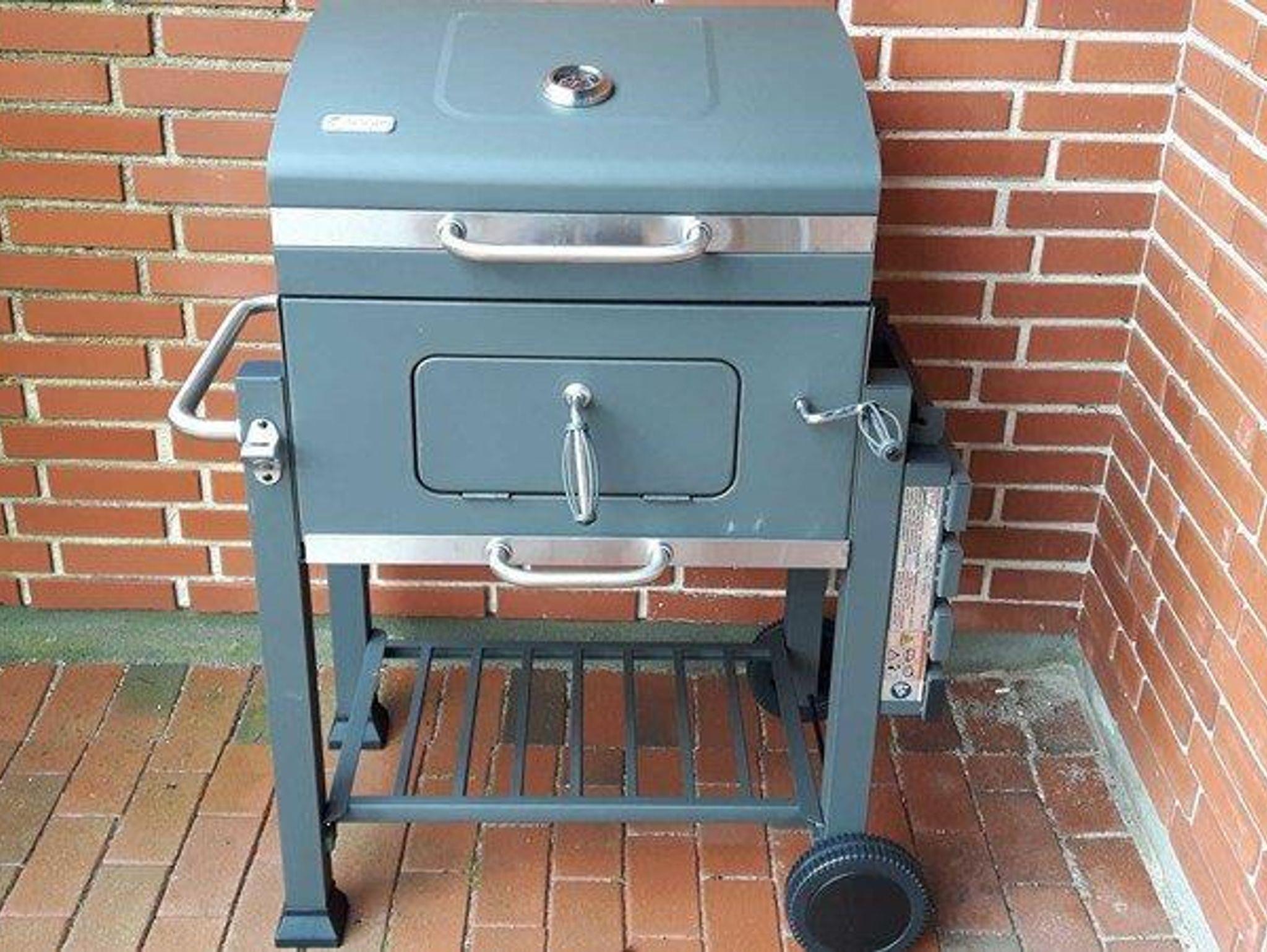 Gartenterrasse mit zwei Liegen, sechs Gartenstühlen und großem Esstisch sowie Holzkohlegrill.