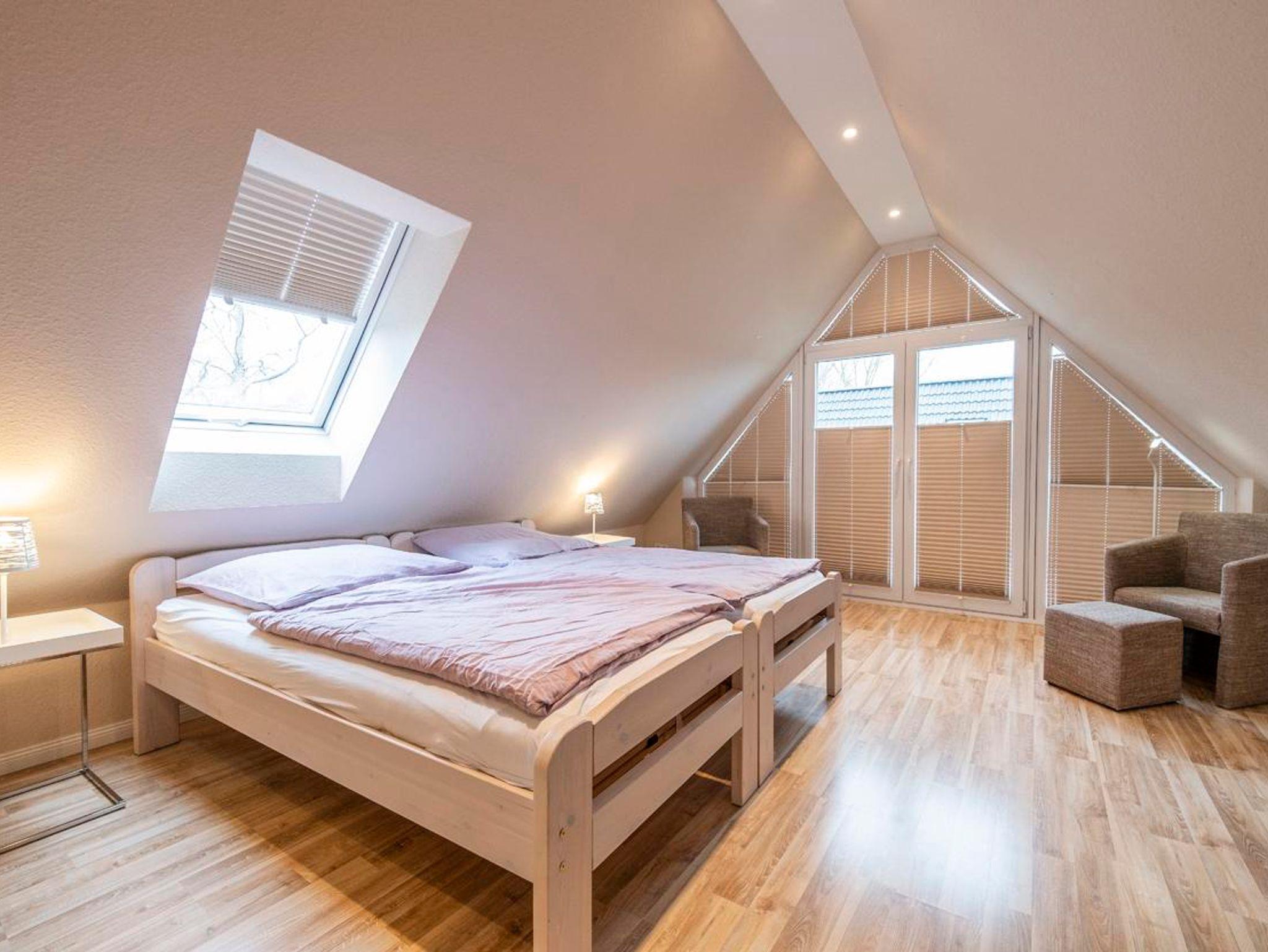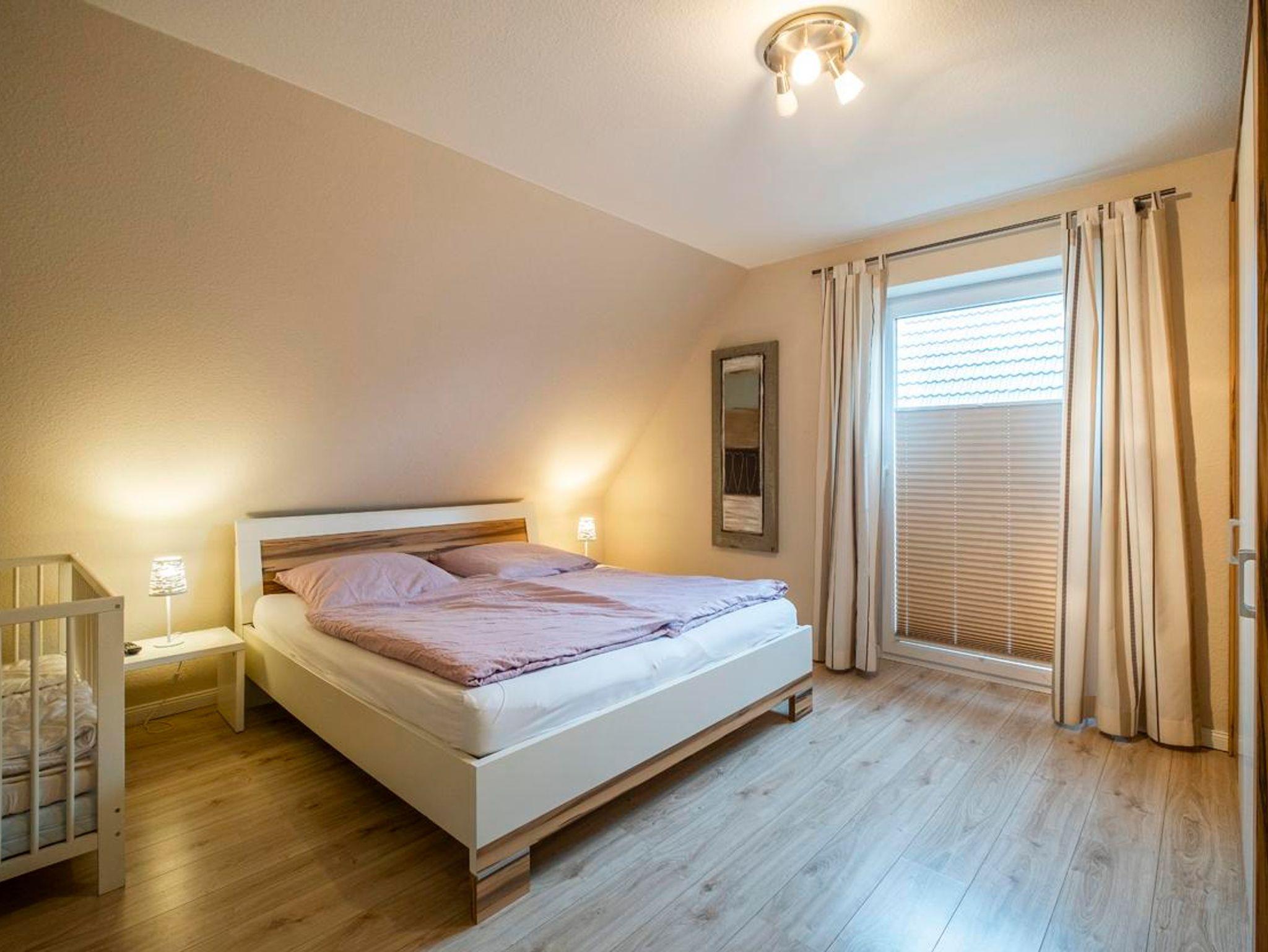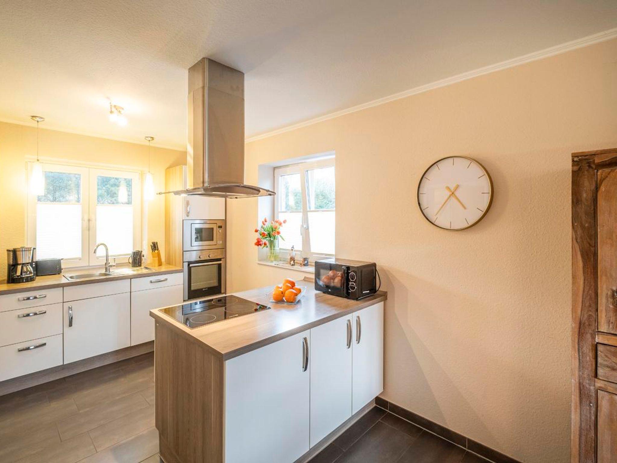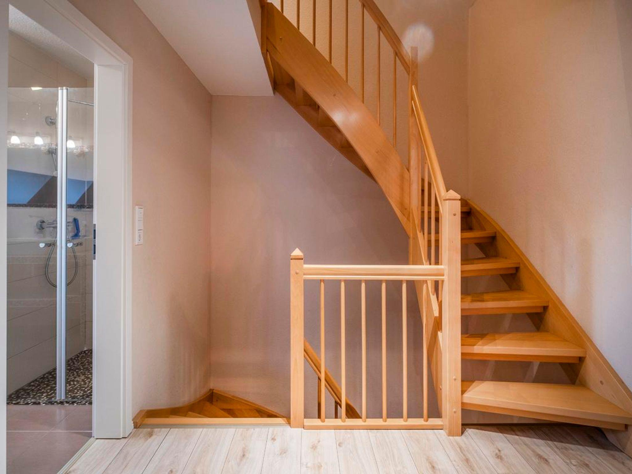 Im Erdgeschoss empfängt Sie ein großer Flur, der auch für notwendige Mitbringsel, wie z.B. einem Kinderwagen, gut Platz bietet. Die Garderobe ist großzügig ausgestattet. Im Hauswirtschaftsraum können Sie Ihre Utensilien, wie z. B. Wasser- oder Bierkasten unterstellen. Vom Flur aus erreichen Sie auch das Gäste-WC. Das Wohn-/Esszimmer ist großzügig ausgelegt. Sie können es sich auf der Wohnlandschaft gemütlich machen und der Musik aus der Stereoanlage lauschen. Für den besonderen Genuss gehört ein Full-HD-Flachbildfernseher zur Ausstattung. Zum Esszimmerbereich gehört ein Massivholztisch mit Stühlen. Wie überall im Ferienhaus finden Sie auch hier ausreichend Platz für Ihre Utensilien. Weiterhin wartet ein Kaminofen für gemütliche Stunden auf Sie. Die moderne Einbauküche ist mit allem was man benötigt ausgestattet. Sie finden eine große Geschirrspülmaschine, ein Cerankochfeld, einen Backofen, einen Mikrowellenherd, Kühlschrank, Gefrierschrank, viel Geschirr und auch viel Raum für Ihre Vorräte. Im 1. Stock finden Sie 2 Bäder. Das größere Badezimmer ist zusätzlich mit einem 2. Waschtisch und Eckbadewanne ausgestattet. Dieses Bad verfügt über ein Außenfenster in der Dachgaube. Im 2. Bad ( Veluxfenster ) finden Sie neben der Dusche Waschmaschine und Trockner. Die 2 Schlafzimmer sind geräumig. Die Betten sind 2 x 2 m . Zur Einrichtung gehört ist ein großer Schrank, eine Kommode und jeweils 1 Flachbildfernseher.Im Obergeschoss befindet sich ein großzügiges lichtdurchflutetes Studio in dem man sich wunderbar zurückziehen kann, mit 2 Einzelbetten und gemütlicher Sitzecke.
