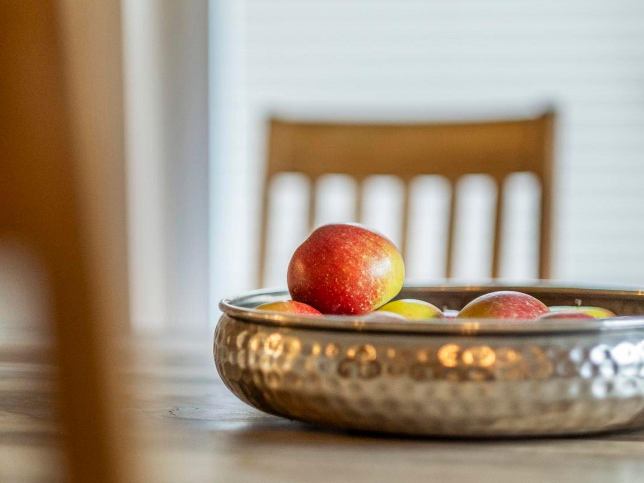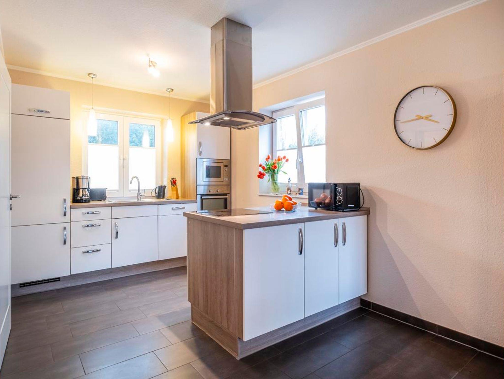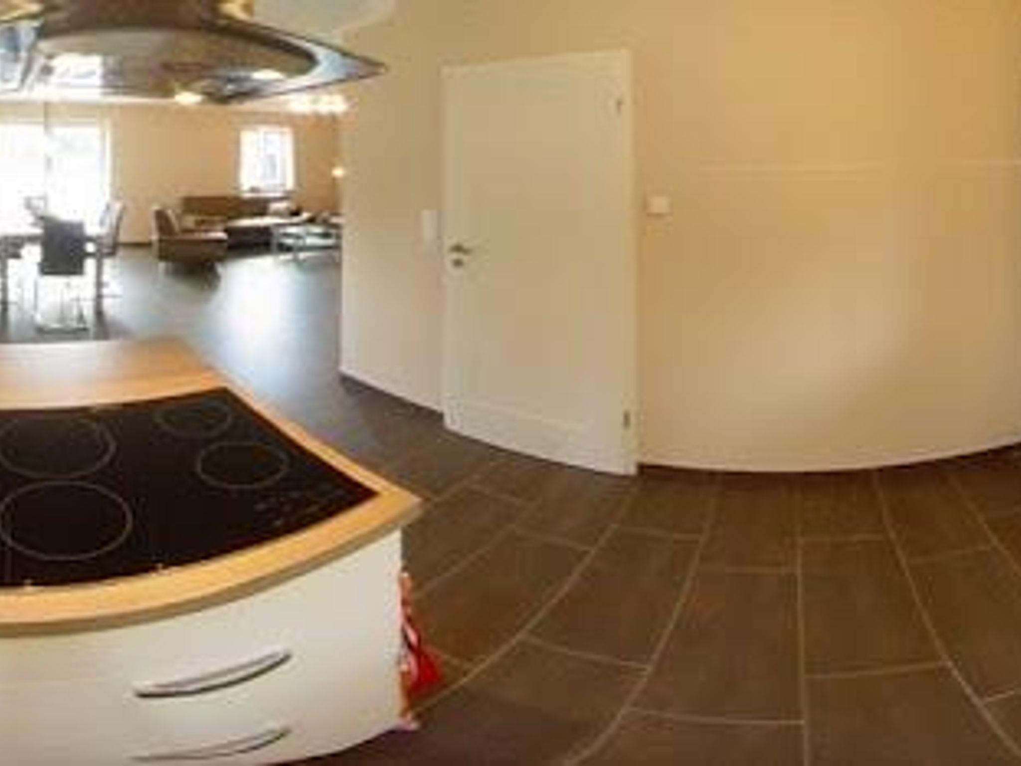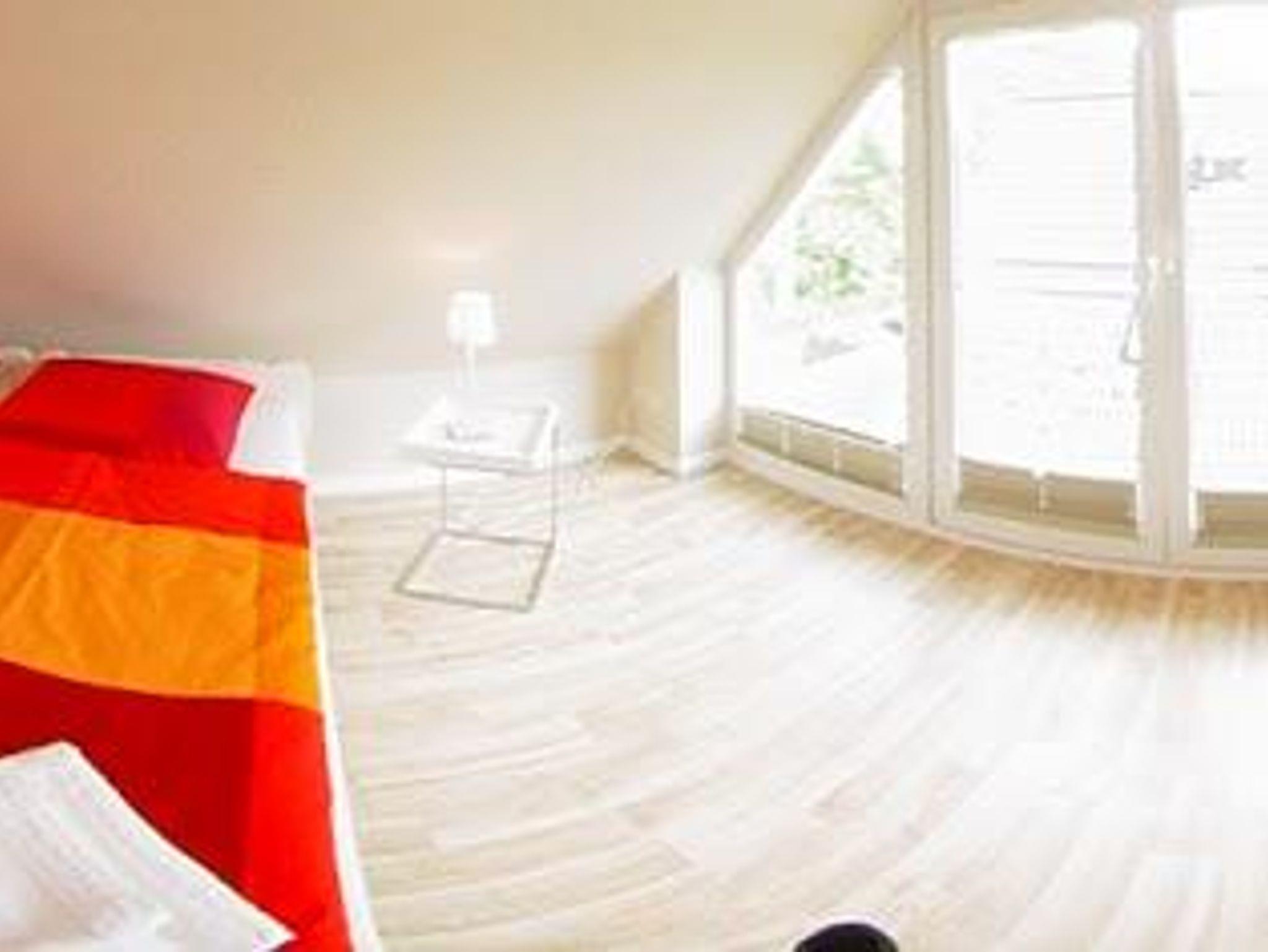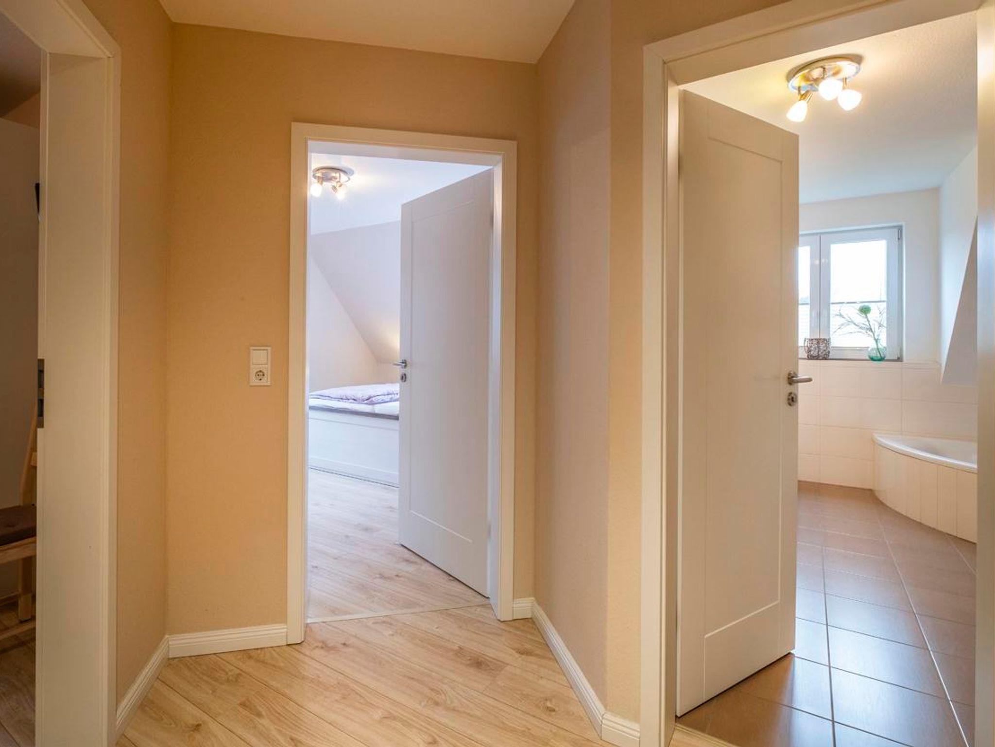 Im Erdgeschoss empfängt Sie ein großer Flur, der auch für notwendige Mitbringsel, wie z.B. einem Kinderwagen, gut Platz bietet. Die Garderobe ist großzügig ausgestattet. Im Hauswirtschaftsraum können Sie Ihre Utensilien, wie z. B. Wasser- oder Bierkasten unterstellen. Vom Flur aus erreichen Sie auch das Gäste-WC. Das Wohn-/Esszimmer ist großzügig ausgelegt. Sie können es sich auf der Wohnlandschaft gemütlich machen und der Musik aus der Stereoanlage lauschen. Für den besonderen Genuss gehört ein Full-HD-Flachbildfernseher zur Ausstattung. Zum Esszimmerbereich gehört ein Massivholztisch mit Stühlen. Wie überall im Ferienhaus finden Sie auch hier ausreichend Platz für Ihre Utensilien. Weiterhin wartet ein Kaminofen für gemütliche Stunden auf Sie. Die moderne Einbauküche ist mit allem was man benötigt ausgestattet. Sie finden eine große Geschirrspülmaschine, ein Cerankochfeld, einen Backofen, einen Mikrowellenherd, Kühlschrank, Gefrierschrank, viel Geschirr und auch viel Raum für Ihre Vorräte. Im 1. Stock finden Sie 2 Bäder. Das größere Badezimmer ist zusätzlich mit einem 2. Waschtisch und Eckbadewanne ausgestattet. Dieses Bad verfügt über ein Außenfenster in der Dachgaube. Im 2. Bad ( Veluxfenster ) finden Sie neben der Dusche Waschmaschine und Trockner. Die 2 Schlafzimmer sind geräumig. Die Betten sind 2 x 2 m . Zur Einrichtung gehört ist ein großer Schrank, eine Kommode und jeweils 1 Flachbildfernseher.Im Obergeschoss befindet sich ein großzügiges lichtdurchflutetes Studio in dem man sich wunderbar zurückziehen kann, mit 2 Einzelbetten und gemütlicher Sitzecke.