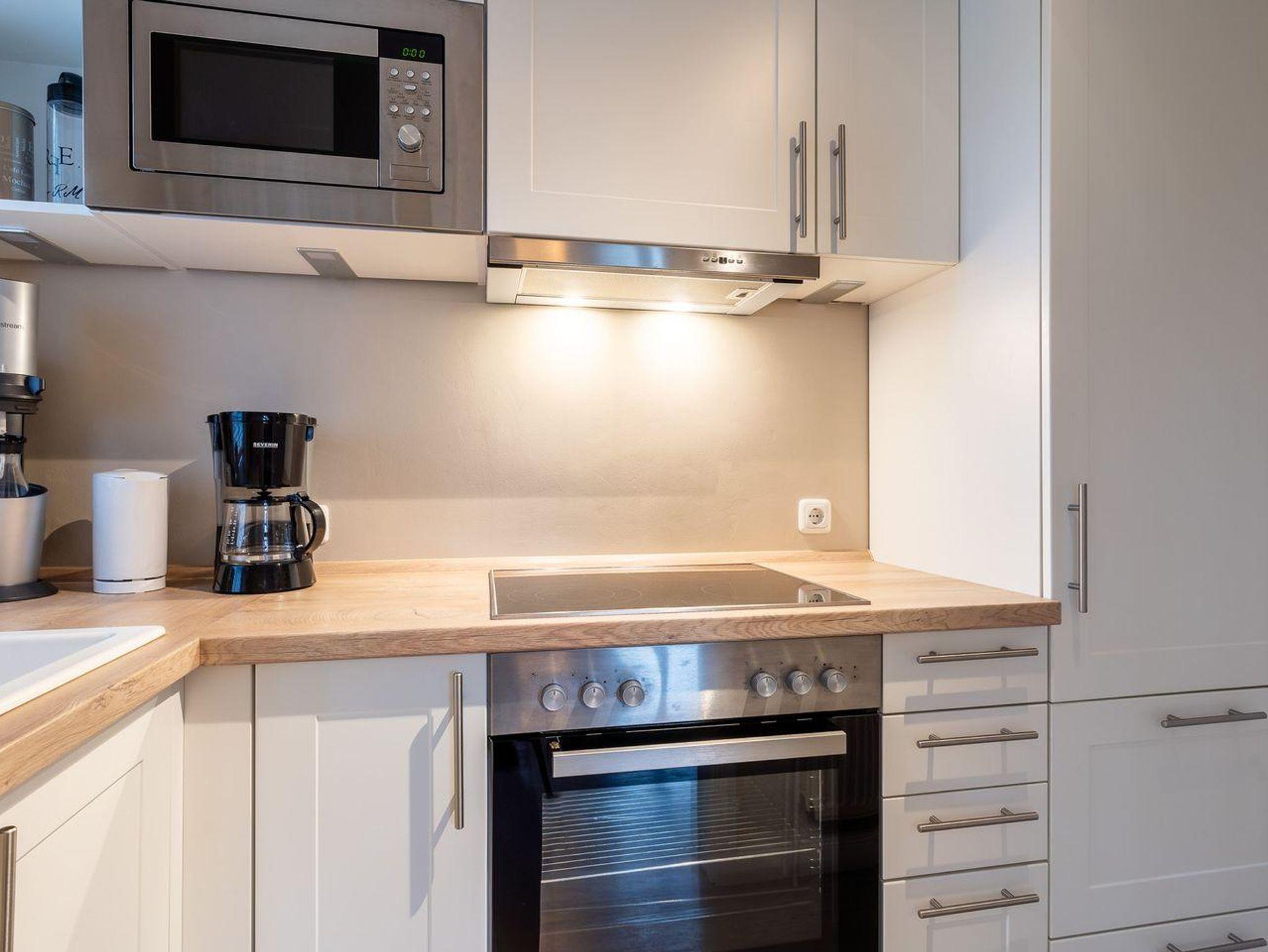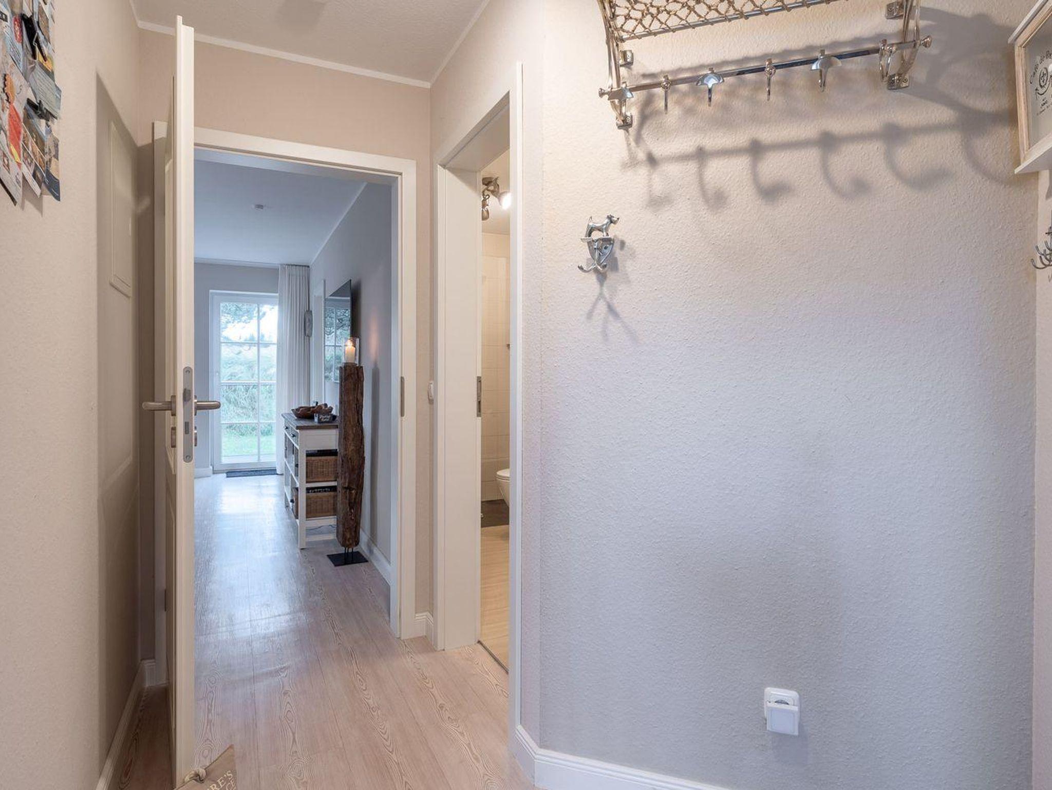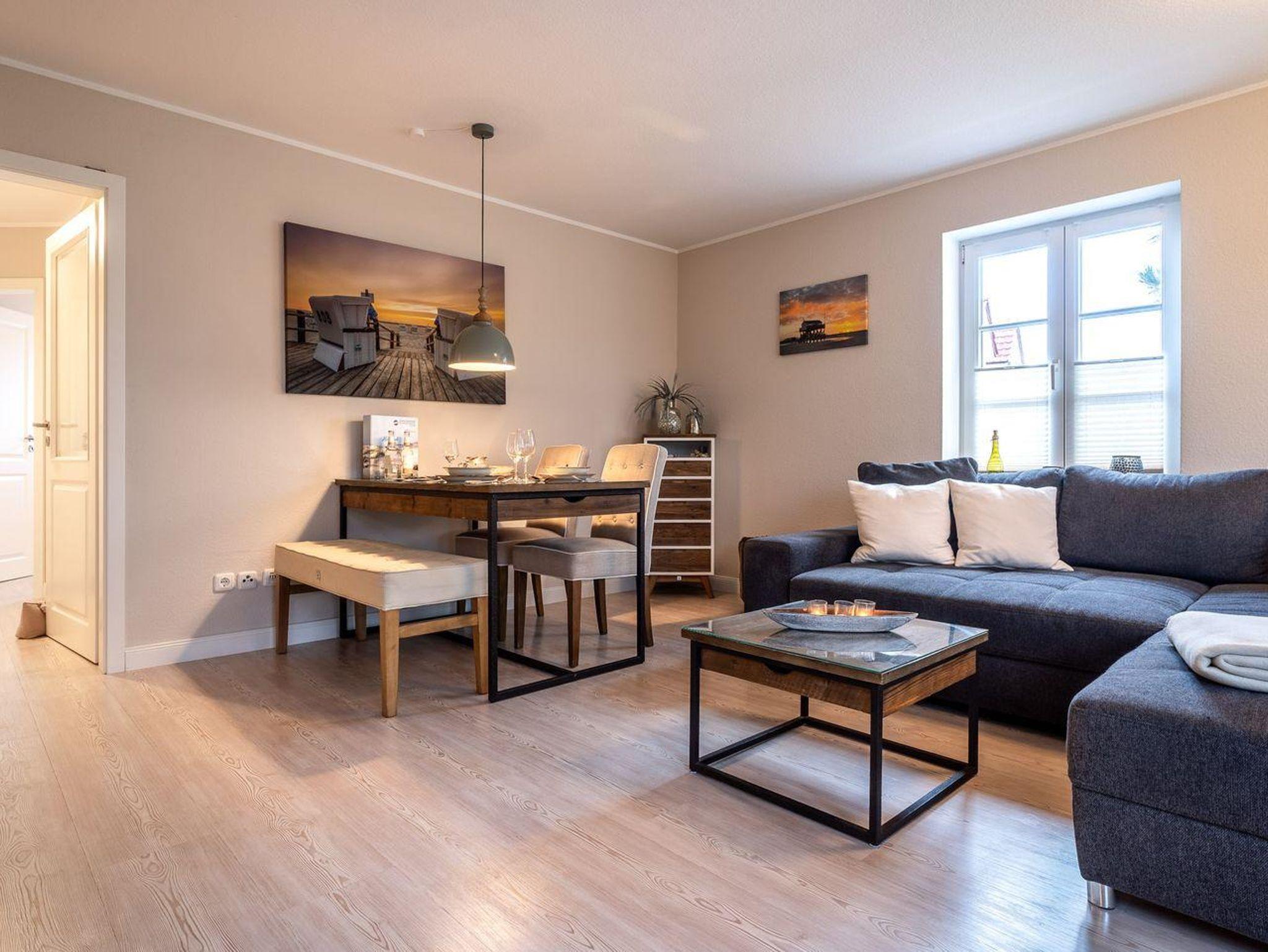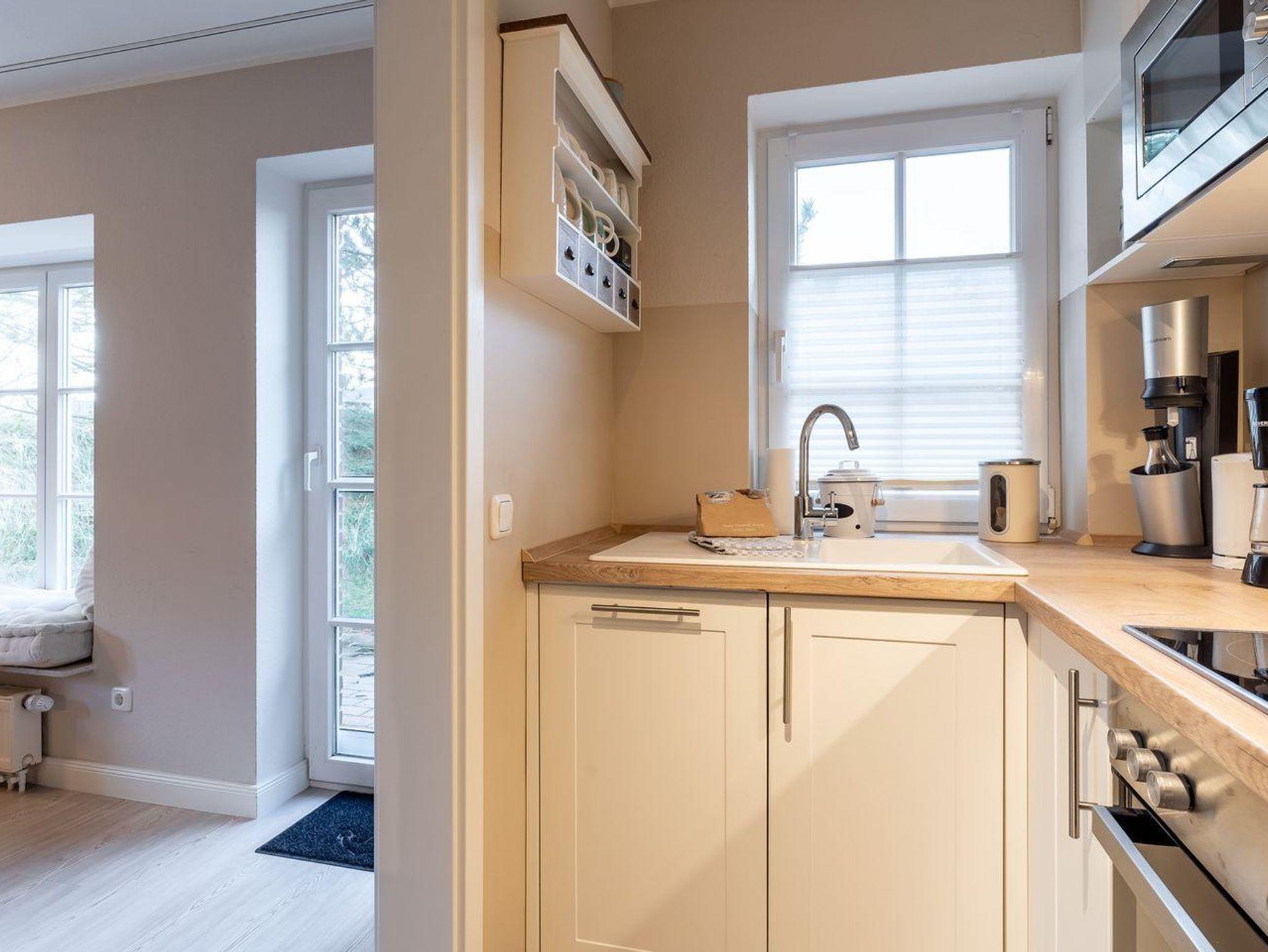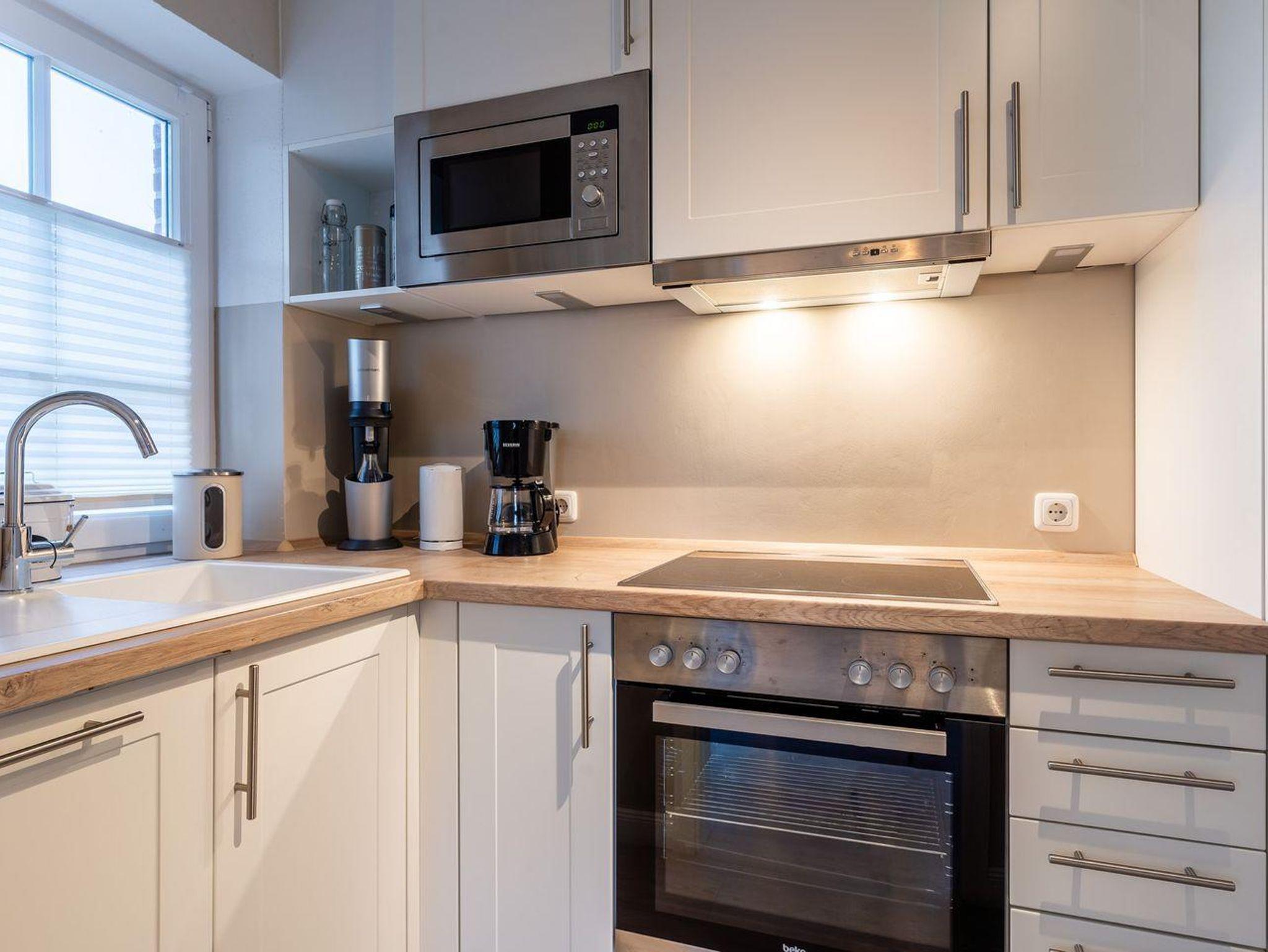Die Ferienwohnung besticht durch helle, maritime Materialien und einen offenen Wohn- und Essbereich, der direkt auf die sonnige Südterrasse führt. Hier erwartet Sie ein Strandkorb und ein kleiner Gartenanteil – perfekt, um die frische Nordseeluft zu genießen. Die angrenzende, moderne Küche ist komplett ausgestattet, unter anderem mit einem 4-Platten-Cerankochfeld, Backofen, Mikrowelle und Geschirrspüler, sodass Sie auch kulinarisch verwöhnt werden.