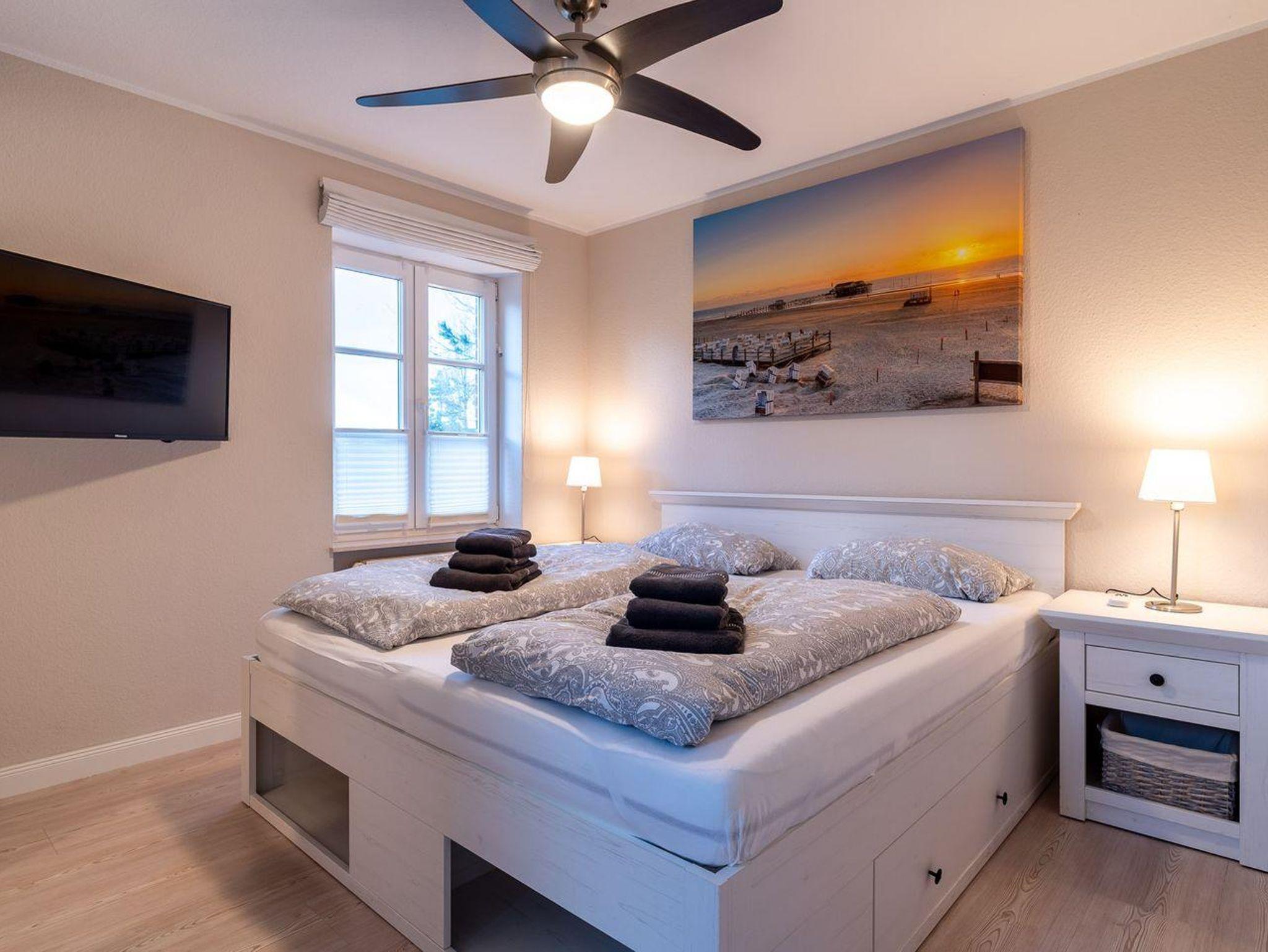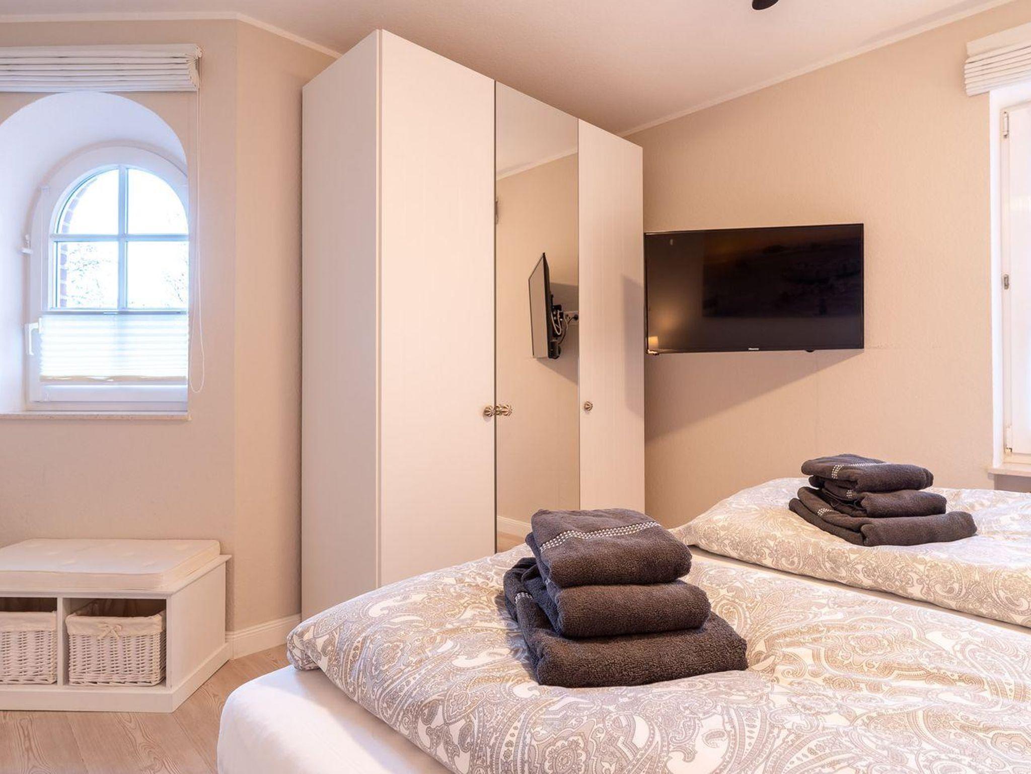 Im separaten Schlafzimmer mit einem komfortablen Doppelbett (2 x 90 x 200 cm) finden Sie Ruhe und Erholung. Das moderne Duschbad verfügt über eine bodengleiche Dusche und ist ebenfalls hochwertig ausgestattet. WLAN ist vorhanden, ebenso ein TV im Wohnzimmer und ein weiterer im Schlafzimmer.