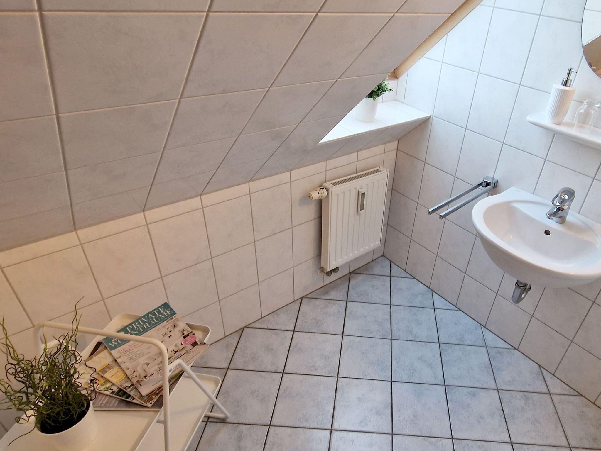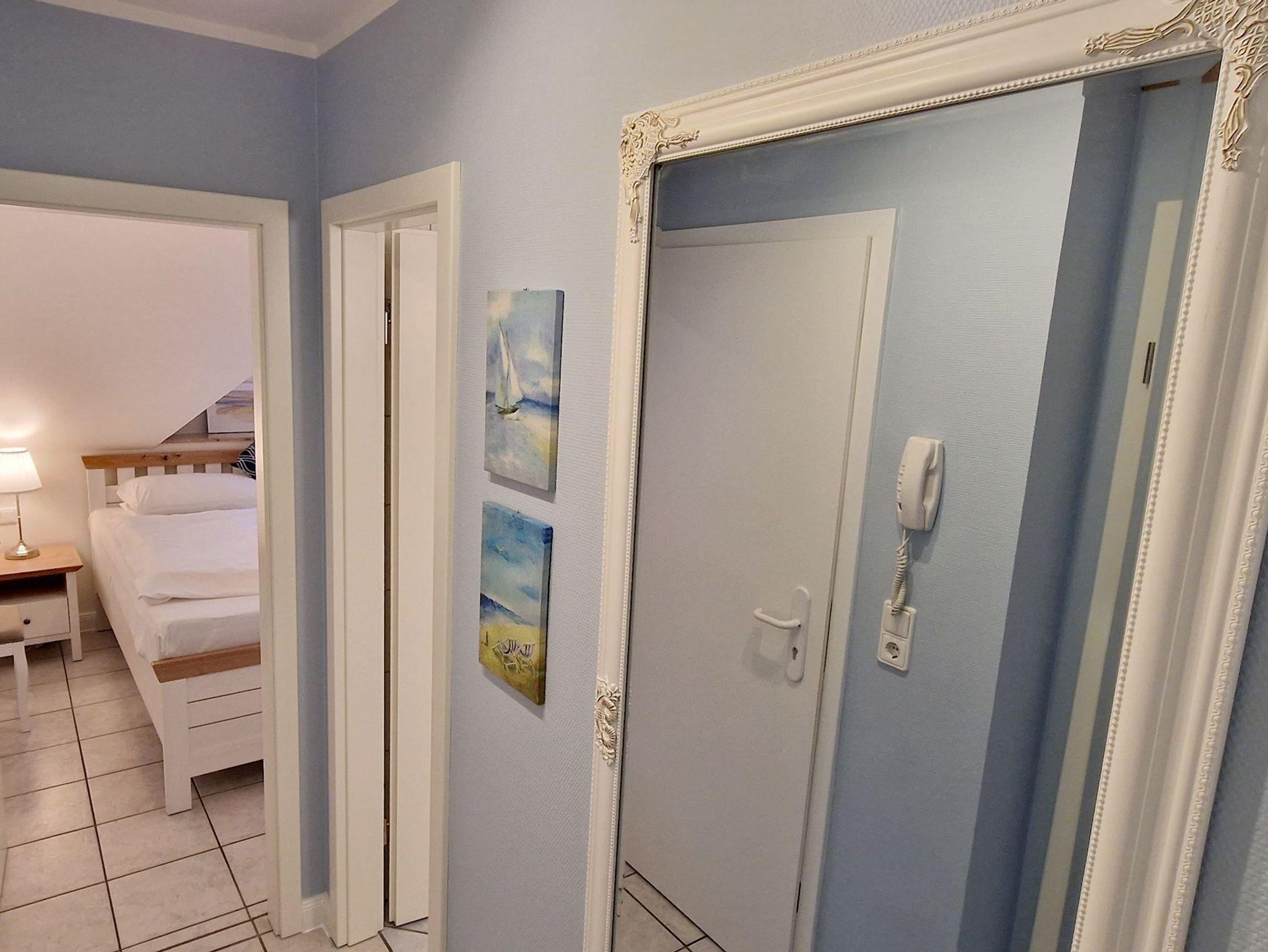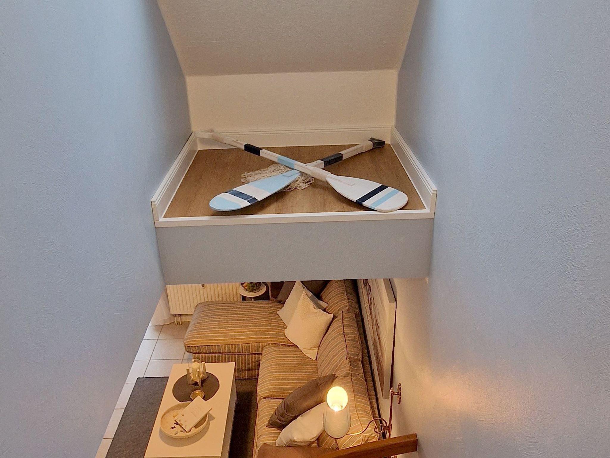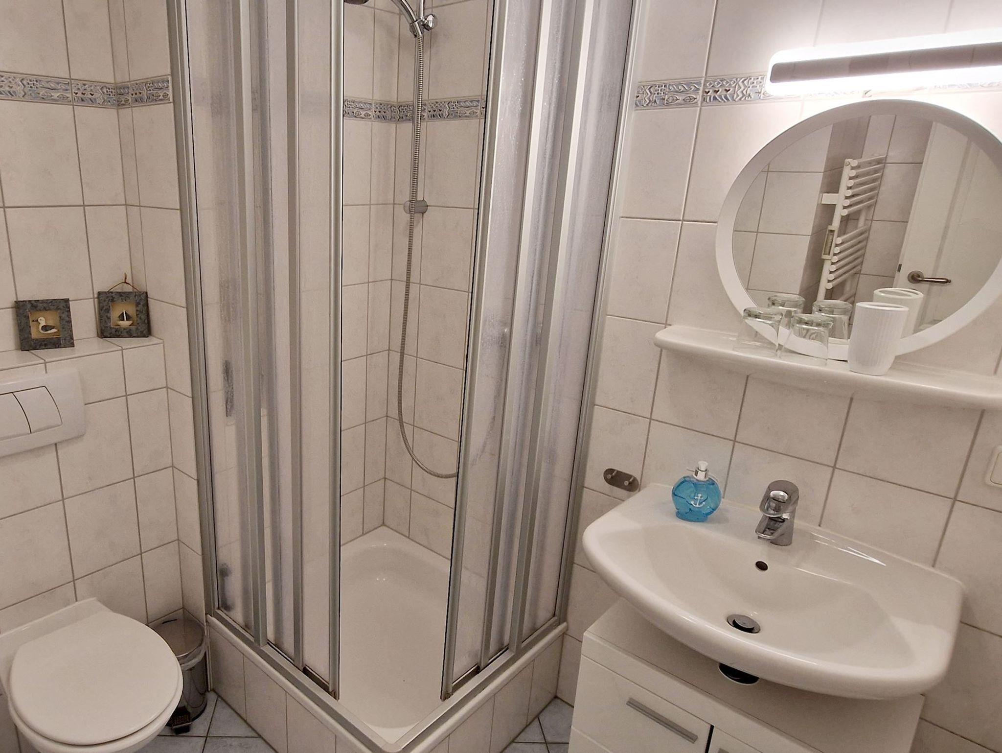Gemütliches Wohnen über 2 Ebenen Diese moderne, neu eingerichtete 3-Zimmer Ferienwohnung ist für 4 Personen über 2 Etagen. Die Ferienwohnung in St. Peter-Bad ist liebevoll und gemütlich eingerichtet. Die maritim eingerichtete Ferienwohnung verfügt über einen modernen Wohn-/Essbereich mit zwei nach Süd-West ausgerichteten Balkonen. Der Ausblick auf das gegenüberliegende Waldgrundstück bietet trotz der zentralen Lage im Herzen des Ortsteils ?Bad? absolute Ruhe und Privatsphäre. Die neue, voll ausgestattete Küchenzeile verfügt über ein Induktionskochfeld, eine Spülmaschine, Kühl-Gefrier-Kombination, Mikrowelle und einen Backofen. Im 1. OG ist ein Schlafzimmer mit Doppelbett, das Duschbad und der Wohn-Essbereich. Im DG steht ein Doppelbett, einschiebbar zu einem Bett, und ein Fernseher. Der Clou: Oben gibt es noch ein weiteres kleines Bad mit WC und einen zweiten großen Balkon. Genießen sie die Zeit auf den beiden sonnigen möblierten Balkonen in südwestlicher Ausrichtung. Auch technisch ist die Wohnung modern ausgestattet. WLAN ist selbstverständlich inklusive, beide Flachbildfernseher verfügen über HDMI- und USB- Schnittstellen, ein TV ist ein Smart-TV. Kinderreisebett und Hochstuhl sind kostenlos vorhanden. Rauchen und Haustiere sind nicht erlaubt. Ein Pkw-Stellplatz auf dem Grundstück Nr. 7 und ein überdachter Fahrradständer hinter dem Haus stehen zur Verfügung.