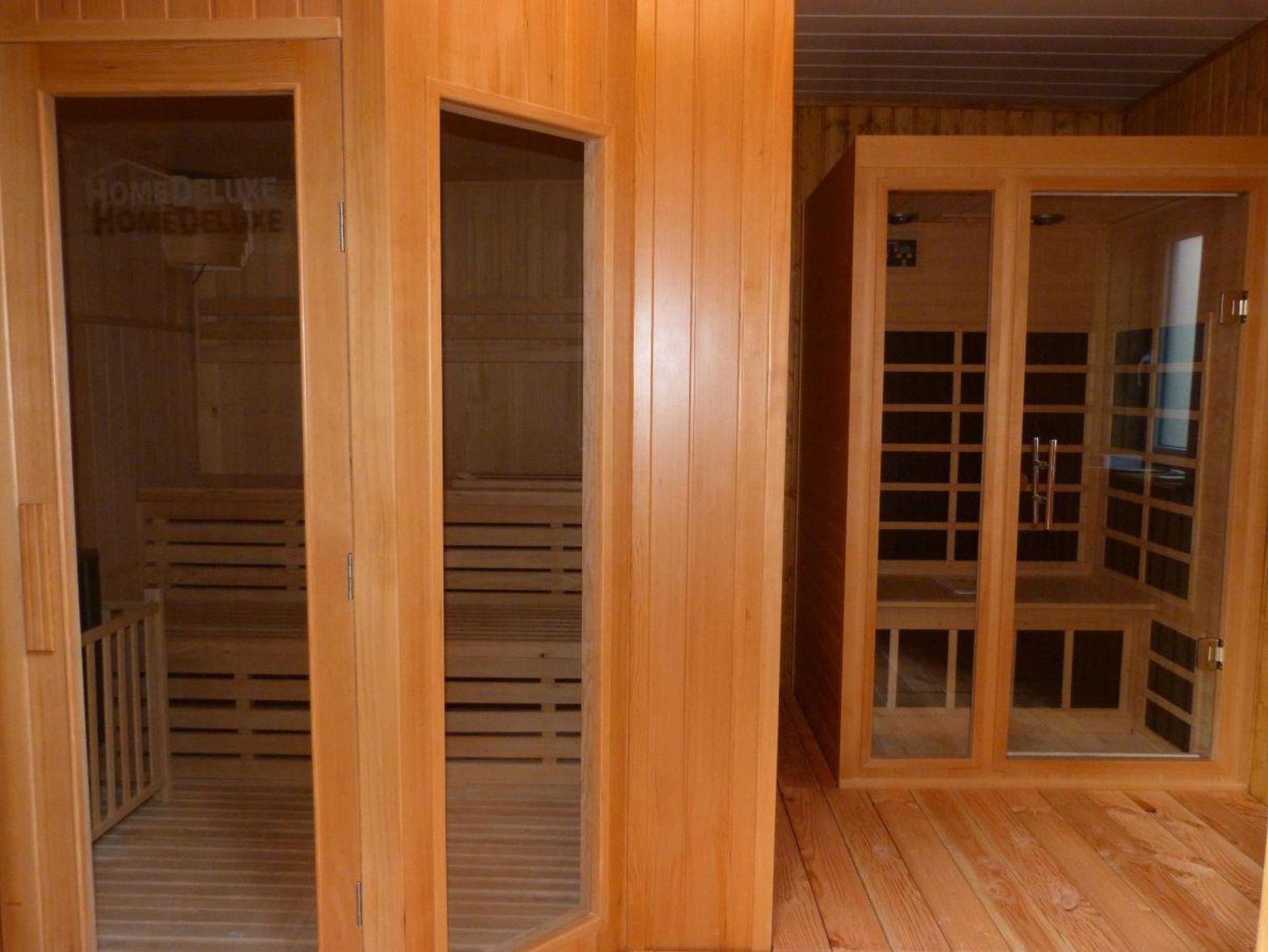 Im Gartenhaus befindet sich ein Wellnessbereich mit Sauna und Infrarotkabine. Zudem befindet sich eine Badewanne mit Whirlpoolfunktion im Badezimmer des Obergeschosses.
