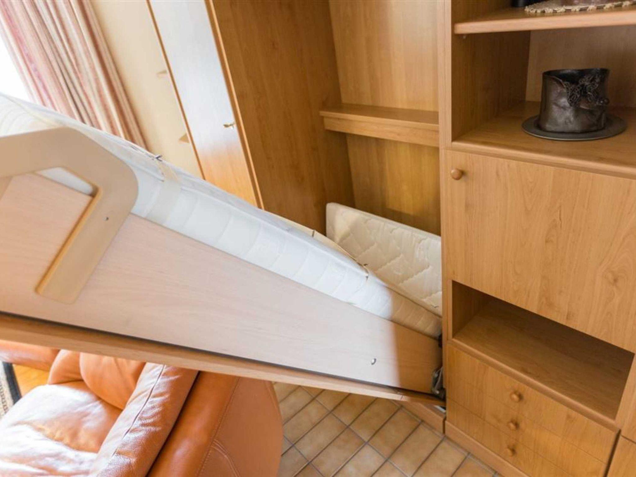 Wohn-/Schlafzimmer mit ausklappbarem Schrank-Einzelbett (90x200cm), Sofa für 2 Personen, 2 Sesseln, TV (Sat), Radio und Esstisch mit 4 Stühlen. Direkter Zugang zum möblierten Südbalkon mit Meeresblick. Offene Küche mit Backofen, Geschirrspüler und Kühlschrank mit Gefrierfach. Keine Mikrowelle.