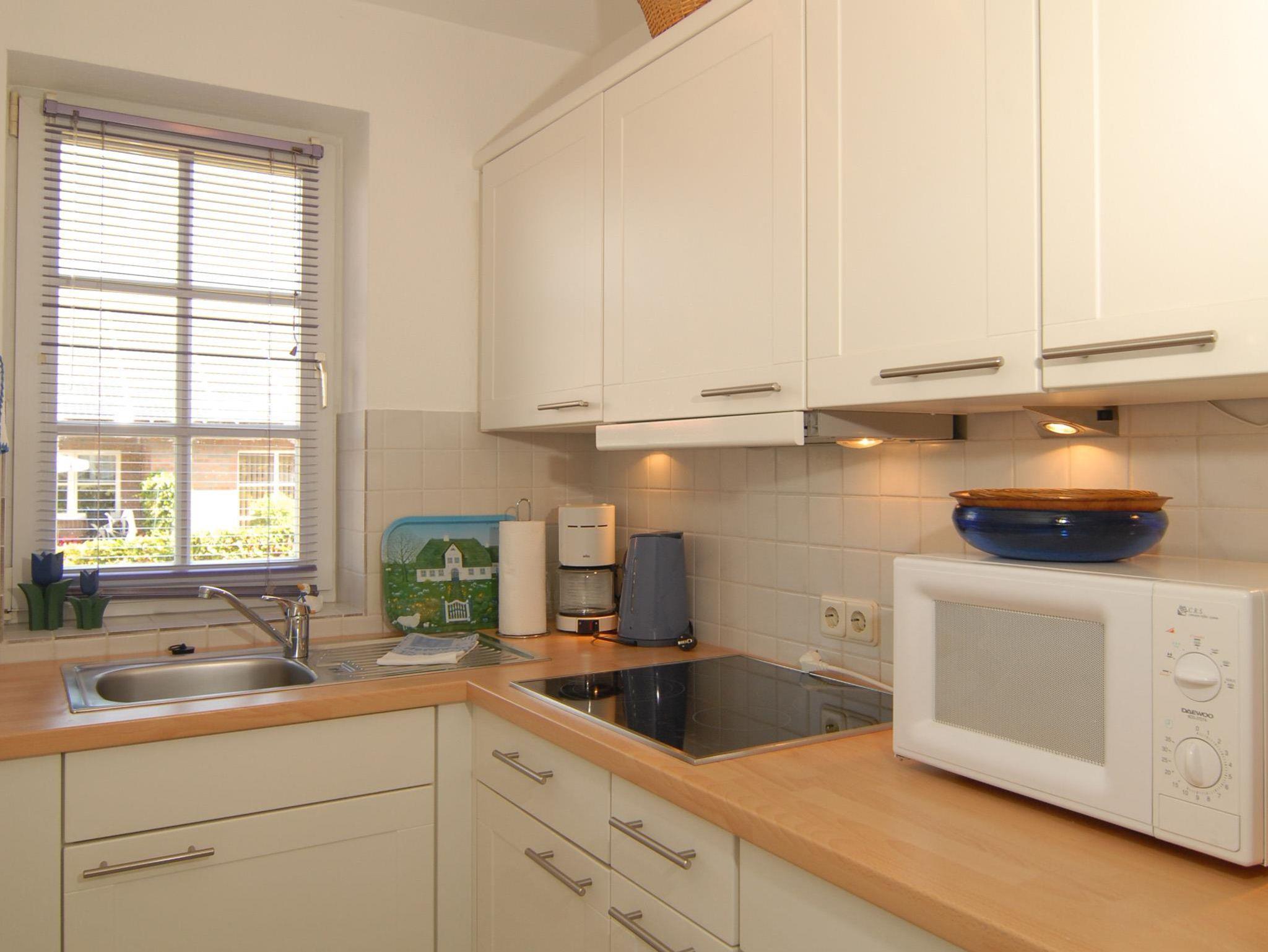Küche: Einbauküche, 4 Plattenherd mit Ceranfeld, Dunstabzugshaube, Kühlschrank, Mikrowelle, Kaffeemaschine, Wasserkocher, Toaster, Handmixer, Geschirr, Kochtöpfe