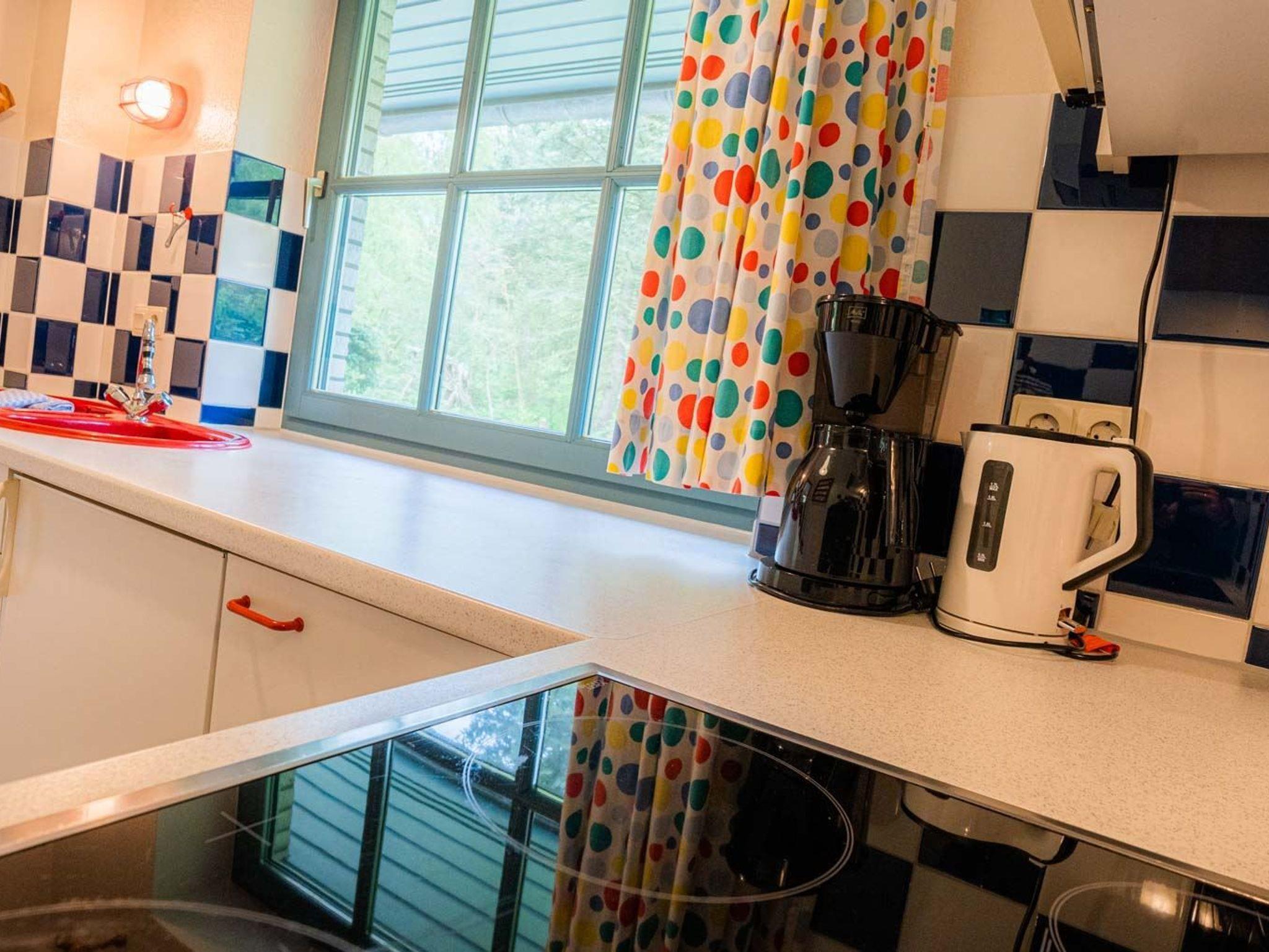 Separate Küche mit Backofen, Mikrowelle, Geschirrspüler und Kühlschrank mit Gefrierfach.