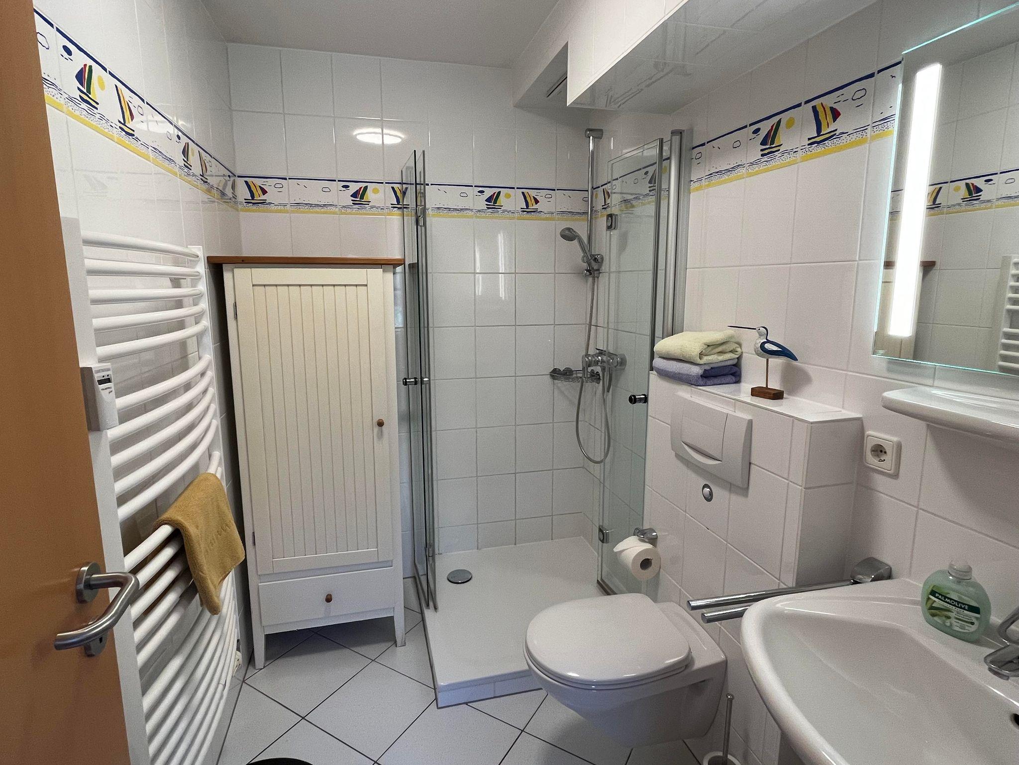 Das Duschbad mit WC wurde erst kürzlich renoviert. Die Dusche verfügt über einen sehr flachen Einstieg. Ein großer Handtuchheizkörper sorgt dafür, dass auch bei kalten Temperaturen eine behagliche Wärme erzeugt wird. Das Bad ist hell eingerichtet und verfügt über ausreichend Ablageflächen.