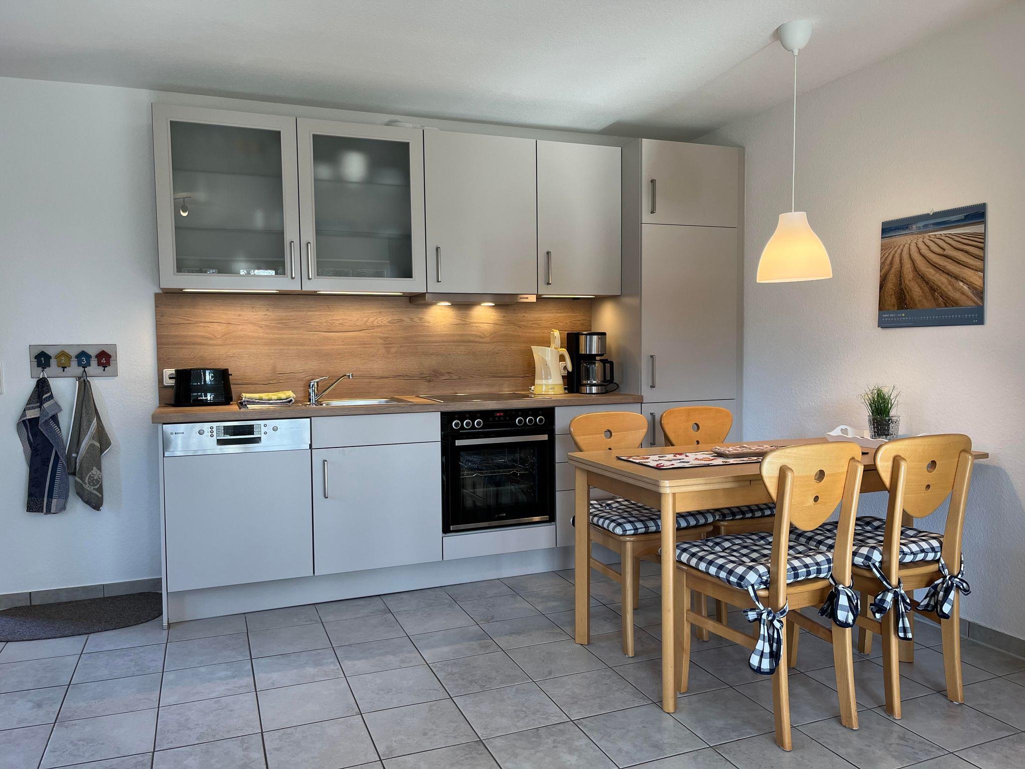 Die zum Wohnzimmer offene Küche ist mit einem Elektroherd mit Backofen, Kühlschrank mit Gefrierfach, Spülmaschine, Wasserkocher, Kaffeemaschine & Toaster ausgestattet. Selbstverständlich sind ausreichend Gläser und Geschirr/Töpfe/Pfannen sowie die üblichen Utensilien einer Küche vorhanden. Da wir die Wohnung auch selbst nutzen, dürfte es Ihnen an nichts fehlen!