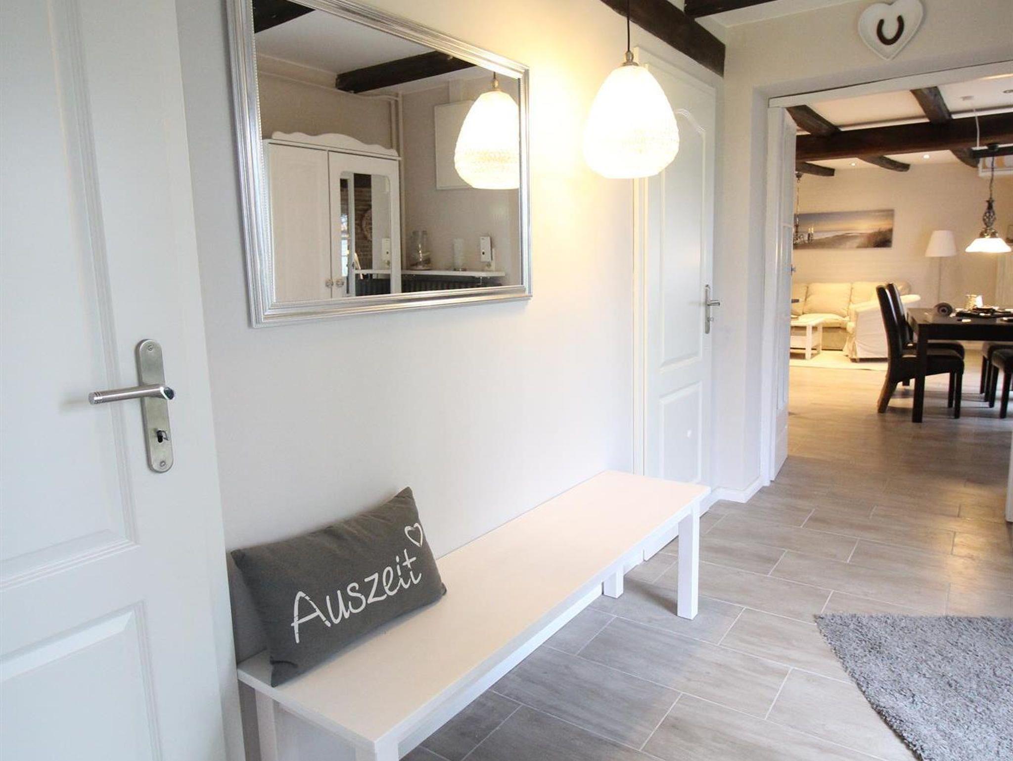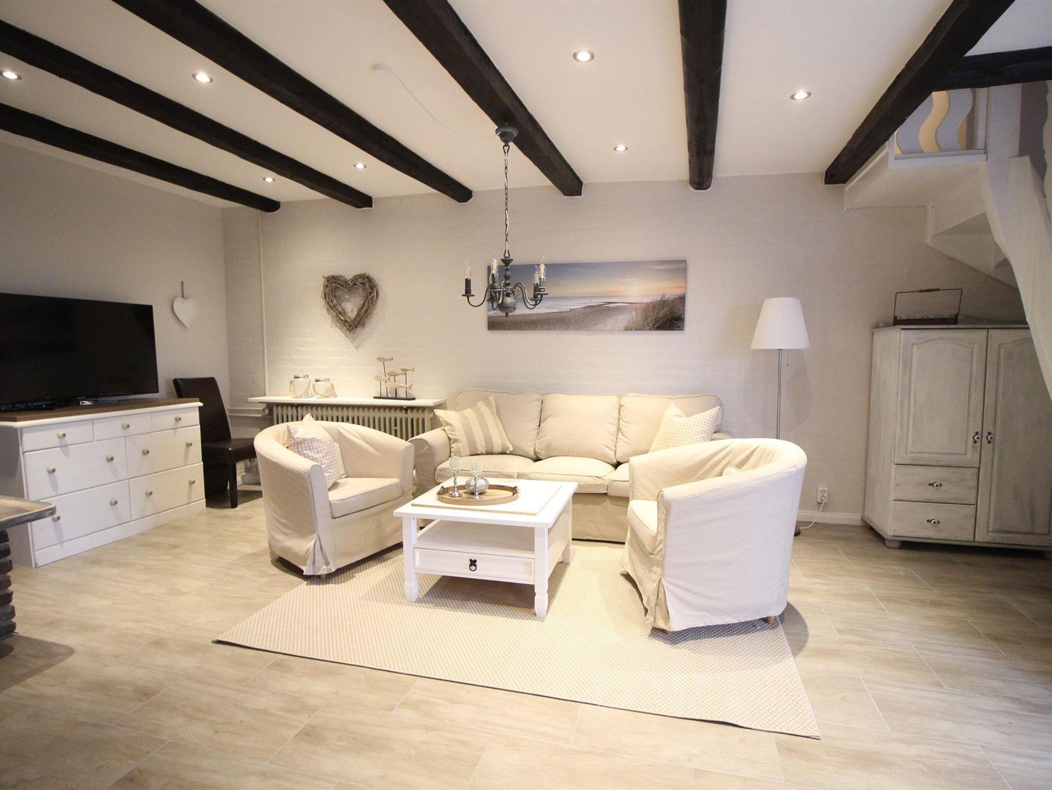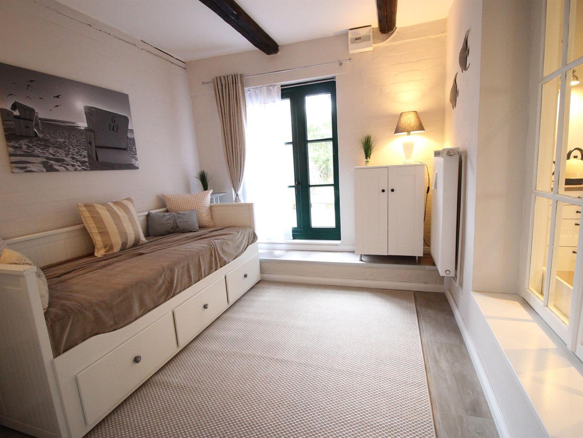Die gerade renovierte Wohnung besteht im Erdgeschoss aus einem Wohn- und Esszimmer mit integrierter Küche, sowie einem kleineren Schlafzimmer mit ausziehbarem Doppelbett (1,60m, Hemnes). Über die Diele gelangen Sie in das Badezimmer. Vom Wohnzimmer aus haben Sie Zugang auf die Terrasse. Bei dem Kamin handelt es sich um einen Zierkamin.
