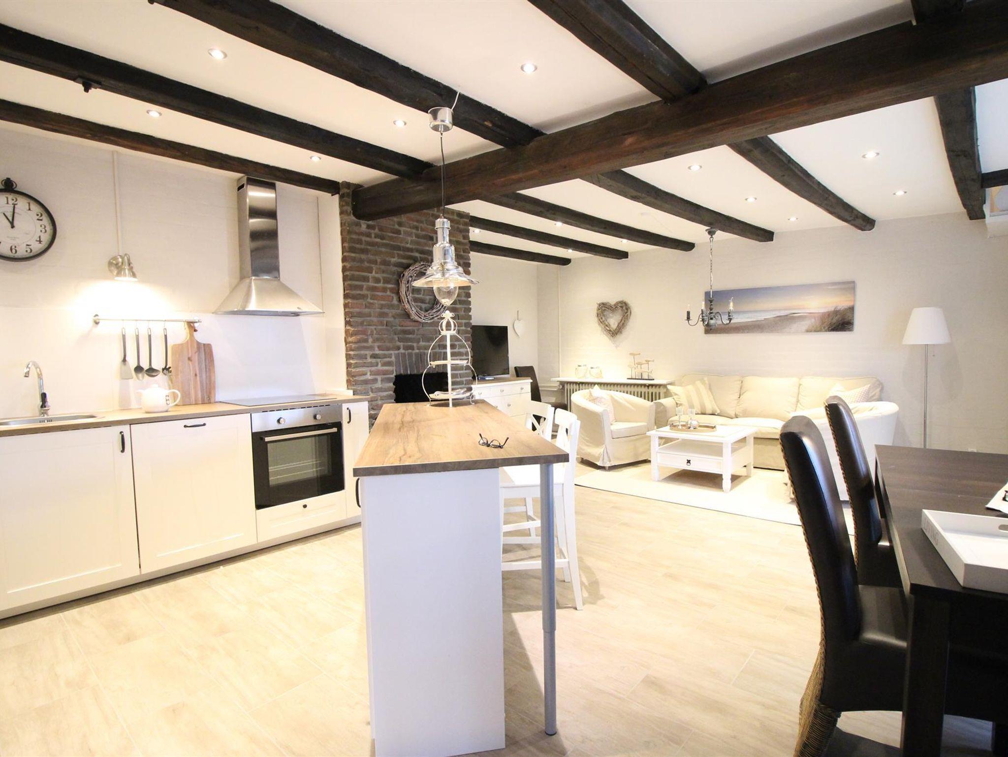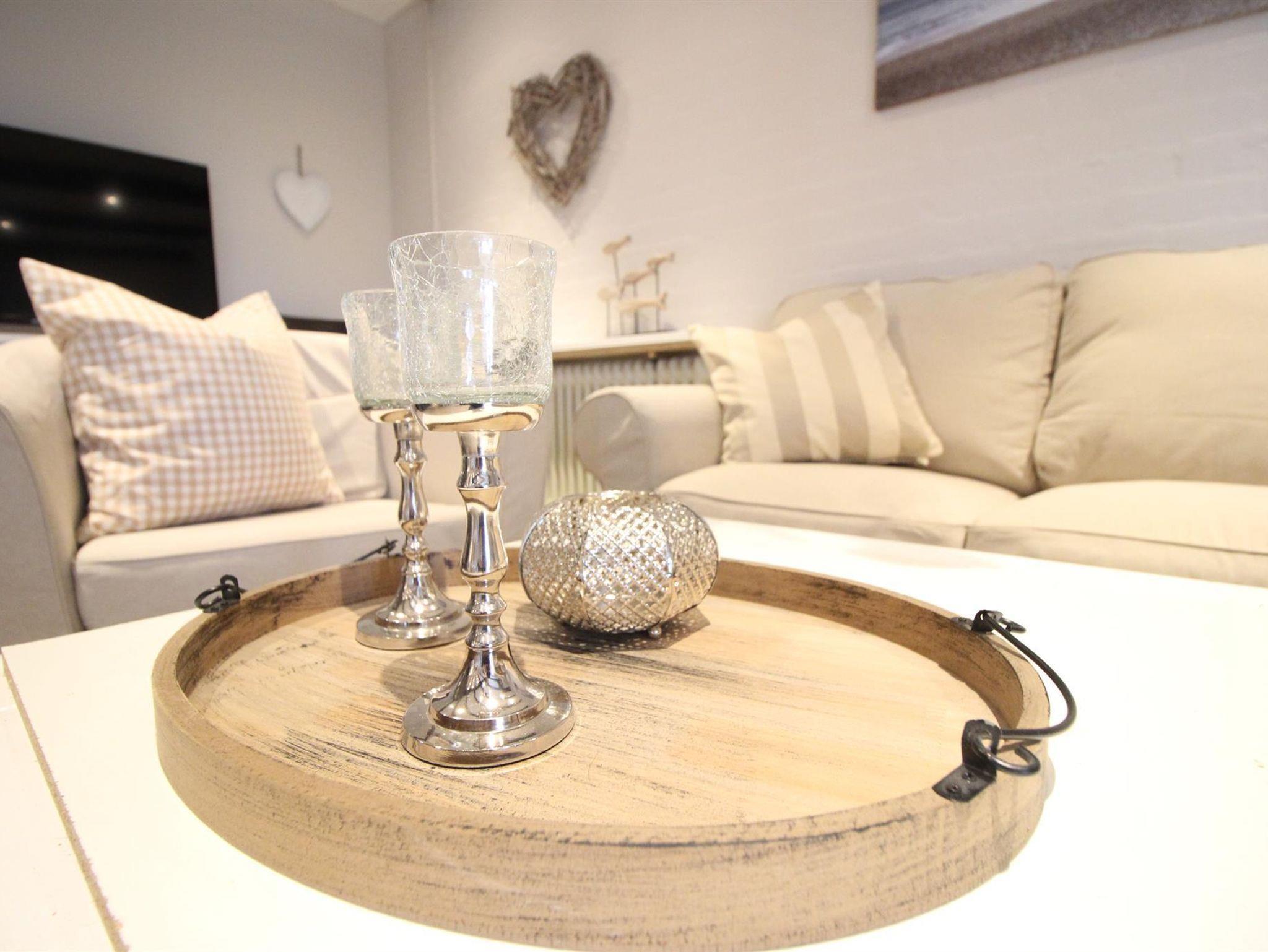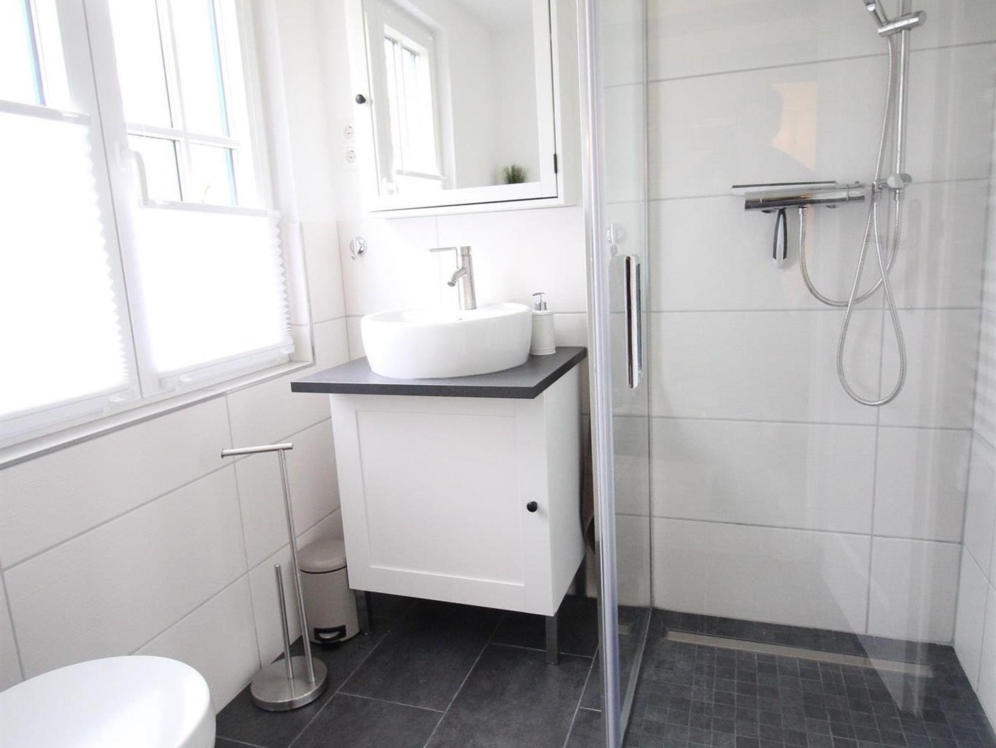 Die gerade renovierte Wohnung besteht im Erdgeschoss aus einem Wohn- und Esszimmer mit integrierter Küche, sowie einem kleineren Schlafzimmer mit ausziehbarem Doppelbett (1,60m, Hemnes). Über die Diele gelangen Sie in das Badezimmer. Vom Wohnzimmer aus haben Sie Zugang auf die Terrasse. Bei dem Kamin handelt es sich um einen Zierkamin.
