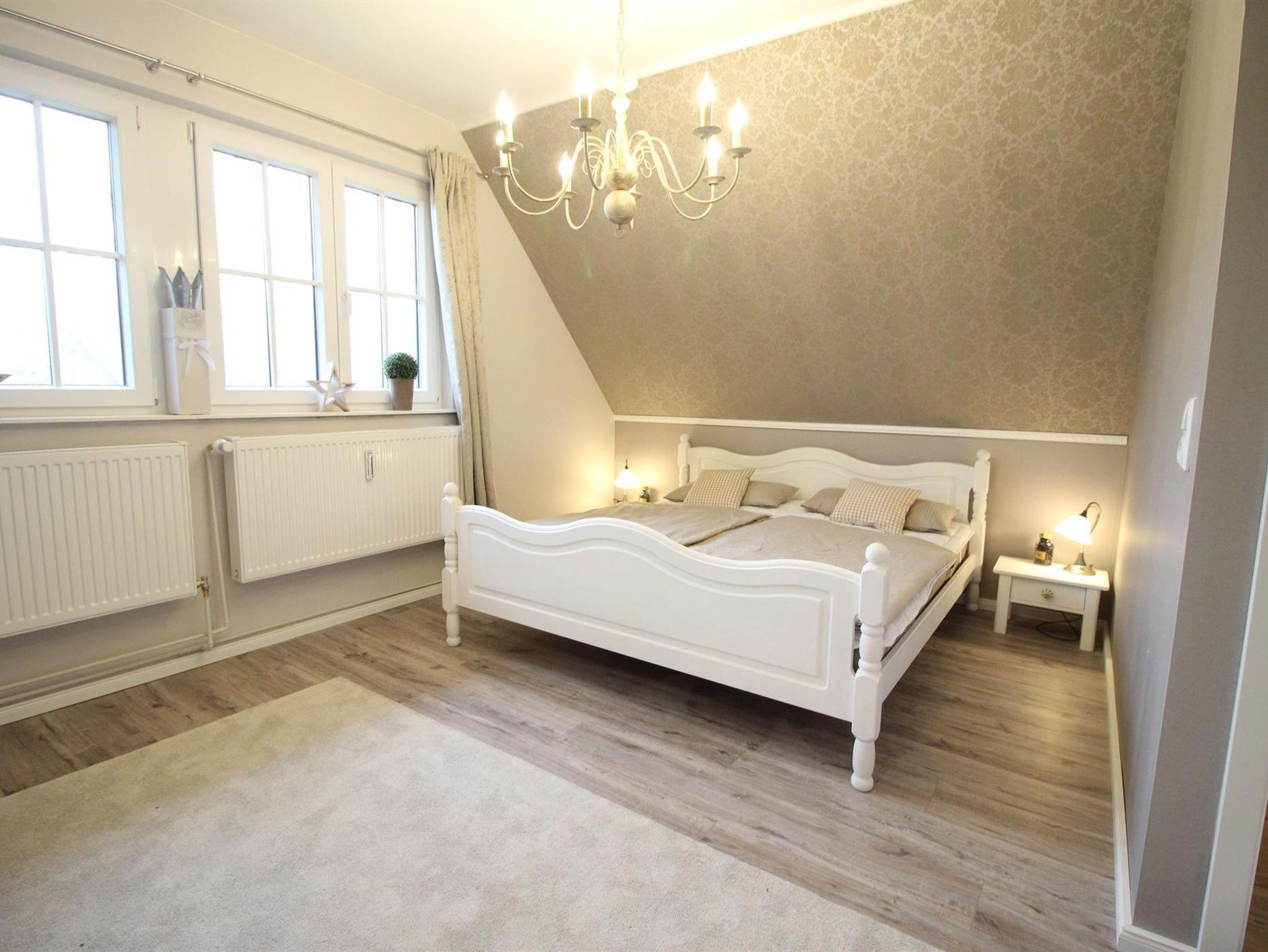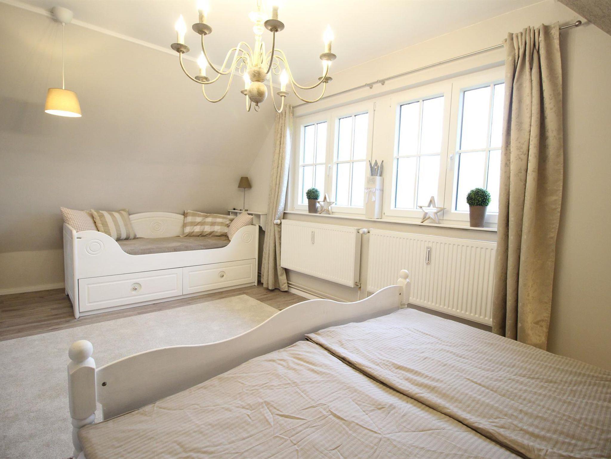 Das großzügige Schlafzimmer im Obergeschoss erreichen Sie über die Treppe im Wohnzimmer. Dieses ist mit einem Doppelbett (1,80 m) und einem Kojenbett (90 cm) ausgestattet.