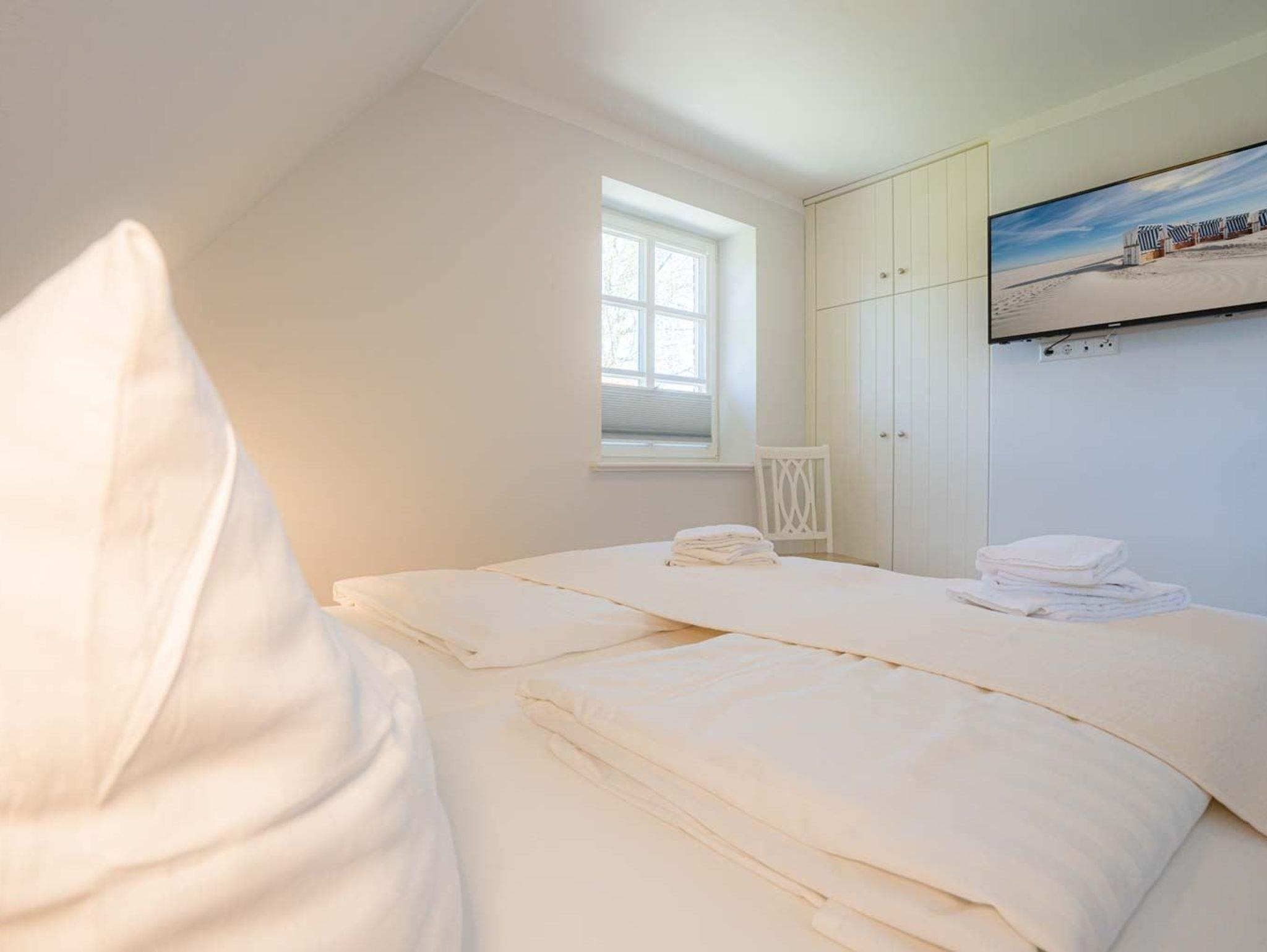 2. Schlafzimmer mit Doppelbett (2x 90x200cm), Einbau-Kleiderschrank, Stuhl und TV.