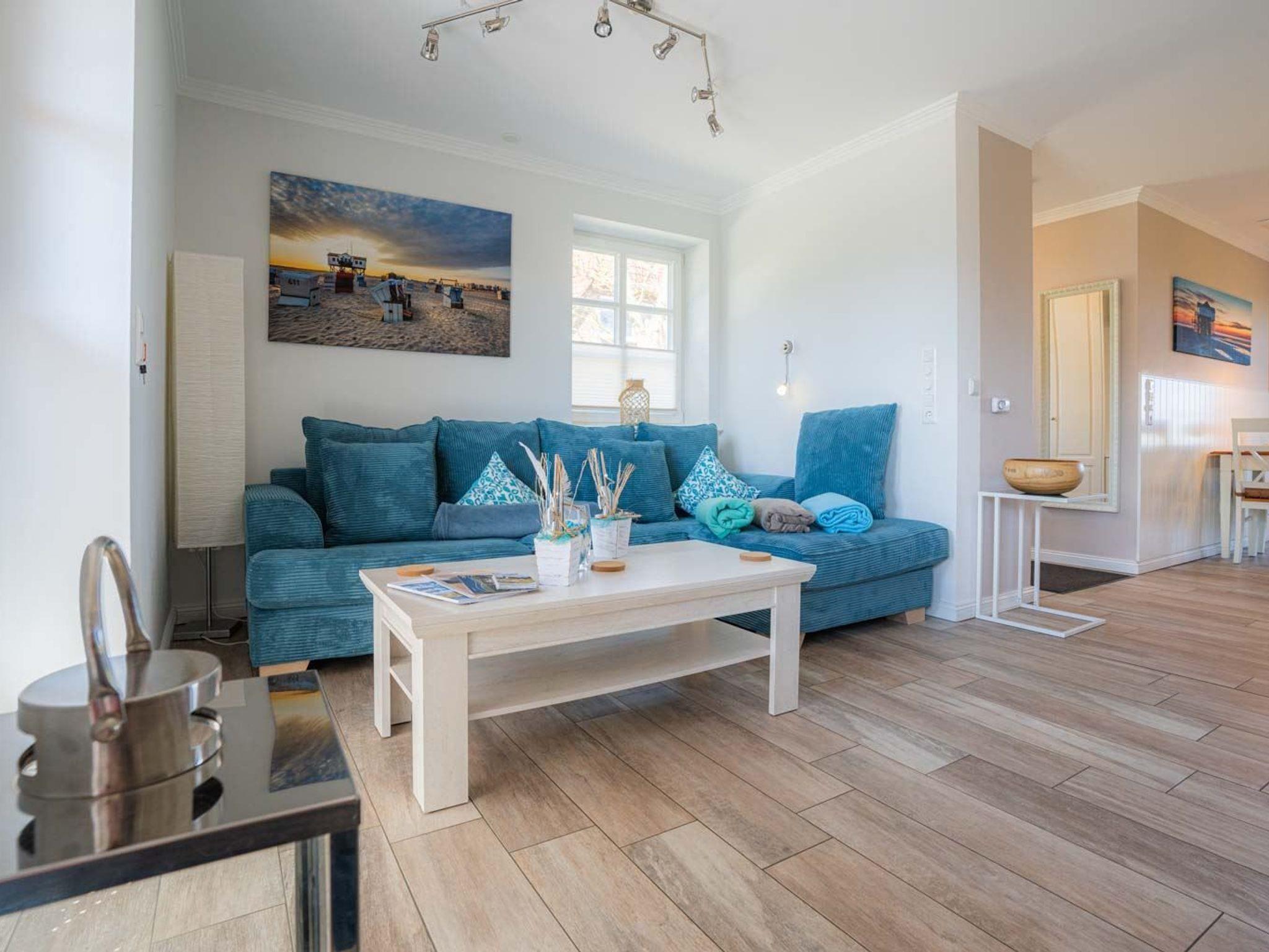 Wohnzimmer mit großem Ecksofa (für 3-5 Personen), 2 Sesseln, großem SMART-TV (Kabel), BluRay-Player, Stereo-Anlage, Kaminofen und direktem Zugang zur sonnigen, möblierten Gartenterrasse nach Südwesten mit Strandkorb (von Ostern bis Oktober).