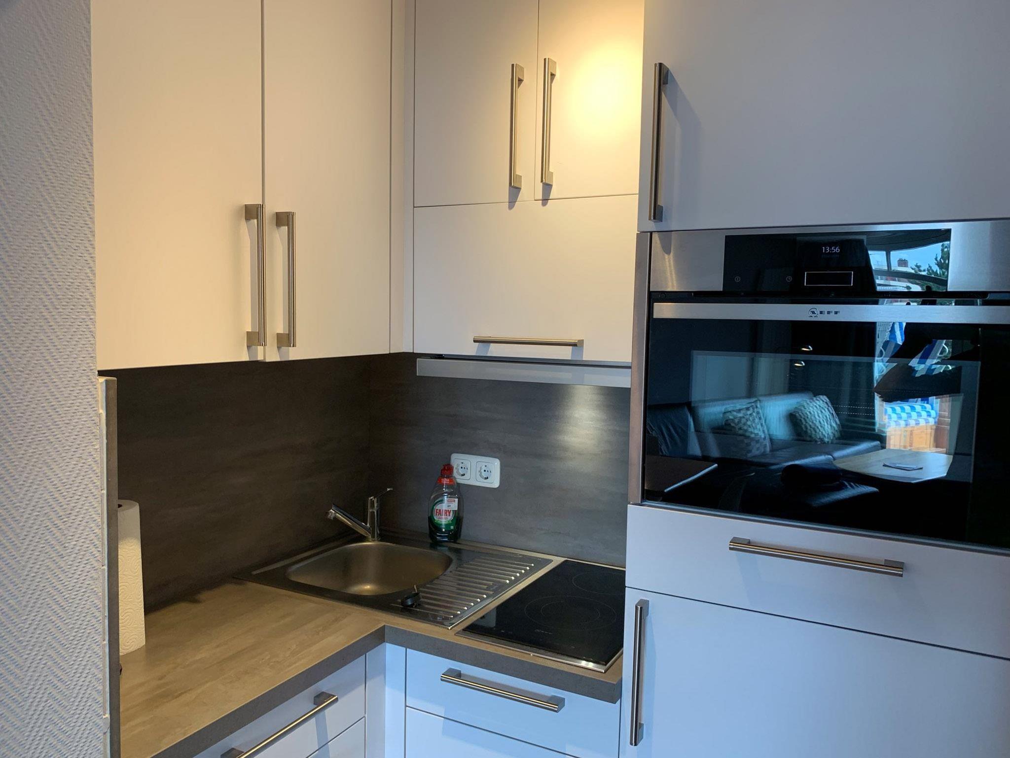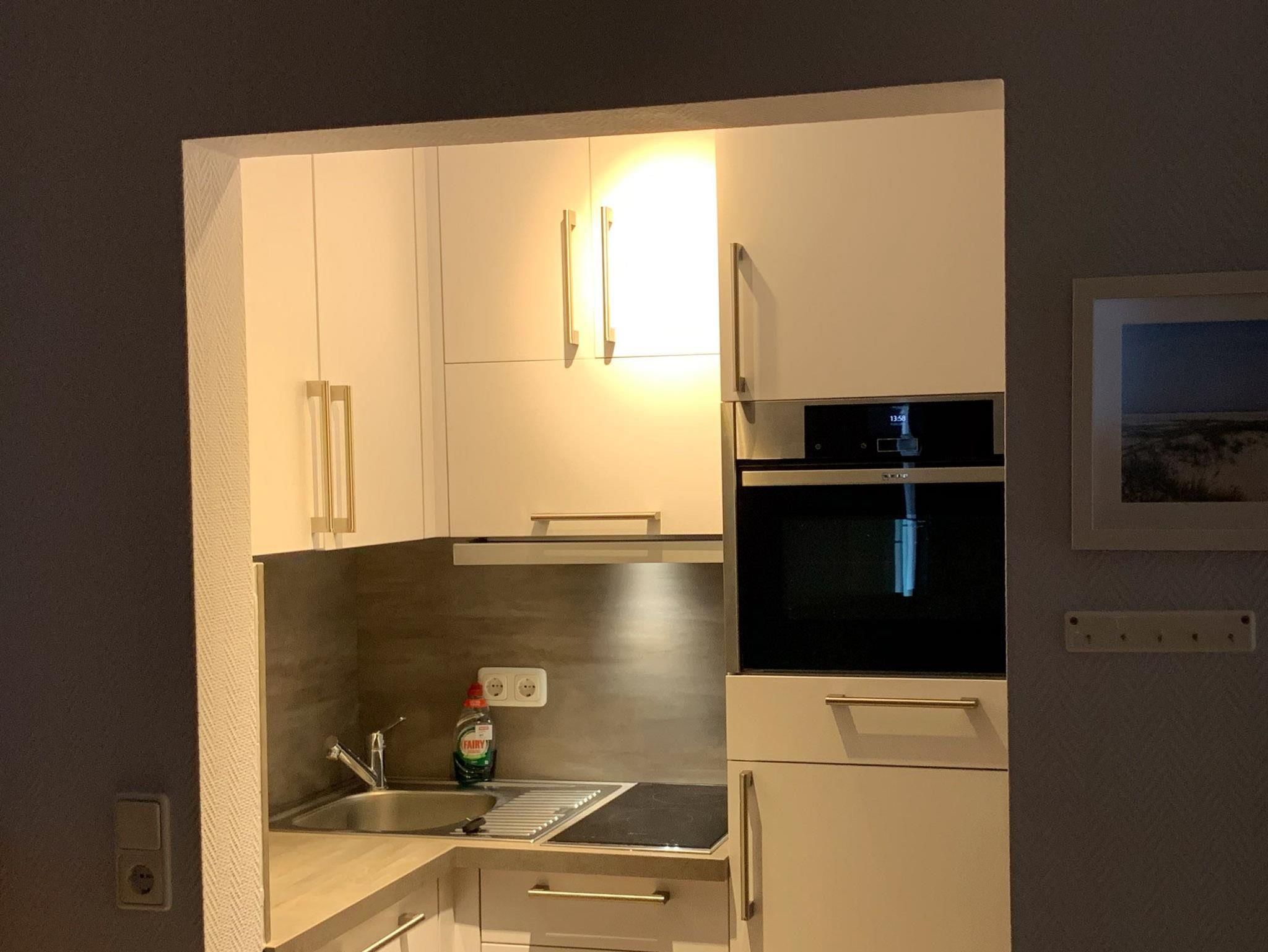 Küche: Einbauküche, Cerankochfeld, Multifunktionsbackofen mit Mikrowelle, Dunstabzug, Geschirrspülmaschine, Kühlschrank mit Gefrierfach, Kaffeemaschine, Toaster, Wasserkocher, Geschirr Kochtöpfe, etc.