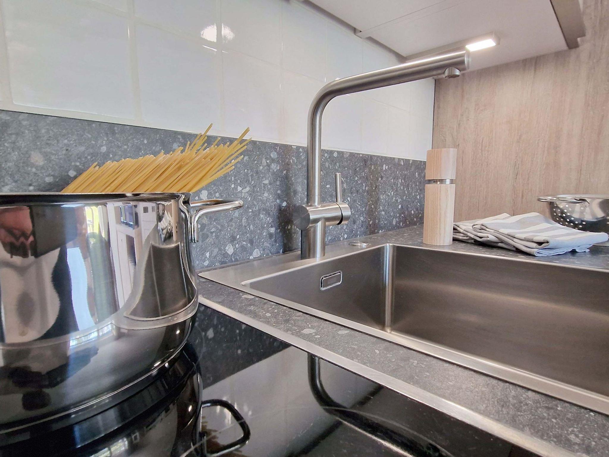 Hochwertige Küchenzeile: Bereiten Sie Ihre Mahlzeiten in der gut ausgestatteten Küchenzeile mit Geschirrspüler zu, die Ihnen den Komfort von Zuhause bietet.