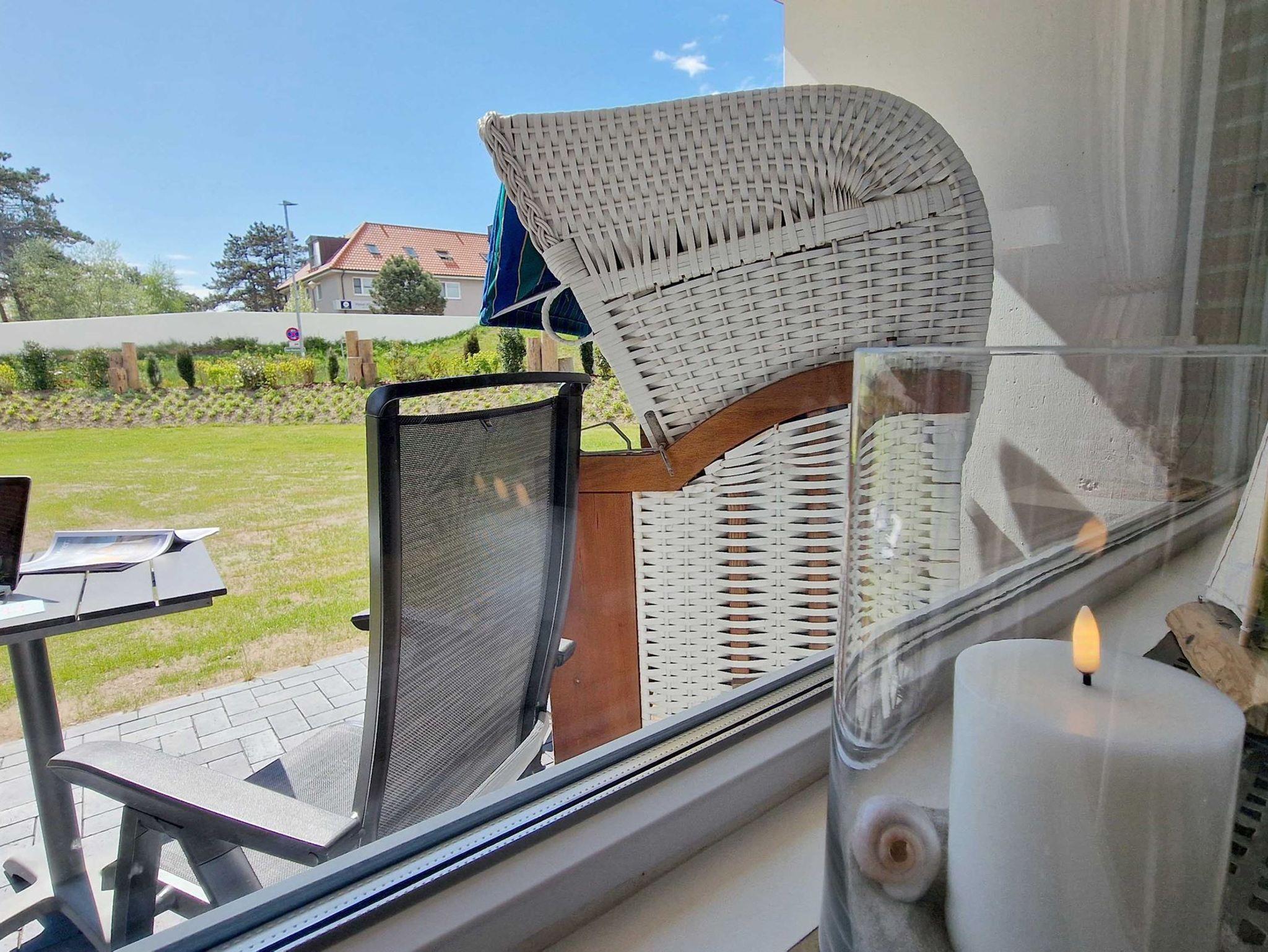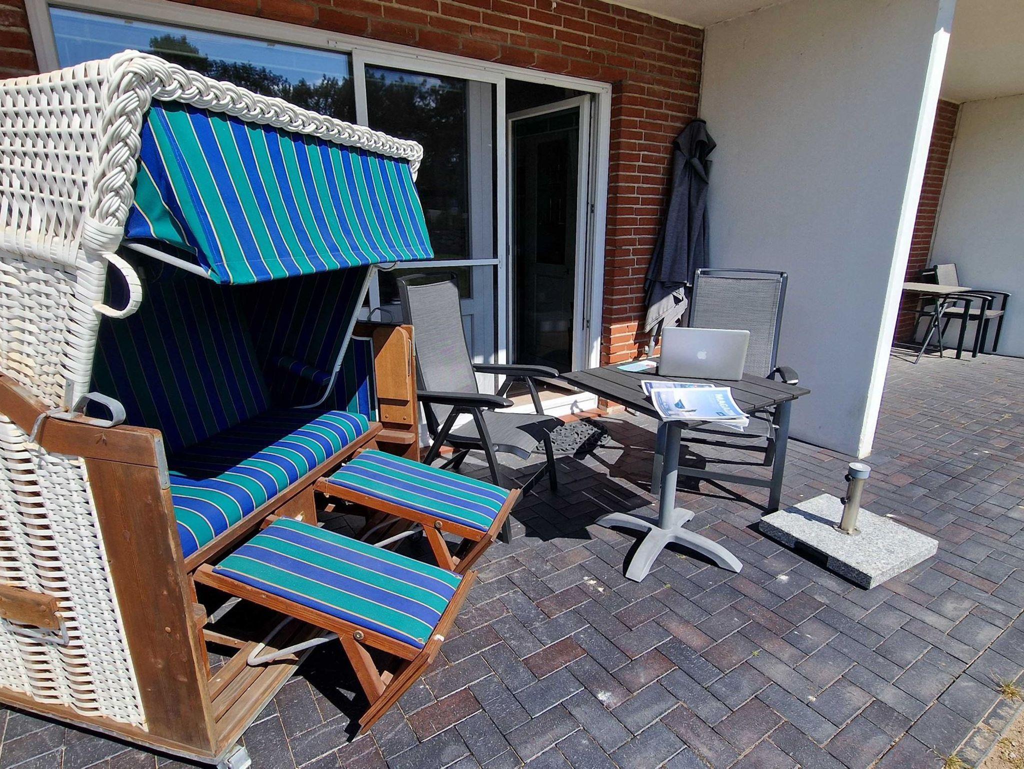 Überdachte Terrasse: Auf der großzügigen Terrasse erwartet Sie ein komfortabler Strandkorb, in dem Sie mit Blick auf den Deich die Seele baumeln lassen und entspannen können.
