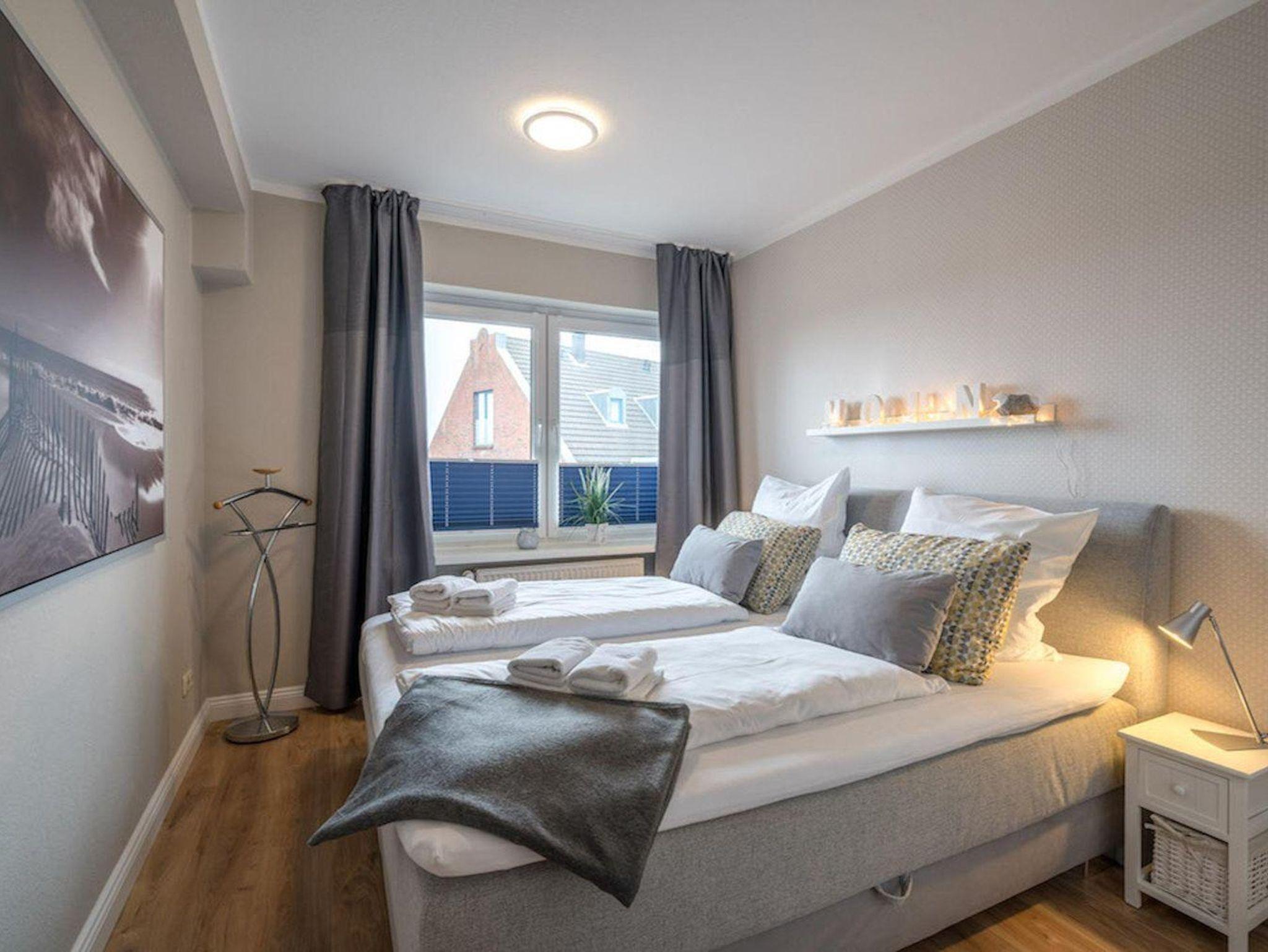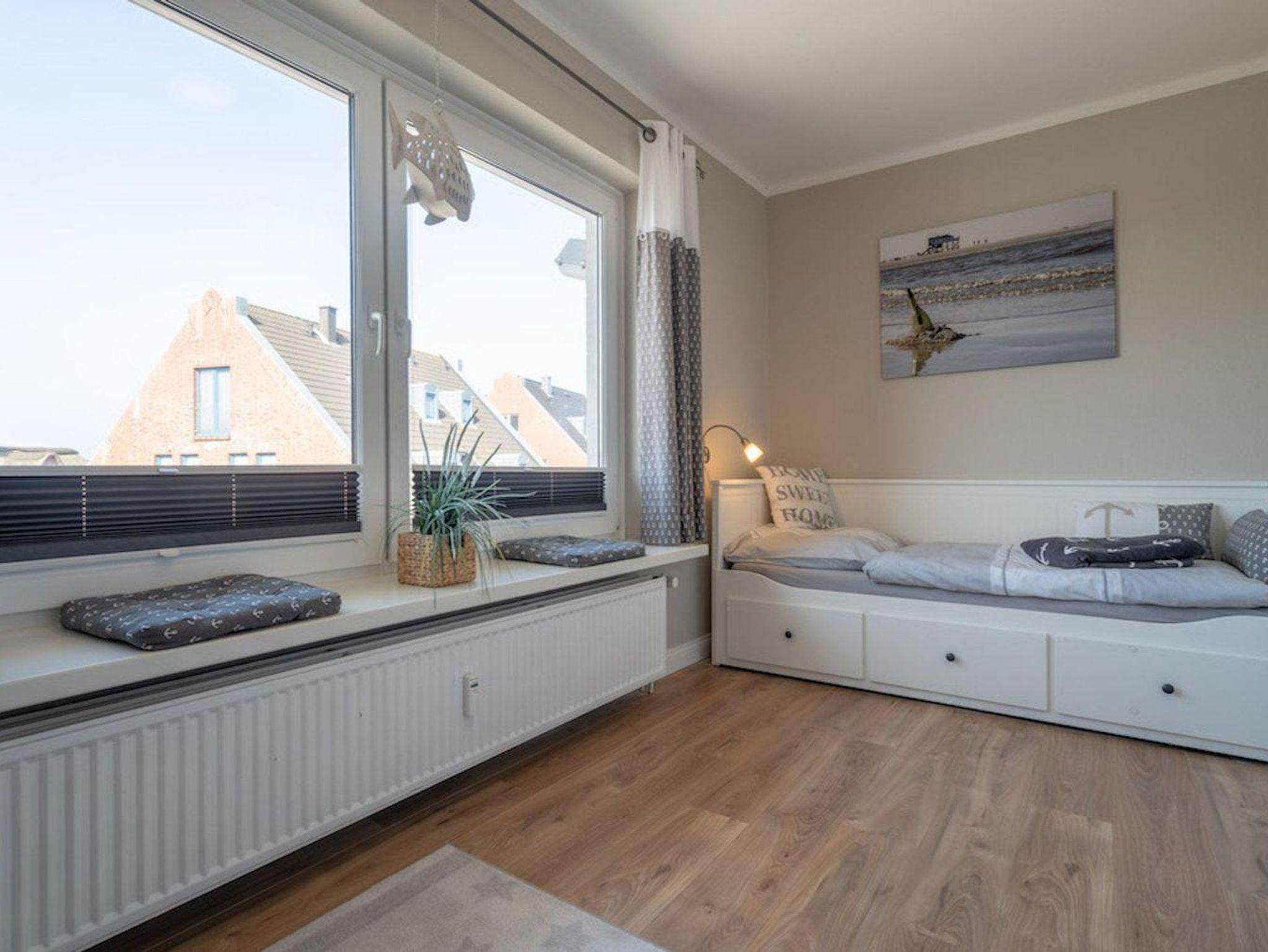 Das modernisierte Appartement bietet Platz für 4-6 Personen auf ca. 62qm und hat einen wunderbaren Ausblick auf den Deich mit der Strandüberfahrt. Der Wohnbereich der Ferienwohnung verfügt über eine Couch mit Couchtisch sowie zwei Sesseln. Des weiteren ist ein großer Esstisch mit 6 Stühlen vorhanden. Vom Wohnbereich gelangen Sie auf den Balkon der ebenfalls mit einem Tisch und 6 Stühlen ausgestattet ist. Die Küchenzeile verfügt über einen Herd mit Ceranfeld und Backofen, Dunstabzugshaube, Geschirr, Spülmaschine, Kaffeemaschine, Kochtöpfe, Kühlschrank, Toaster und einem Wasserkocher. Das erste Schlafzimmer ist ausgestattet mit einem Doppelbett (2,00 x 1,80 m) einem TV und 2 Nachttischen sowie einem Kleiderschrank.